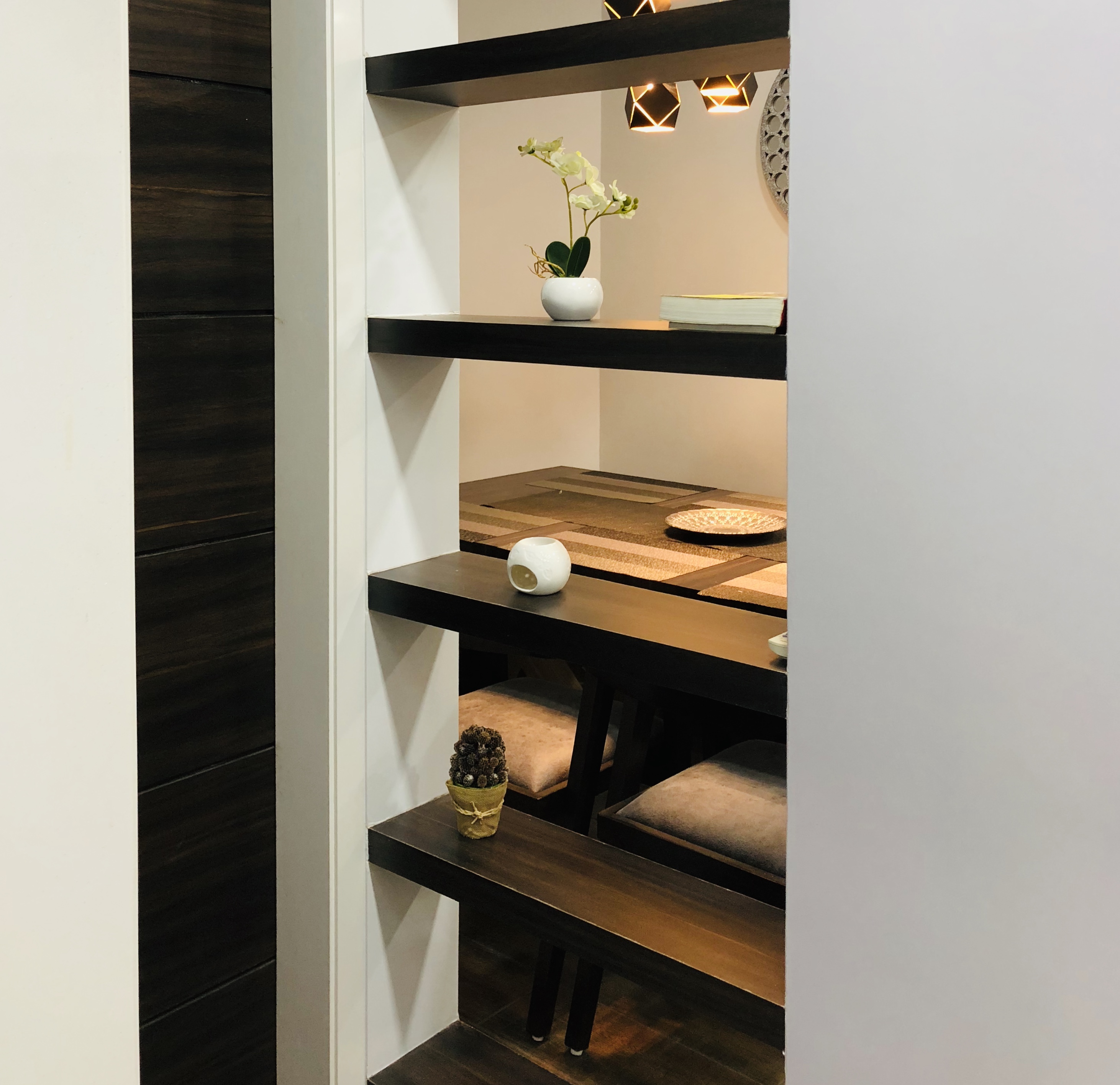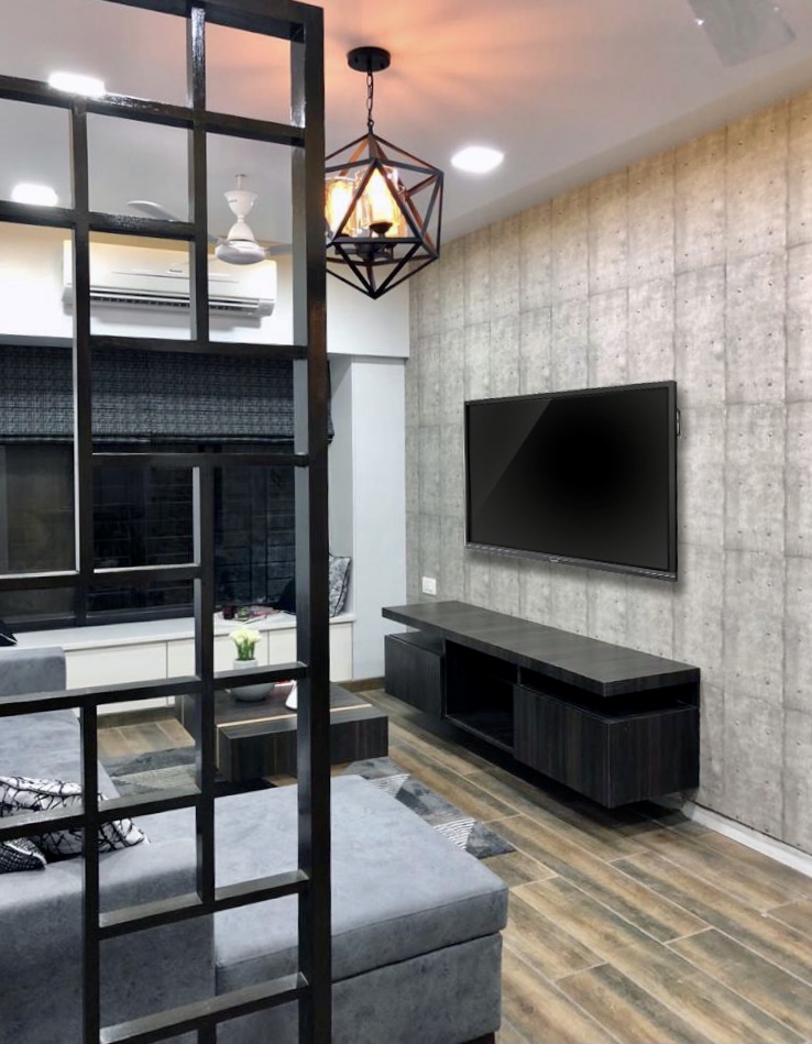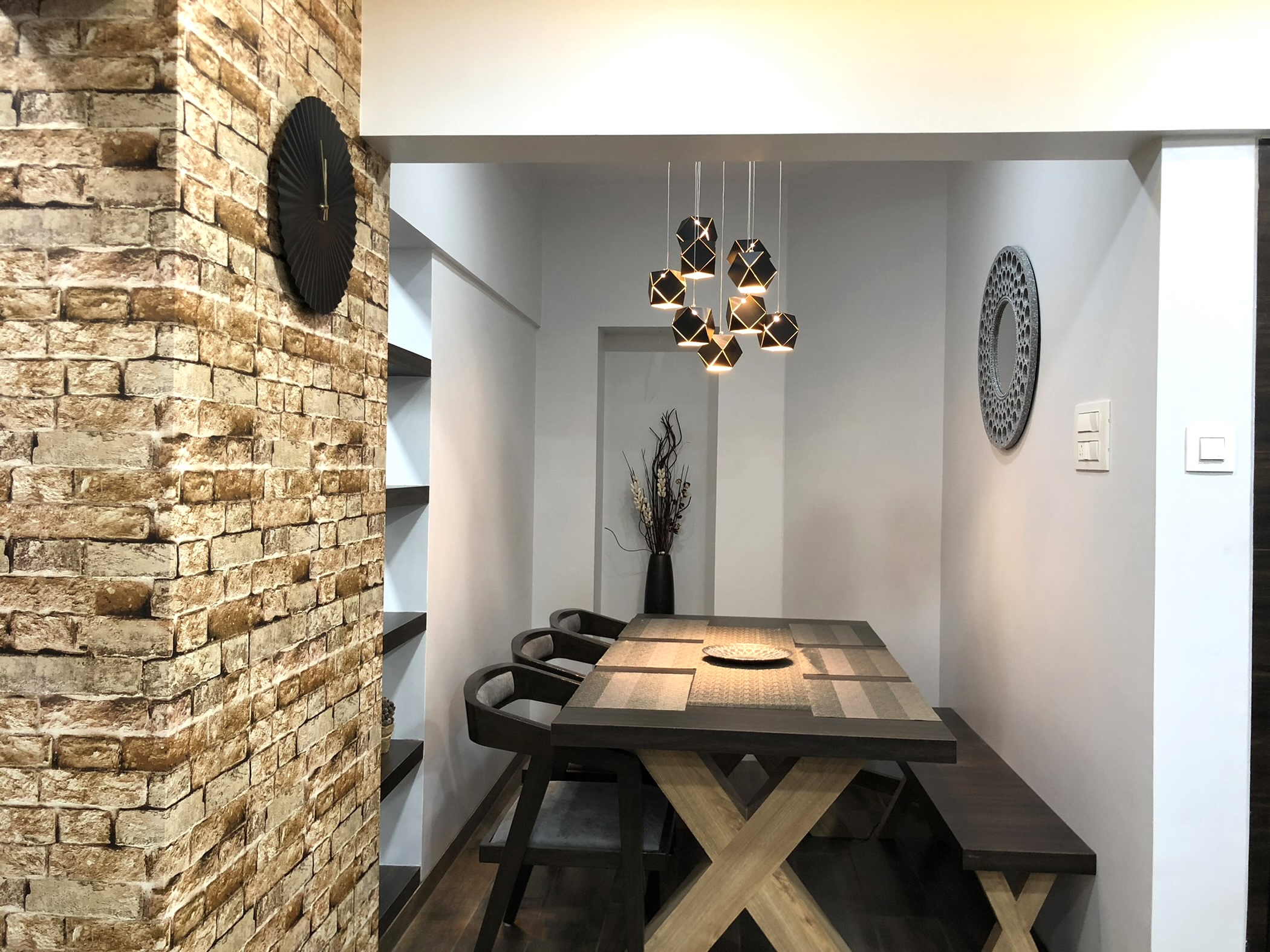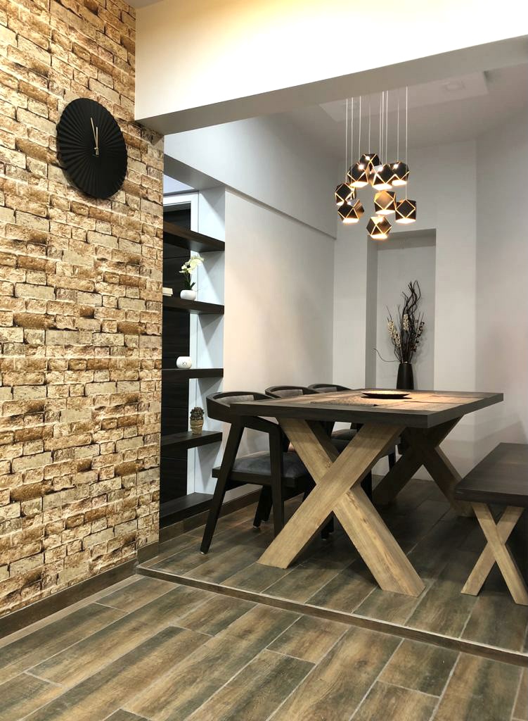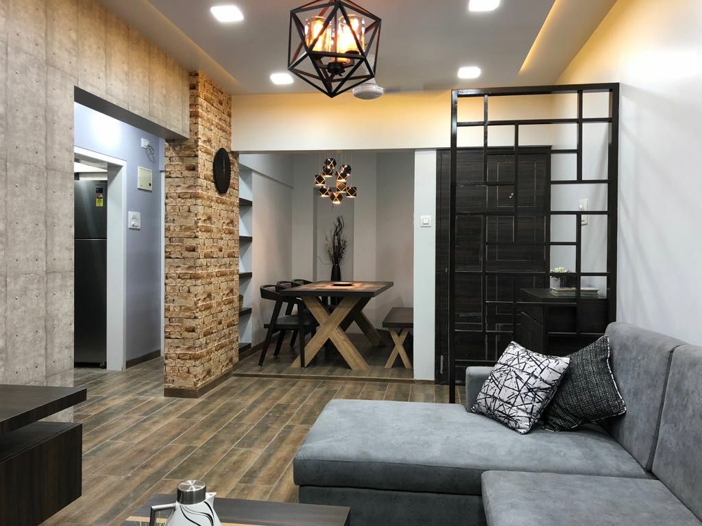 A small apartment with a contemporary rustic look, monochromatic scheme and natural materials like wood, concrete and brick that dictate the look of this house, make it a chic residence. A black and white colour palette of furnishings keeps the minimalist look intact in the living room and bedrooms get colour through subtle shades on walls and furnishings. A dining alcove forms the highlight in this house which is an extension of the living area.