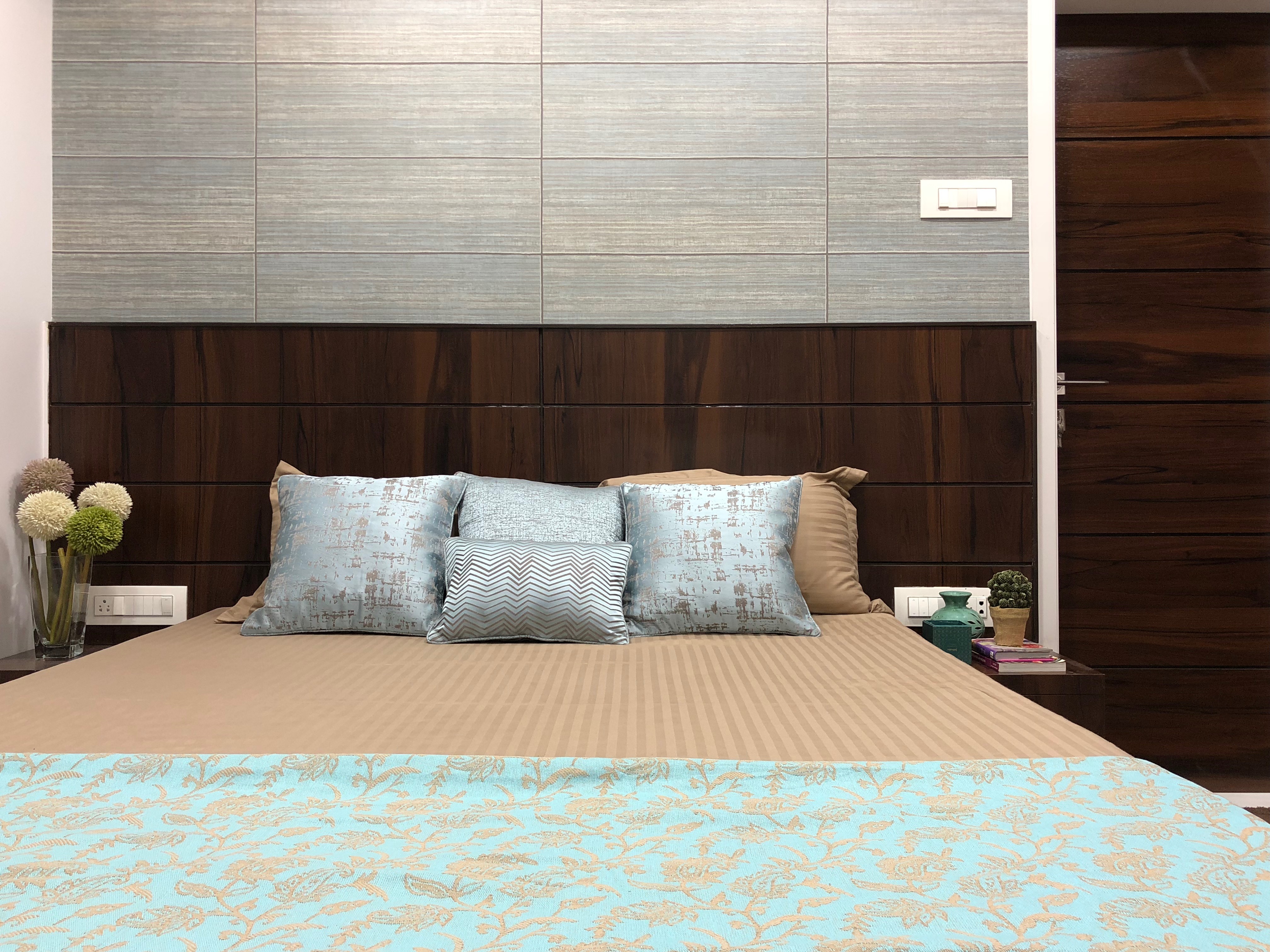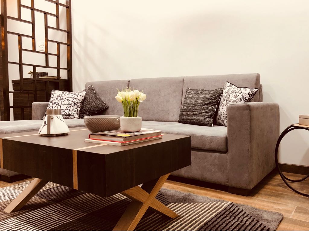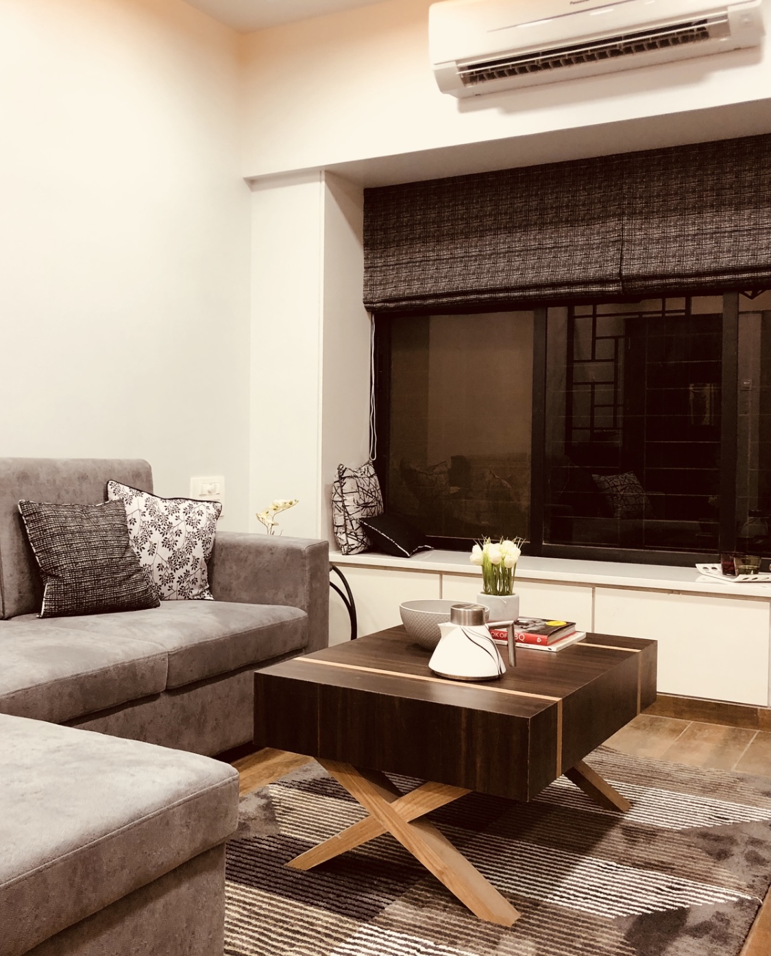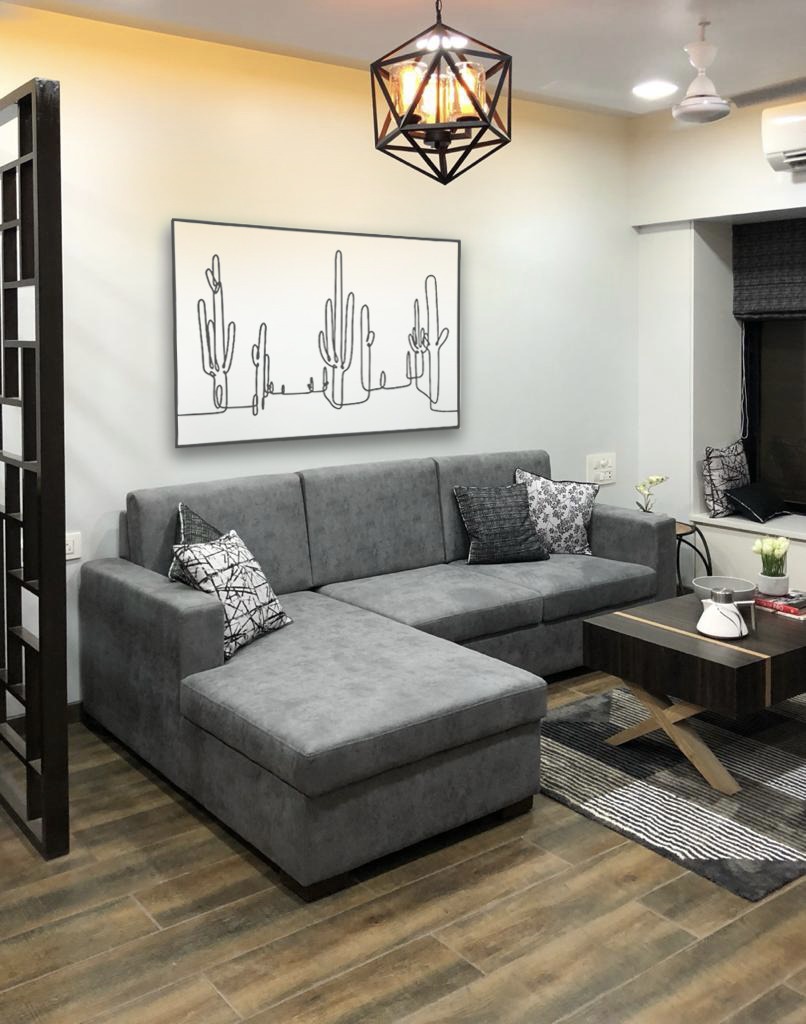 A small apartment with a contemporary rustic look, monochromatic scheme and natural materials like wood, concrete and brick that dictate the look of this house, make it a chic residence. A black and white colour palette of furnishings keeps the minimalist look intact in the living room and bedrooms get colour through subtle shades on walls and furnishings. A dining alcove forms the highlight in this house which is an extension of the living area.