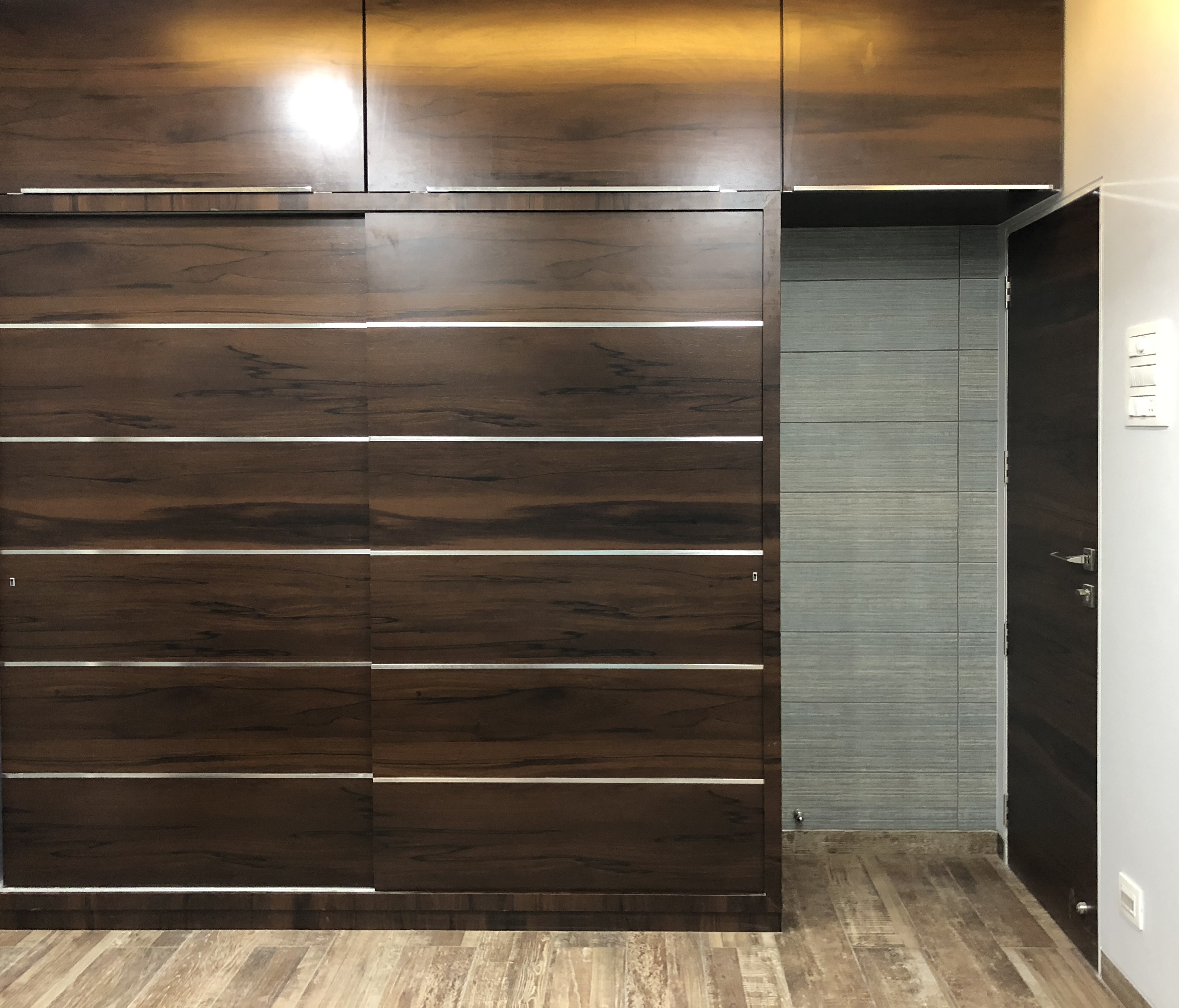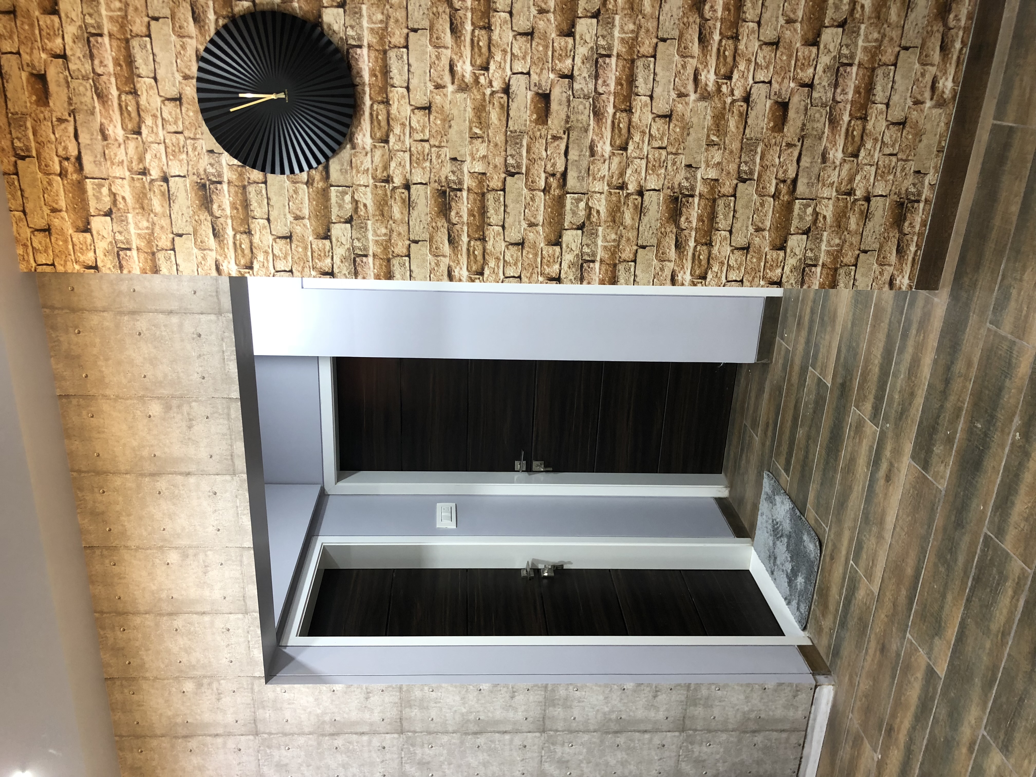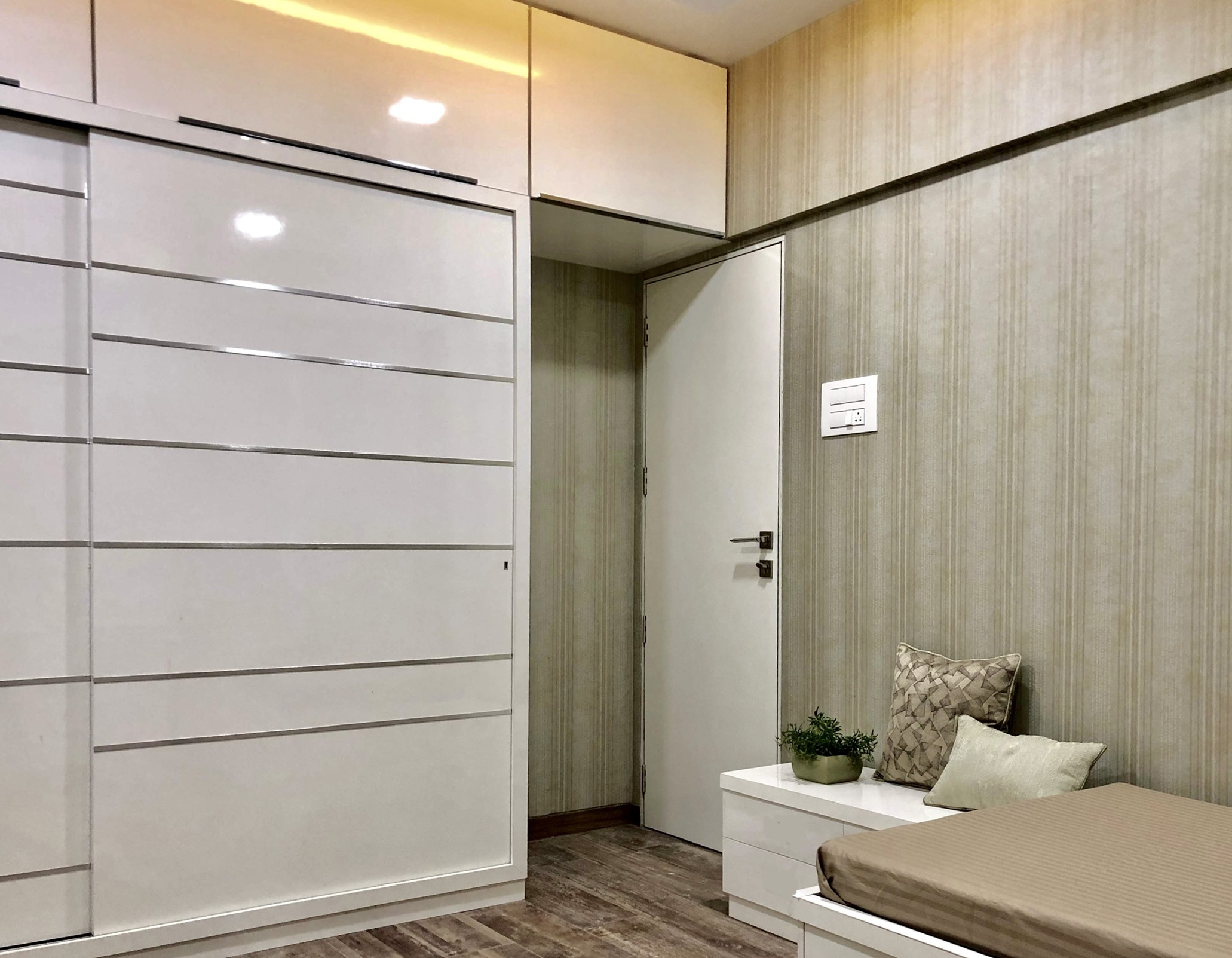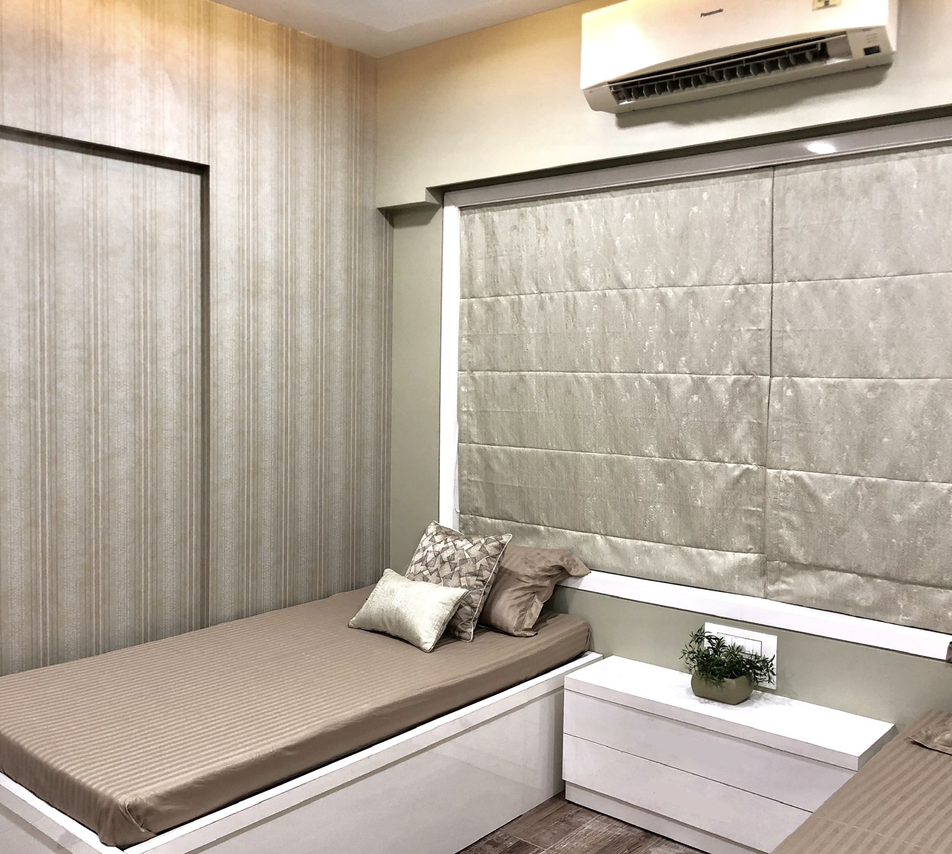 A small apartment with a contemporary rustic look, monochromatic scheme and natural materials like wood, concrete and brick that dictate the look of this house, make it a chic residence. A black and white colour palette of furnishings keeps the minimalist look intact in the living room and bedrooms get colour through subtle shades on walls and furnishings. A dining alcove forms the highlight in this house which is an extension of the living area.