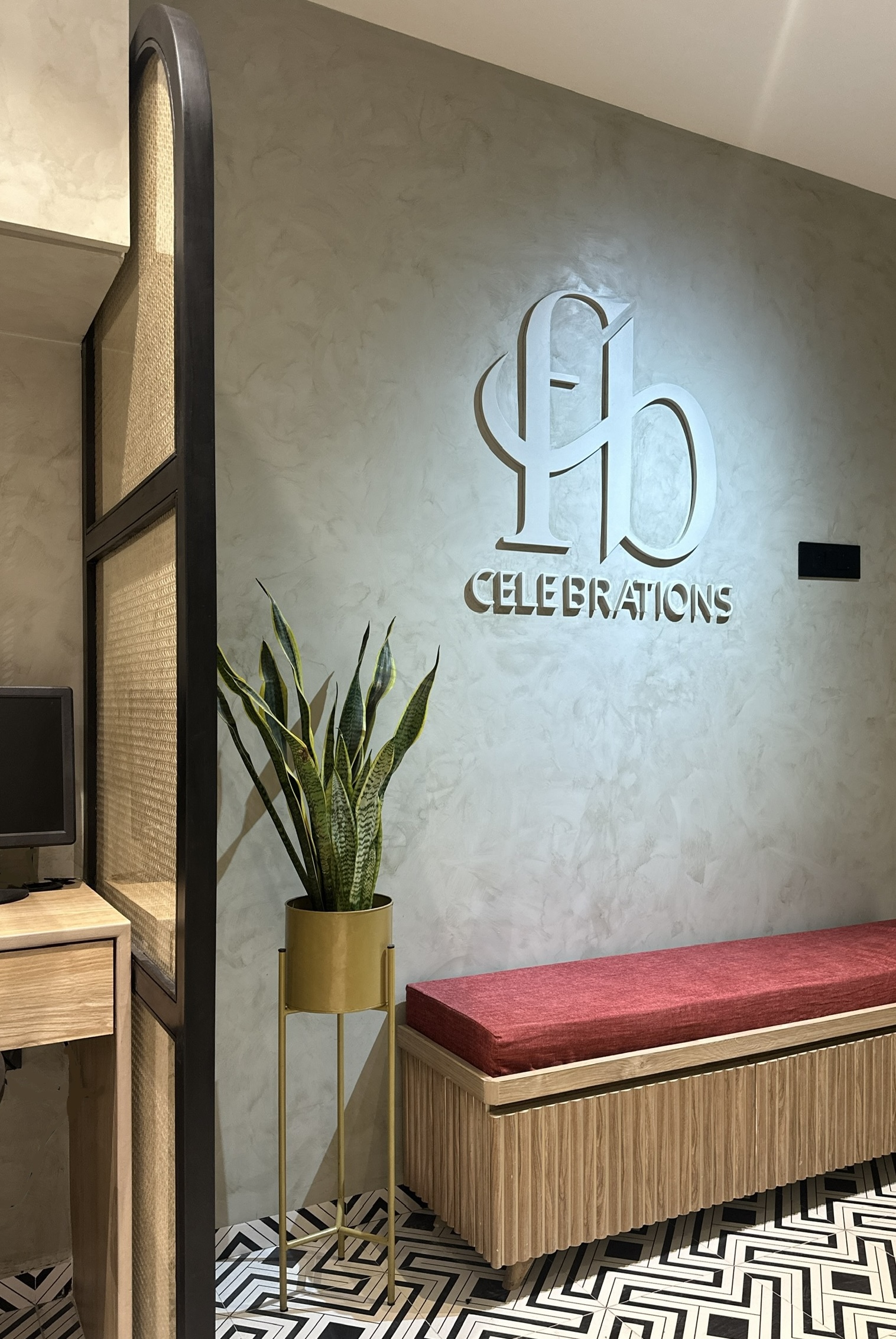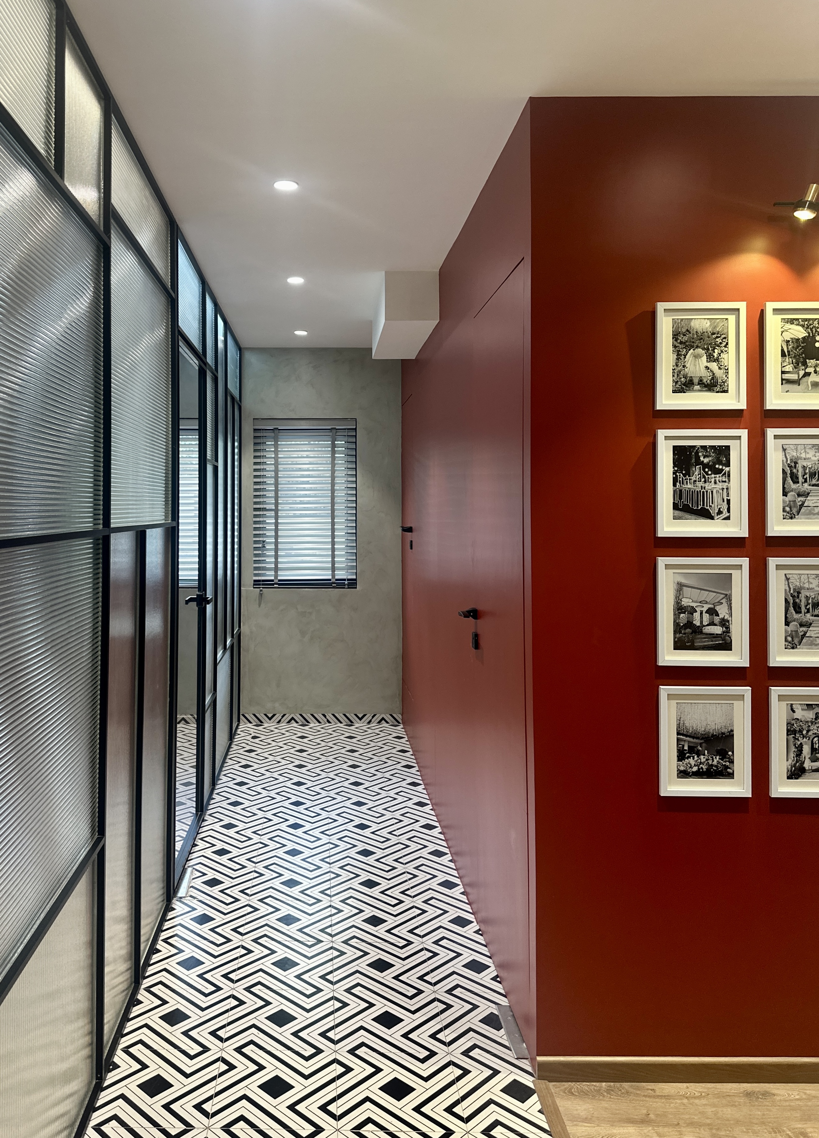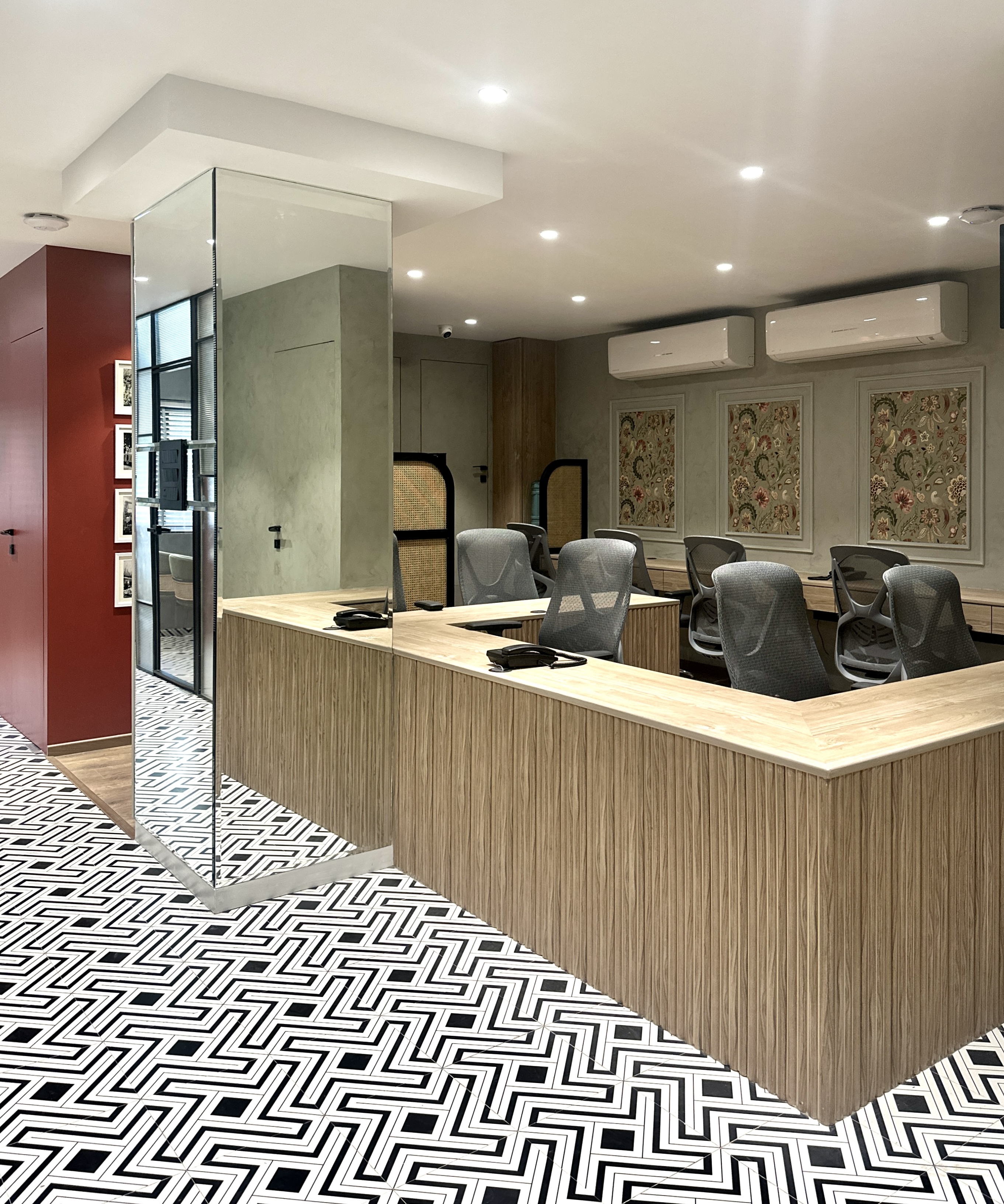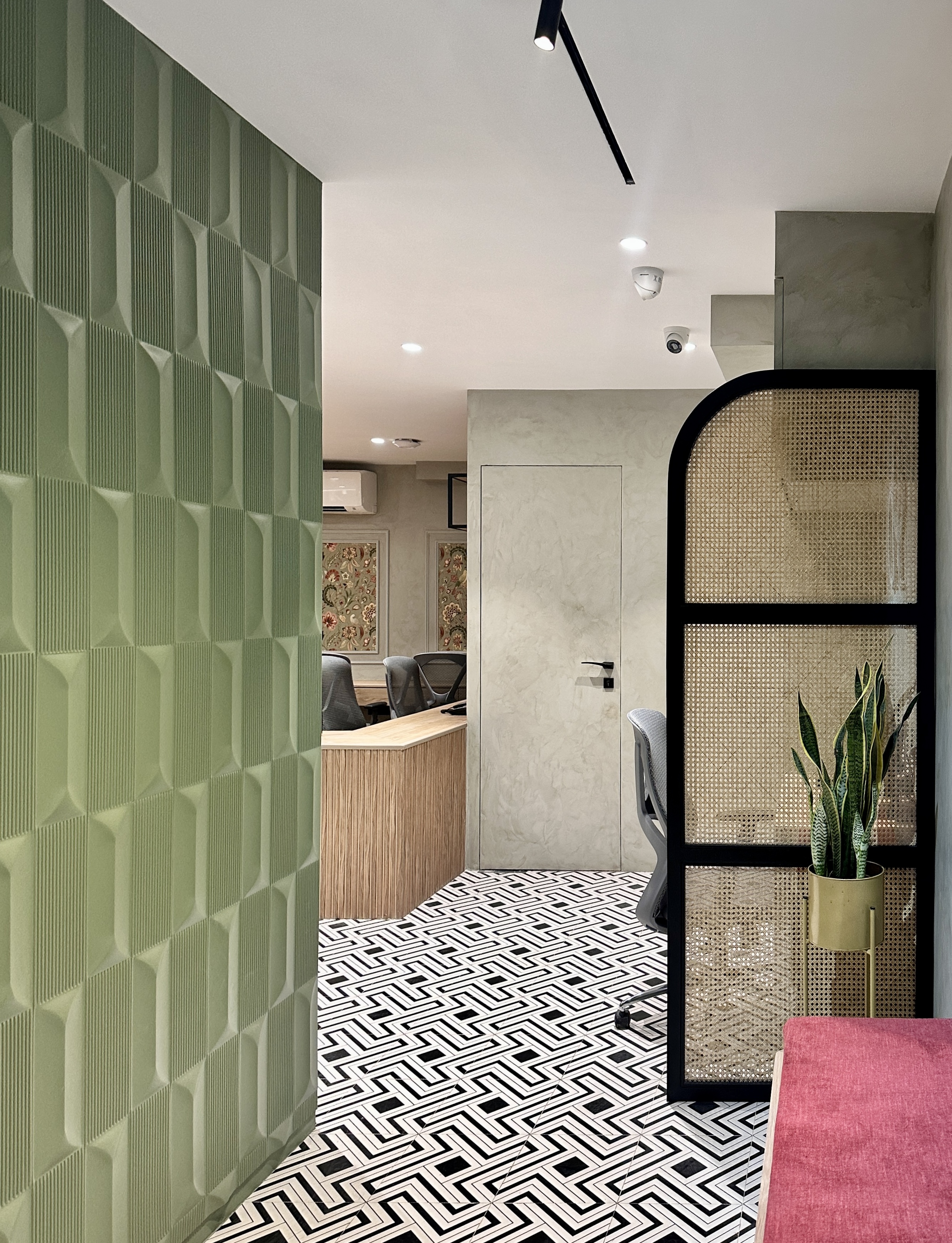 Located at Nariman Point, Mumbai, this office was designed with the aim of creating a space that reflects the nature of work of the client. FB Celebrations Pvt. Ltd., an event management company, curates magical experiences and high-end events, decorating and dazzling each one with a personalized touch. So, we included colourful florals balanced harmoniously with sophisticated minimalism, mirroring perfectly the essence of the company. A fusion of art deco and contemporary minimalism, the office welcomes one with a hallway boasting a myriad of textures and patterns on the walls and floor. The grey limewash paint in combination with sage green patterned wall and retro black and white flooring is a cohesive and inviting blend. These muted, monochromatic tones are skilfully interspersed by the contrast of red and green. The logo lies against the backdrop of the waiting area, forming the focal point.