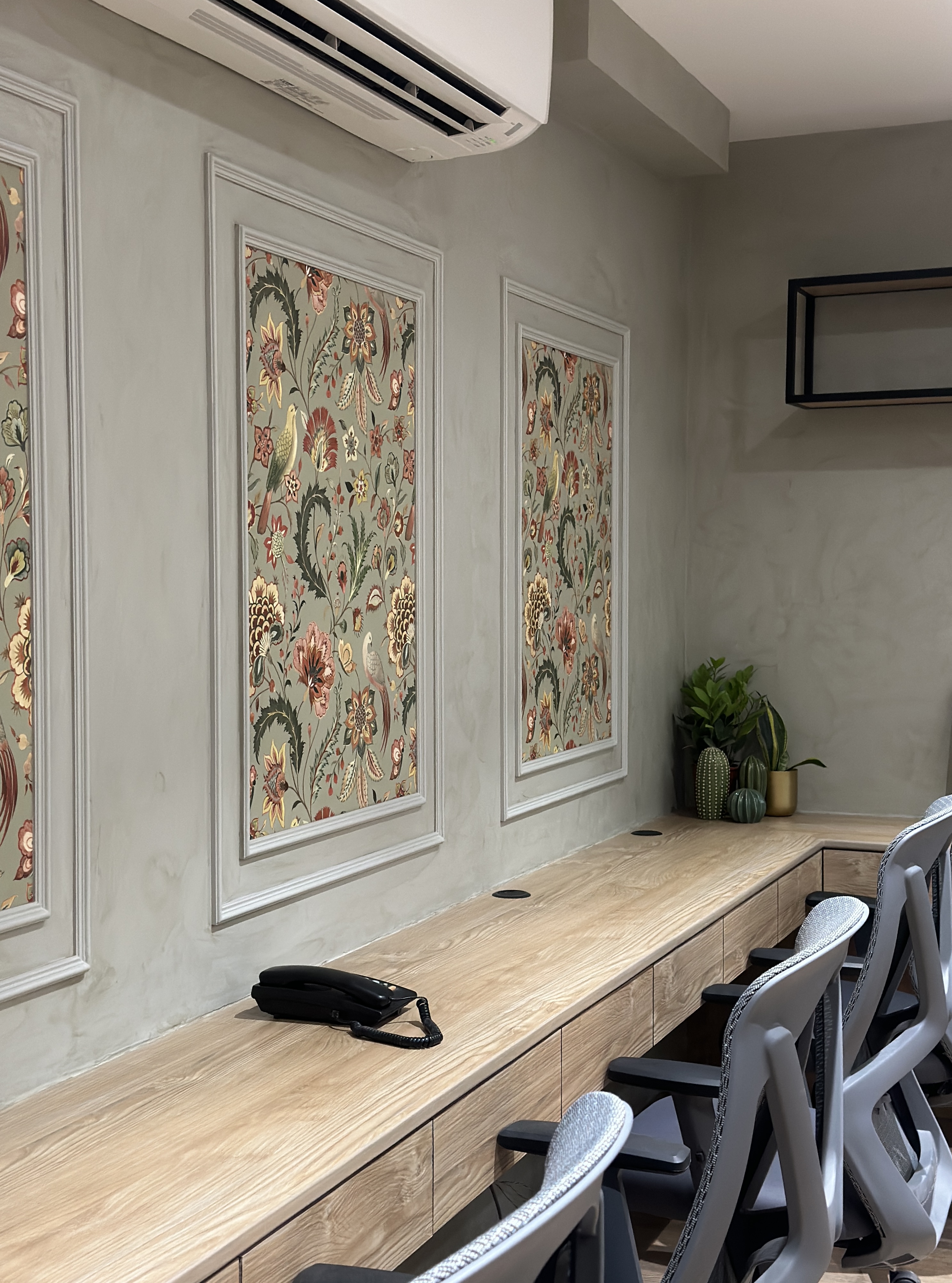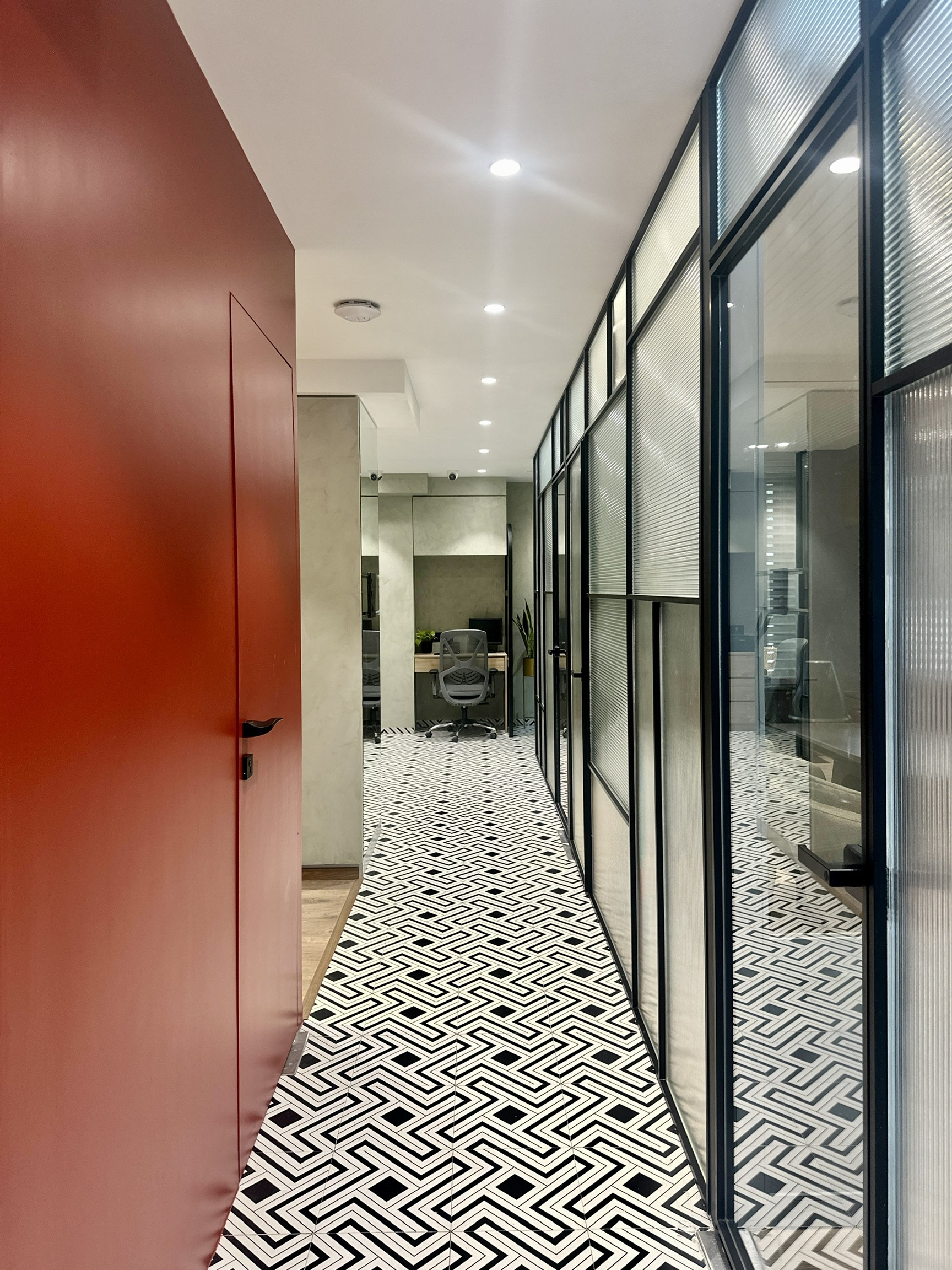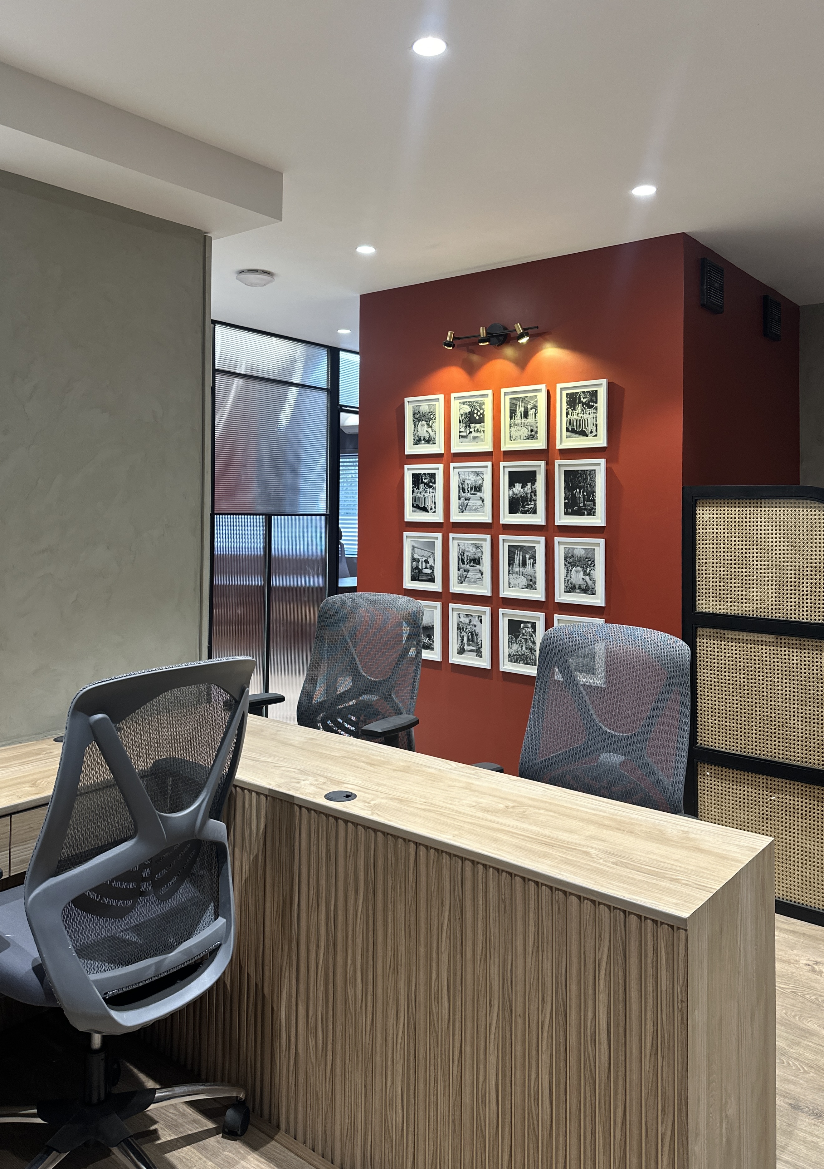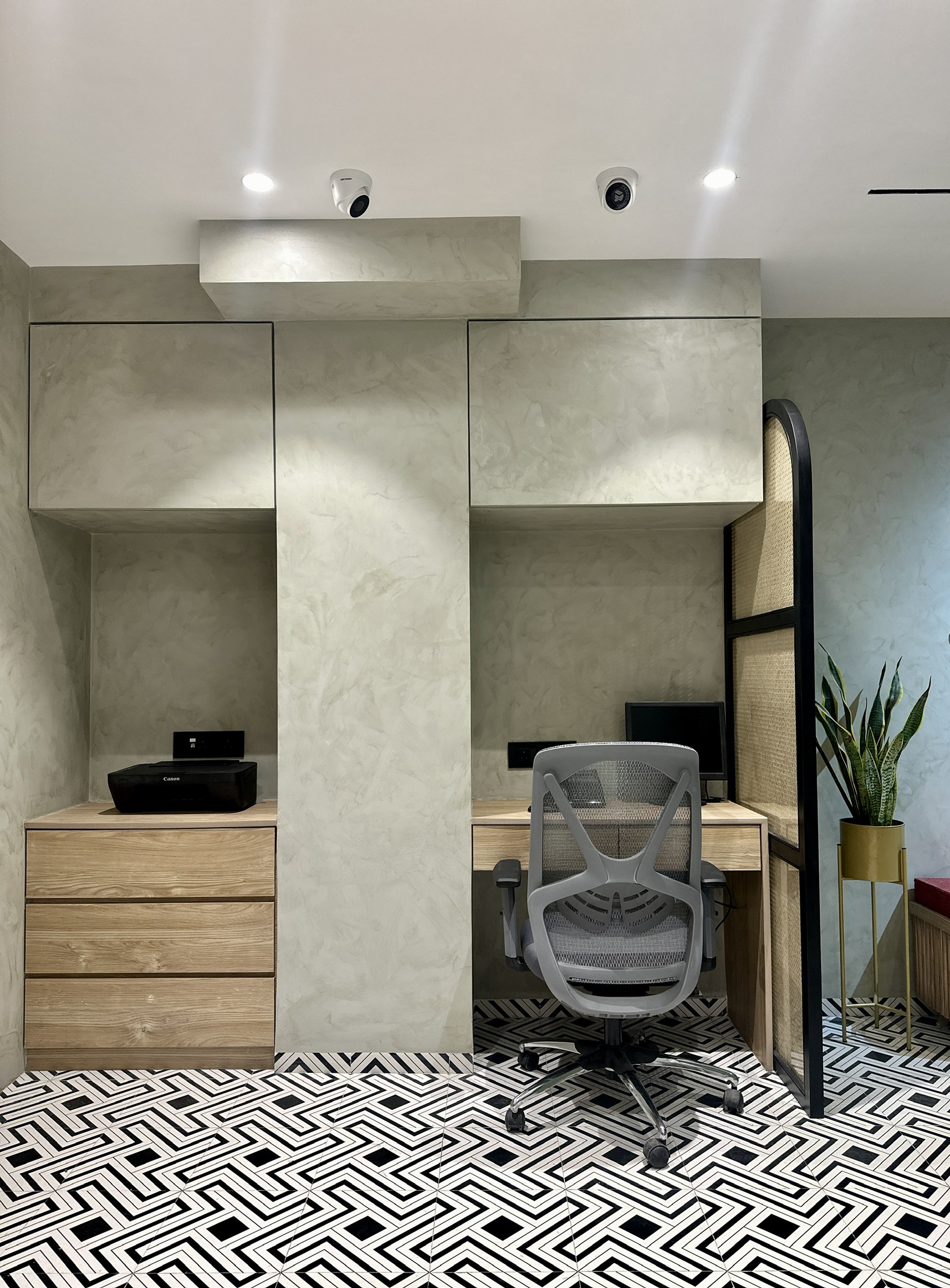 Located at Nariman Point, Mumbai, this office was designed with the aim of creating a space that reflects the nature of work of the client. FB Celebrations Pvt. Ltd., an event management company, curates magical experiences and high-end events, decorating and dazzling each one with a personalized touch. So, we included colourful florals balanced harmoniously with sophisticated minimalism, mirroring perfectly the essence of the company. A fusion of art deco and contemporary minimalism, the office welcomes one with a hallway boasting a myriad of textures and patterns on the walls and floor. The grey limewash paint in combination with sage green patterned wall and retro black and white flooring is a cohesive and inviting blend. These muted, monochromatic tones are skilfully interspersed by the contrast of red and green. The logo lies against the backdrop of the waiting area, forming the focal point.