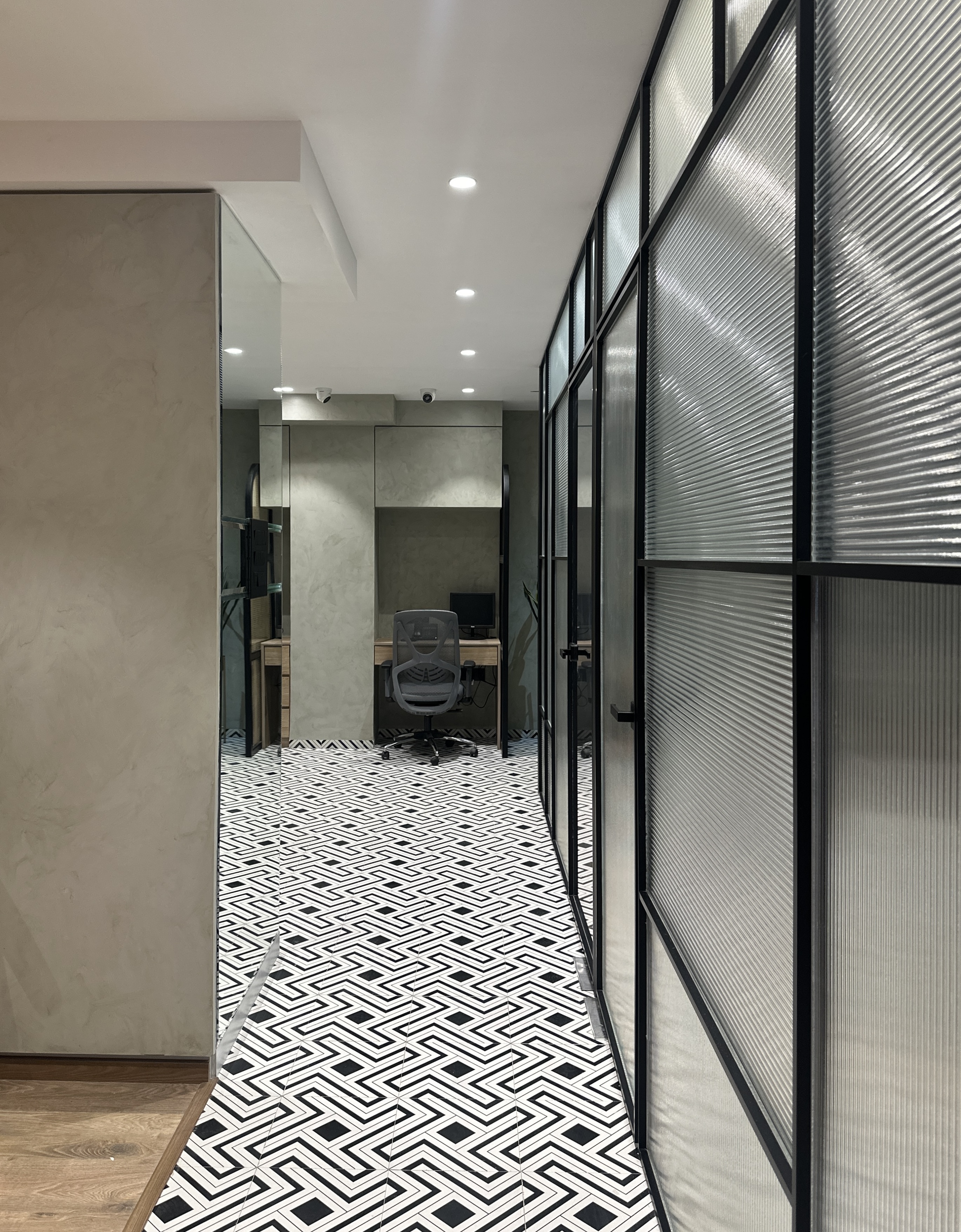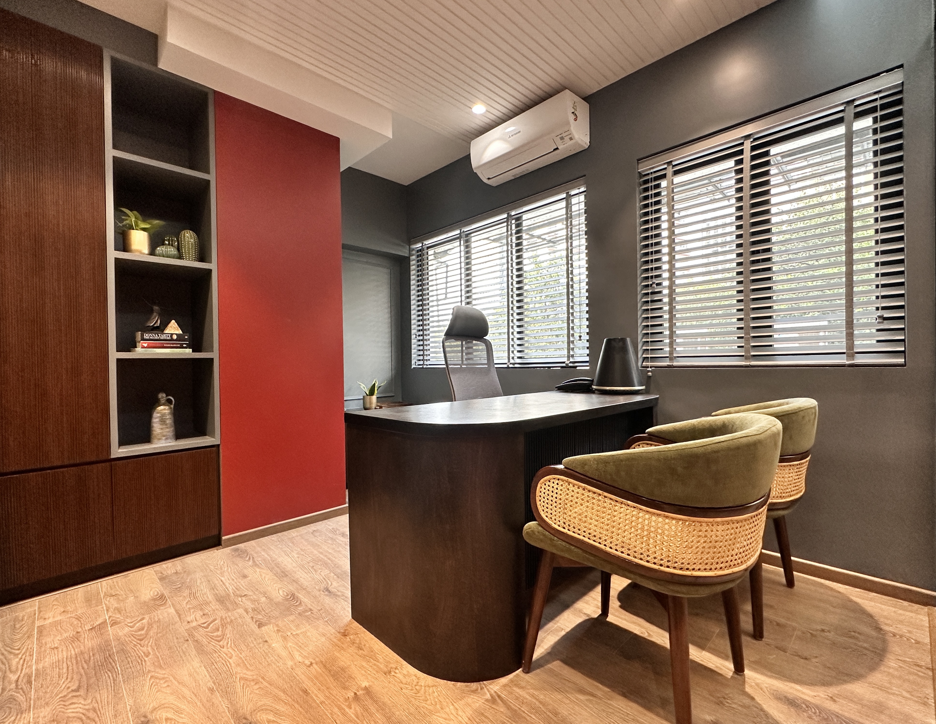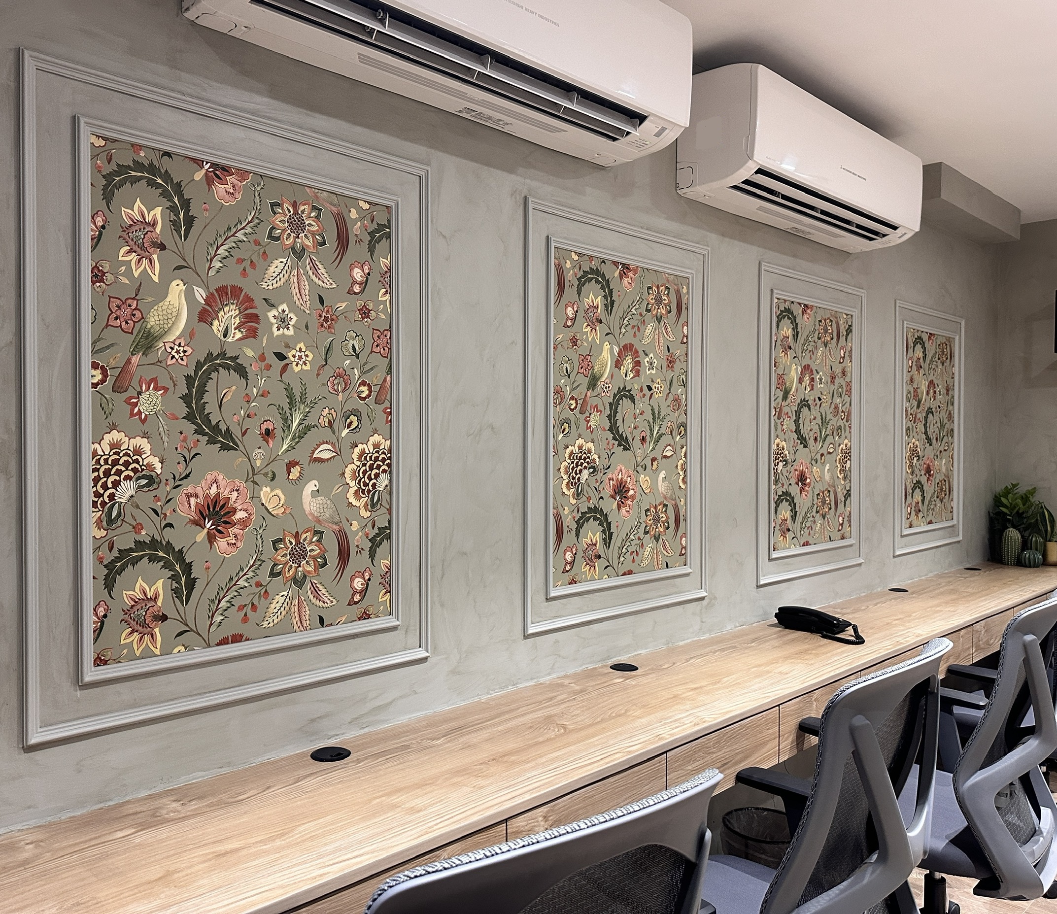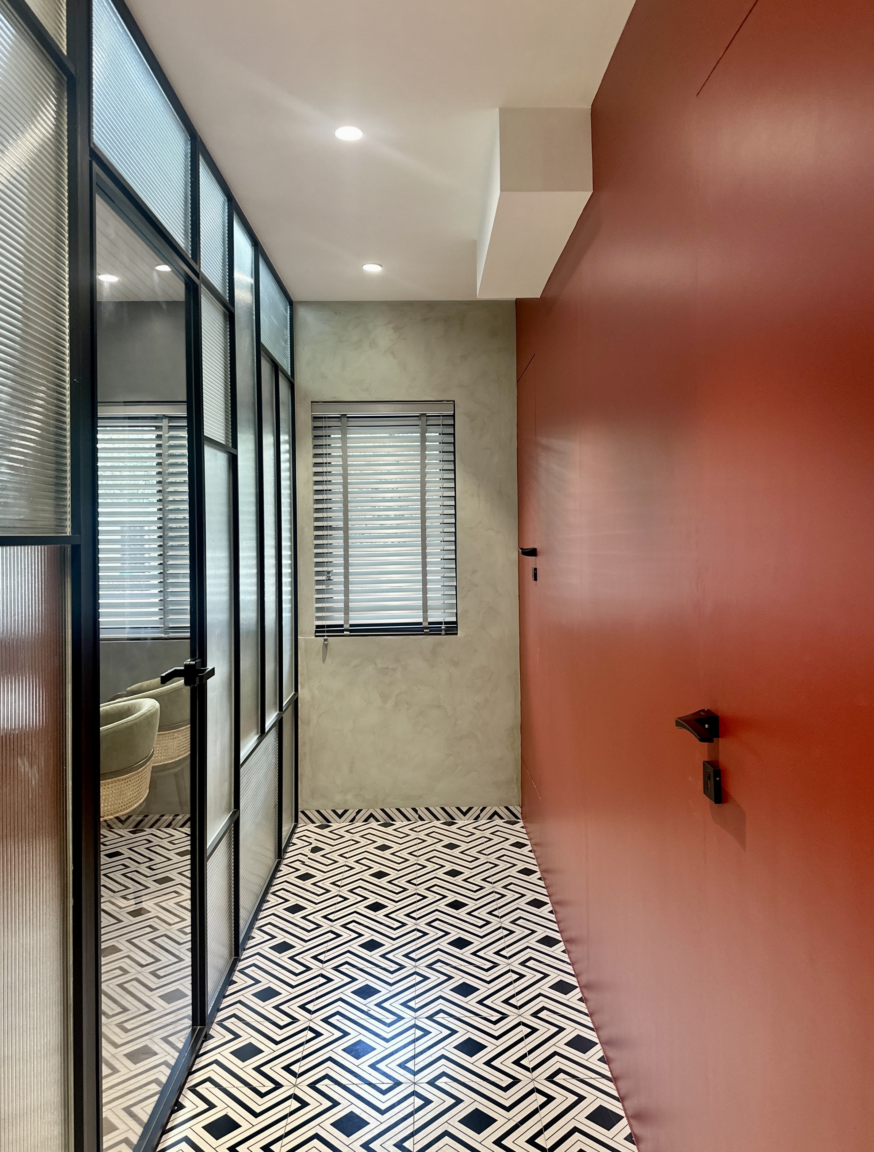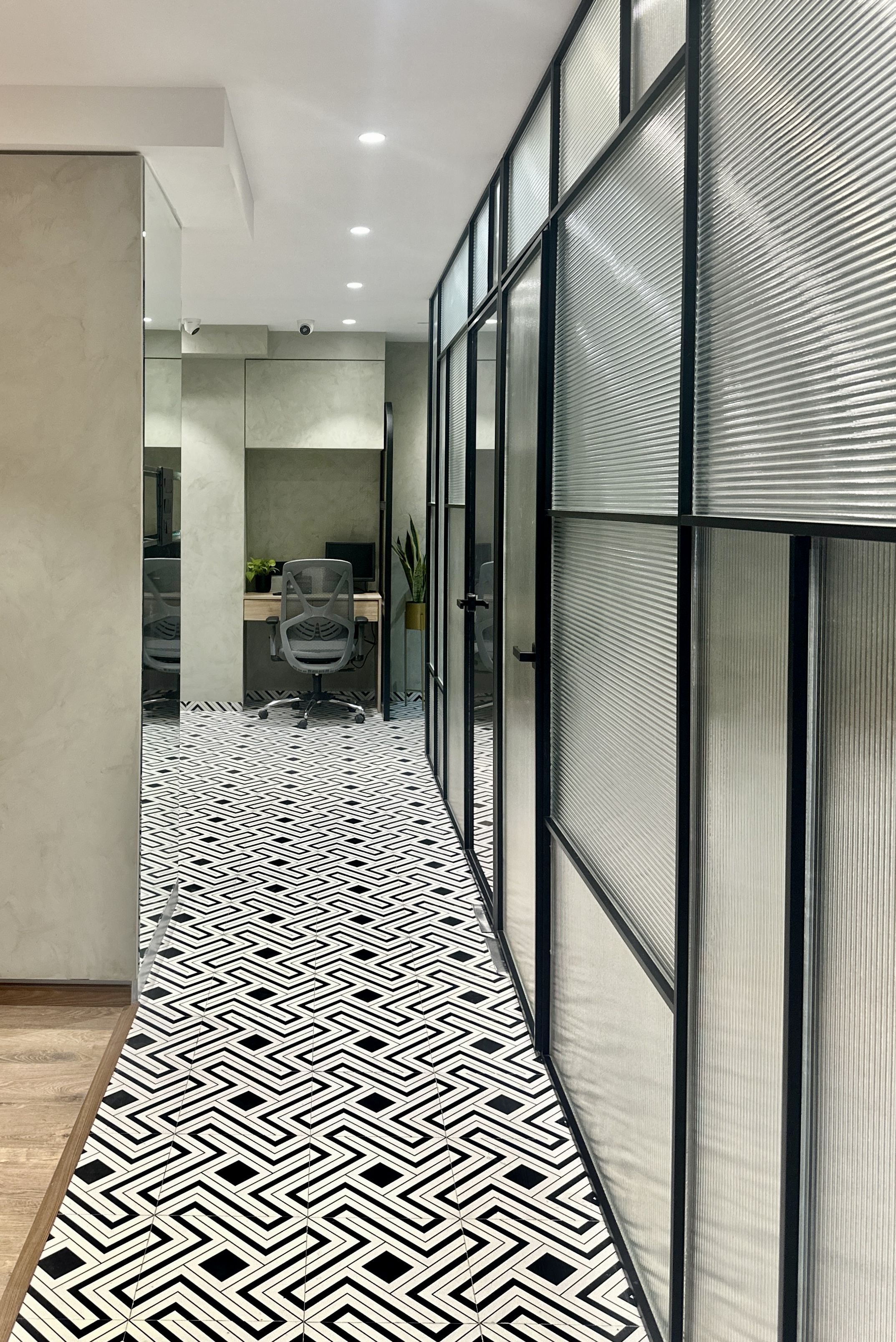 Located at Nariman Point, Mumbai, this office was designed with the aim of creating a space that reflects the nature of work of the client. FB Celebrations Pvt. Ltd., an event management company, curates magical experiences and high-end events, decorating and dazzling each one with a personalized touch. So, we included colourful florals balanced harmoniously with sophisticated minimalism, mirroring perfectly the essence of the company. A fusion of art deco and contemporary minimalism, the office welcomes one with a hallway boasting a myriad of textures and patterns on the walls and floor. The grey limewash paint in combination with sage green patterned wall and retro black and white flooring is a cohesive and inviting blend. These muted, monochromatic tones are skilfully interspersed by the contrast of red and green. The logo lies against the backdrop of the waiting area, forming the focal point.