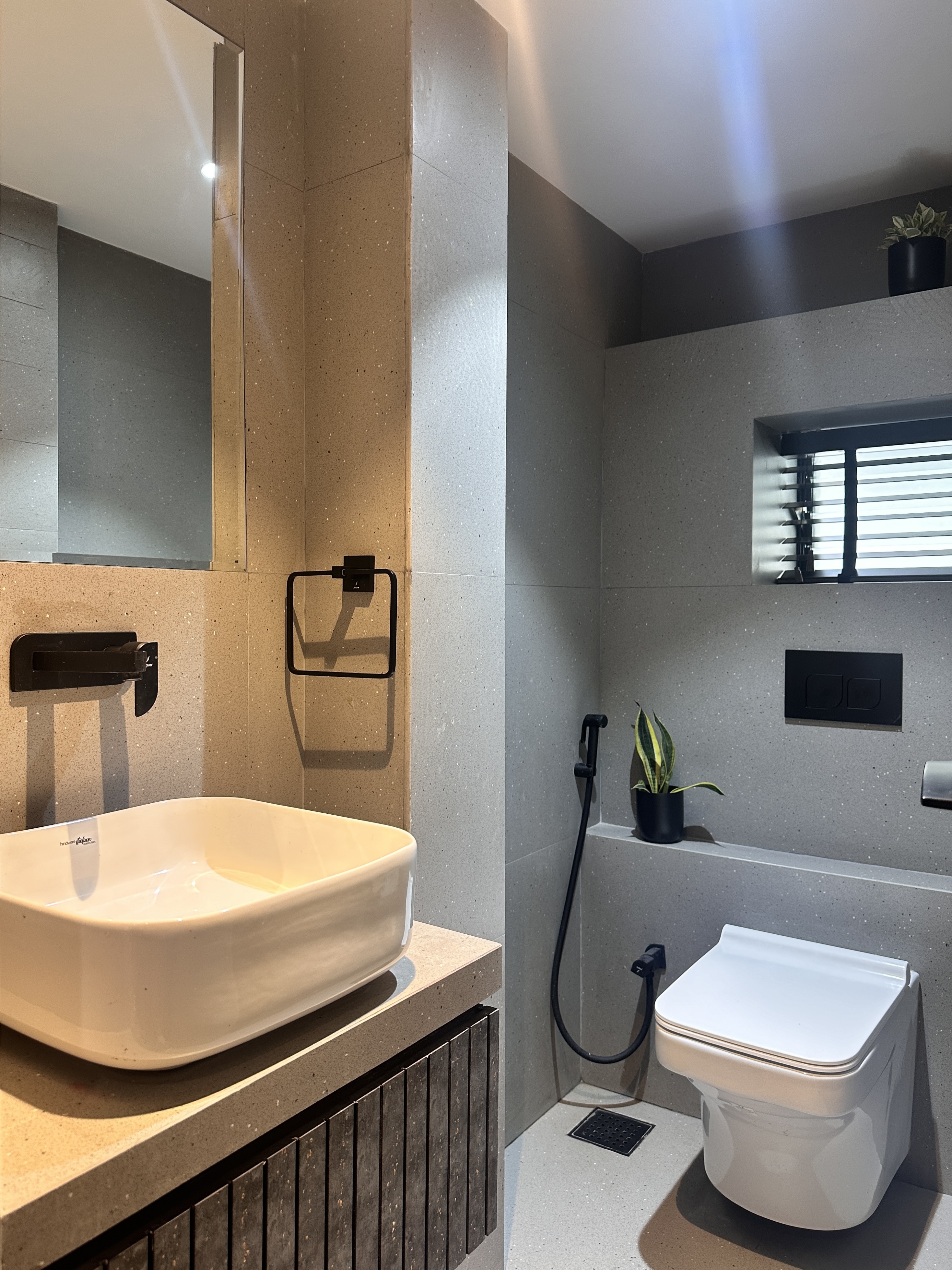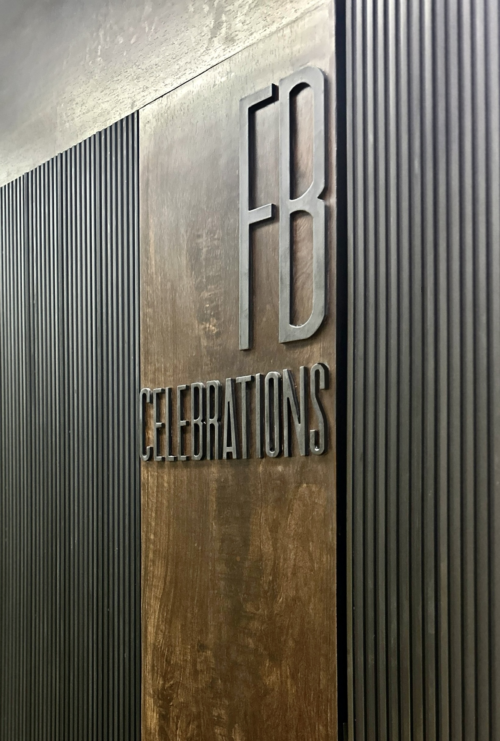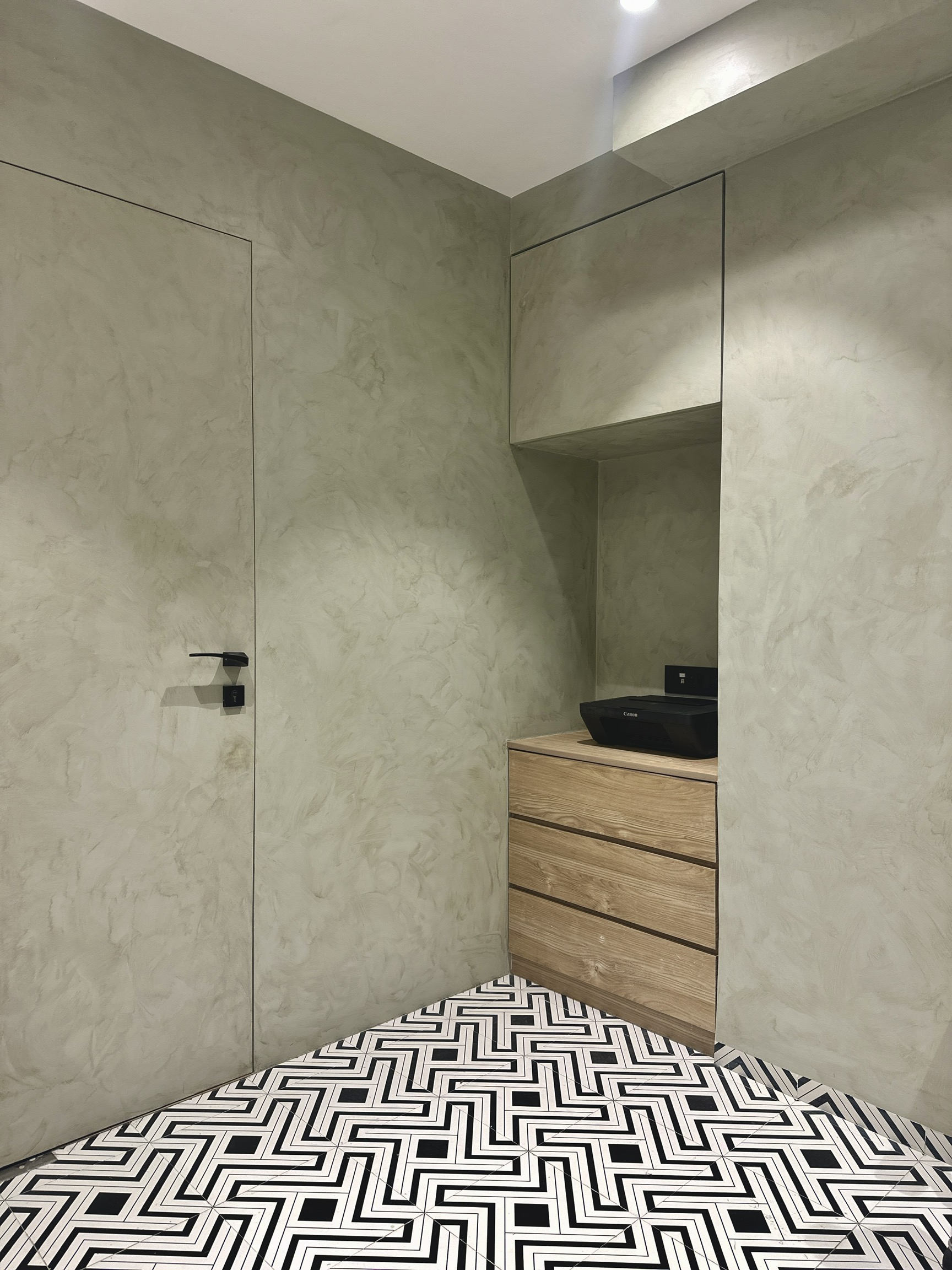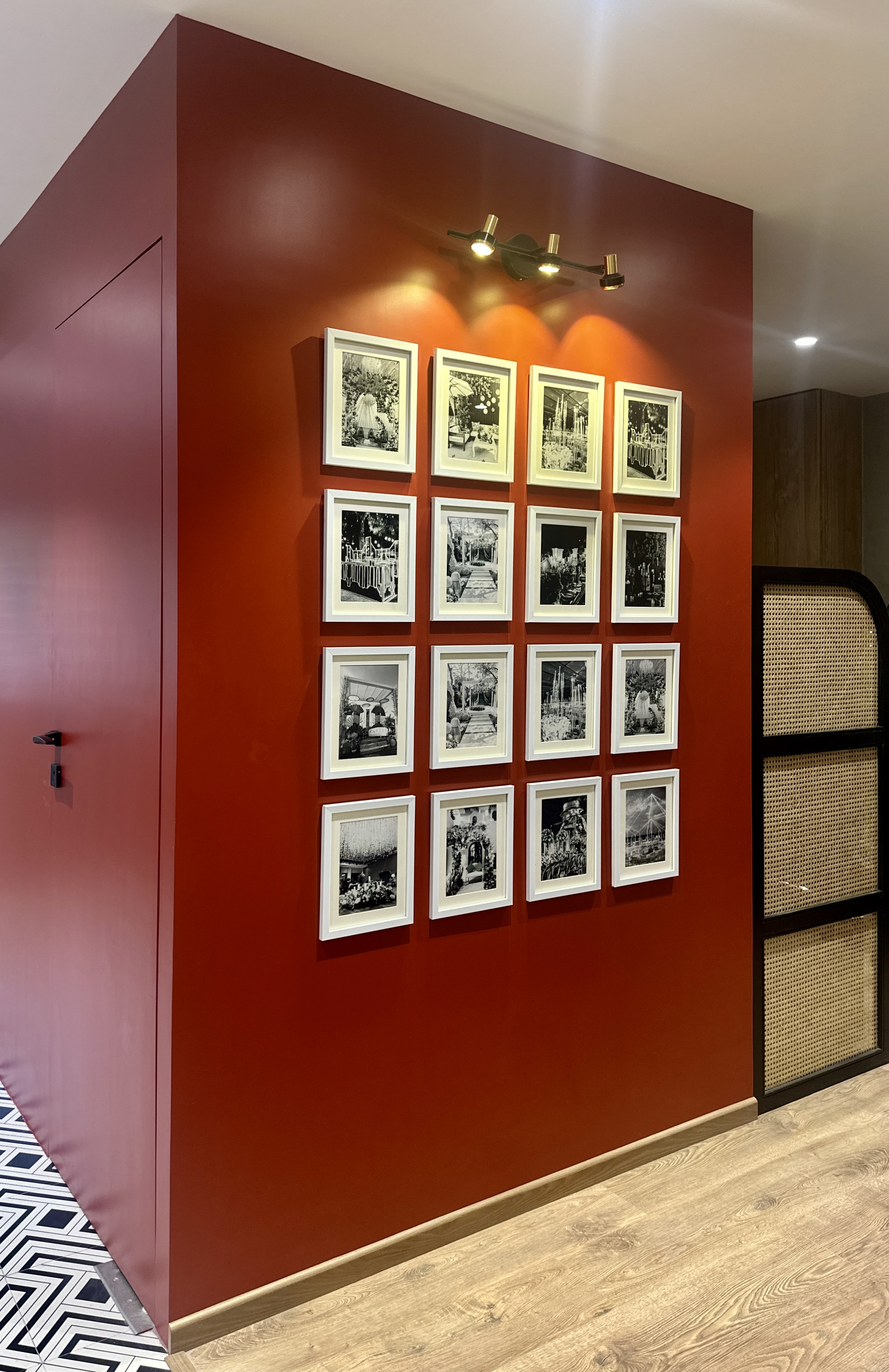 Located at Nariman Point, Mumbai, this office was designed with the aim of creating a space that reflects the nature of work of the client. FB Celebrations Pvt. Ltd., an event management company, curates magical experiences and high-end events, decorating and dazzling each one with a personalized touch. So, we included colourful florals balanced harmoniously with sophisticated minimalism, mirroring perfectly the essence of the company. A fusion of art deco and contemporary minimalism, the office welcomes one with a hallway boasting a myriad of textures and patterns on the walls and floor. The grey limewash paint in combination with sage green patterned wall and retro black and white flooring is a cohesive and inviting blend. These muted, monochromatic tones are skilfully interspersed by the contrast of red and green. The logo lies against the backdrop of the waiting area, forming the focal point.