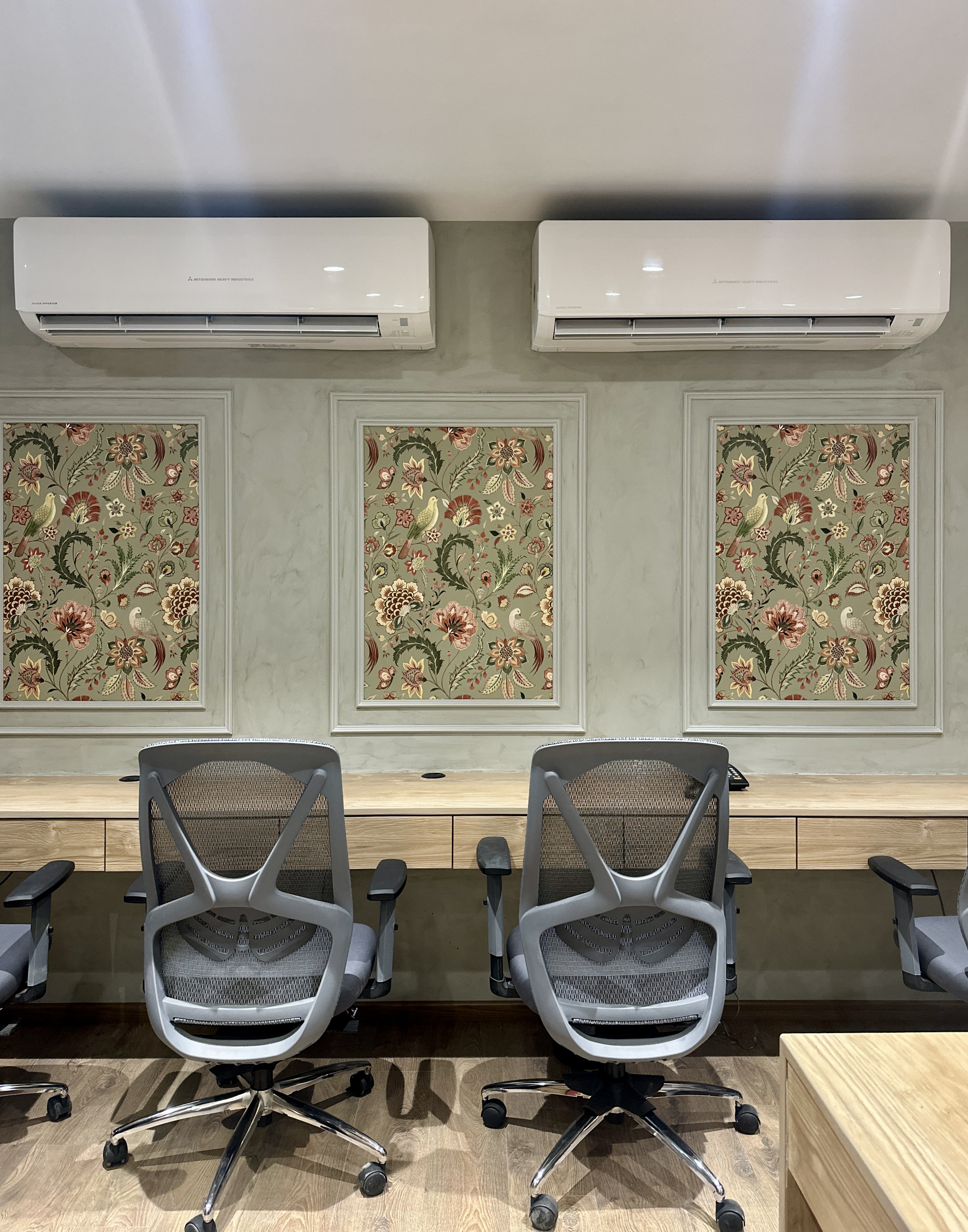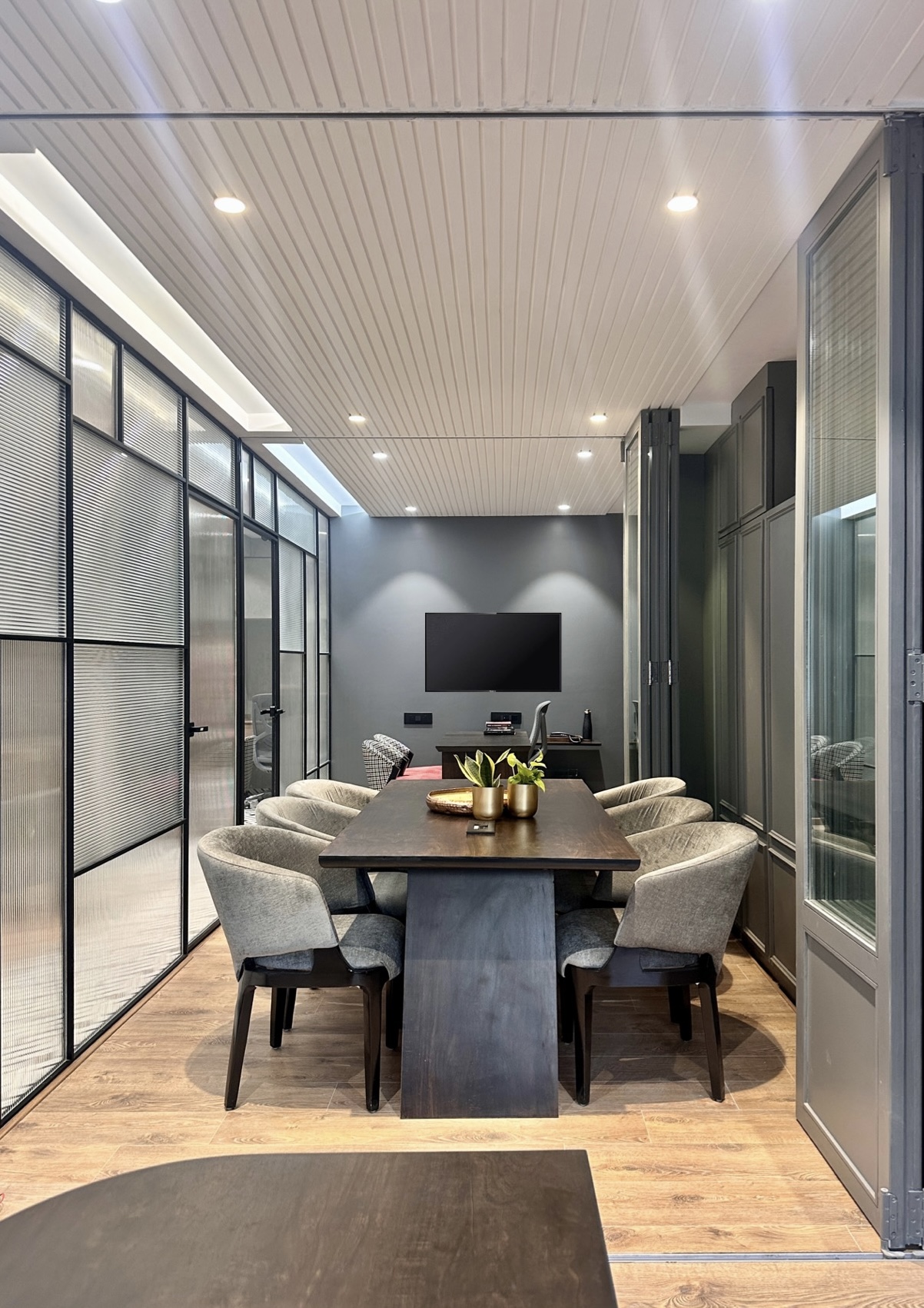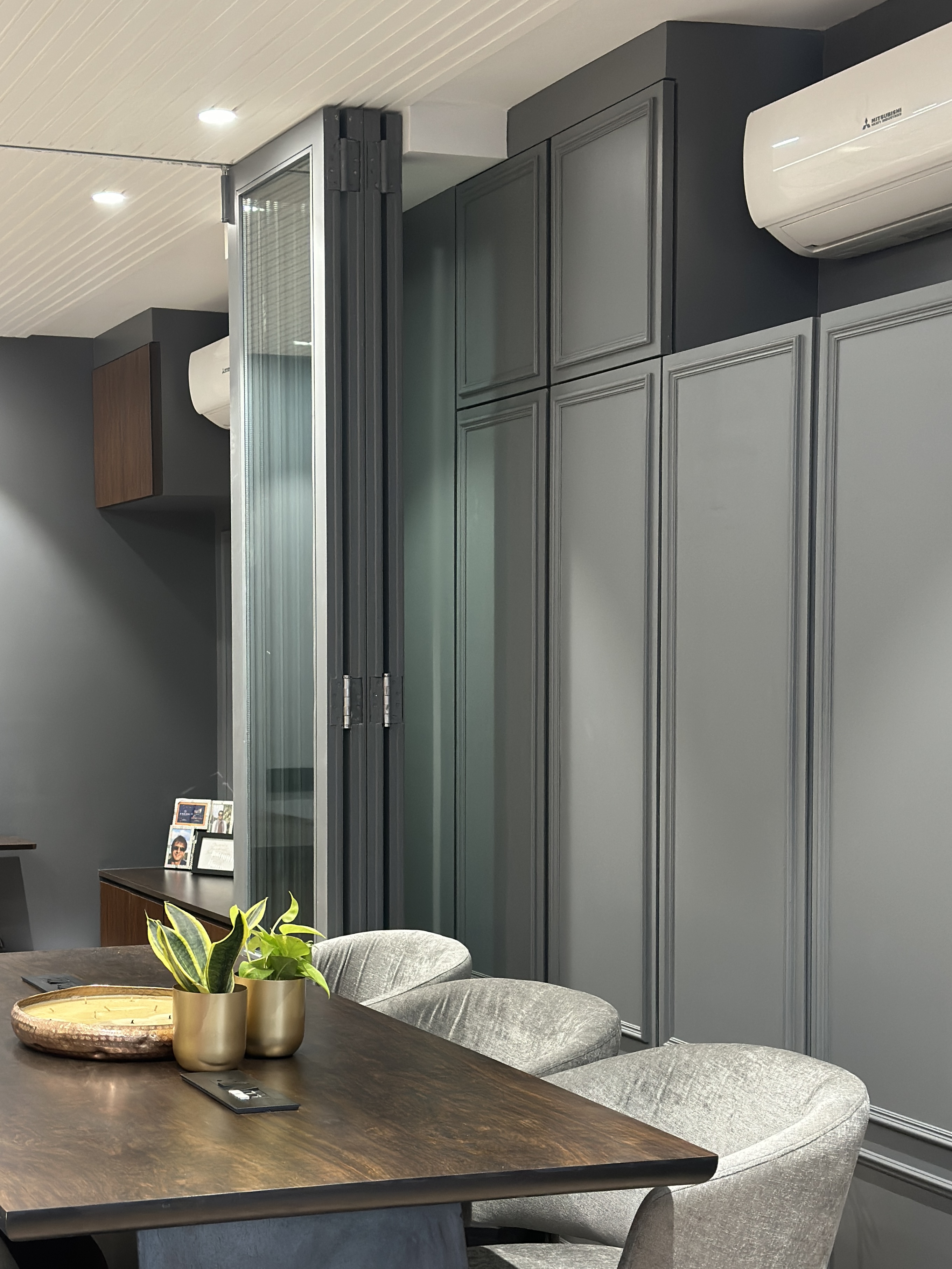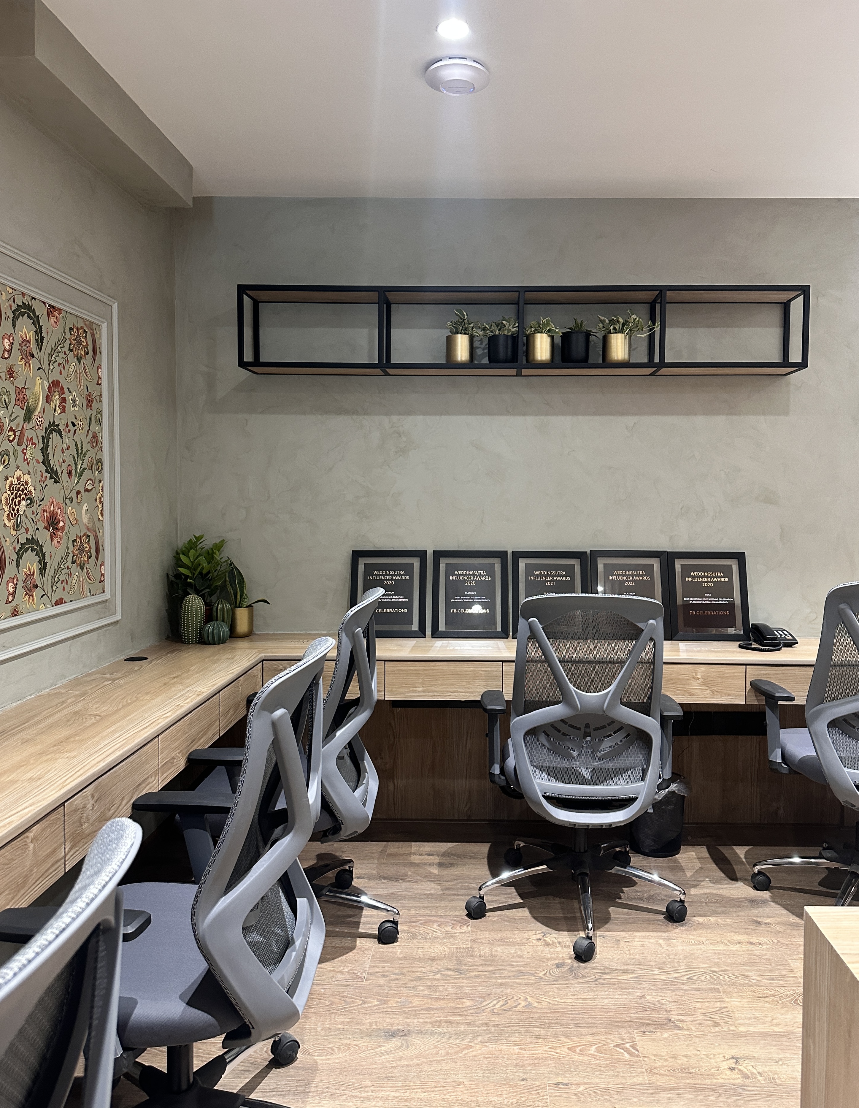 The ornamentation added through the elements of colour, wallpaper, and polished details provides the jubilating aura that comes with the planning of a wedding. The walls framed with pictures of their work and adorned with corniche- panels of floral wallpaper that resemble wedding cards also resonate with this ideology. However, hidden behind every project lurk its complications. Having to manoeuvre around the compact, labyrinthine structure, scattered with columns and existing obstructing pipes, the short-stipulated time, and the difficult working hours confined to nighttime, presented this project as quite complicated. Piled on top of these technical difficulties, were the high expectations and clear requirements of the client. Therefore, we had to adopt a simultaneous rather than linear system of planning. Rather than providing the complete design before its execution, we began the demolition process as well as the initial steps, parallelly perfecting the design, to adhere to the tight timeline. We embraced the complications by incorporating them into our design, as seen in the mirror column that doubles as a storage space, and the strategically organized toilets, pantry, and storage areas. The sharp edges and fluted glass walls amplify the essence of the space and complement the use of bright colours. Glass partitions divide the directors’ cabin and conference room. These sliding-folding partitions make the entire space flexible for users enabling enough privacy for directors when needed and allowing a free-flowing large space for meetings or any audio-visual presentations. An additional feature of these partitions is that they allow light to flood in from the main window, penetrating through the glass walls and illuminating the entire space. Breaking conventionality, the office has an open work area, as opposed to a modular, cramped workstations, promoting a sense of teamwork and togetherness, which is engrained in the roots of the company. The accounts cabin and RSVP room, where important calls are to be made, have an articulately calculated placement. There is an effective use of rattan screens to eloquently tackle the space crunch and cover the visual obstacles.