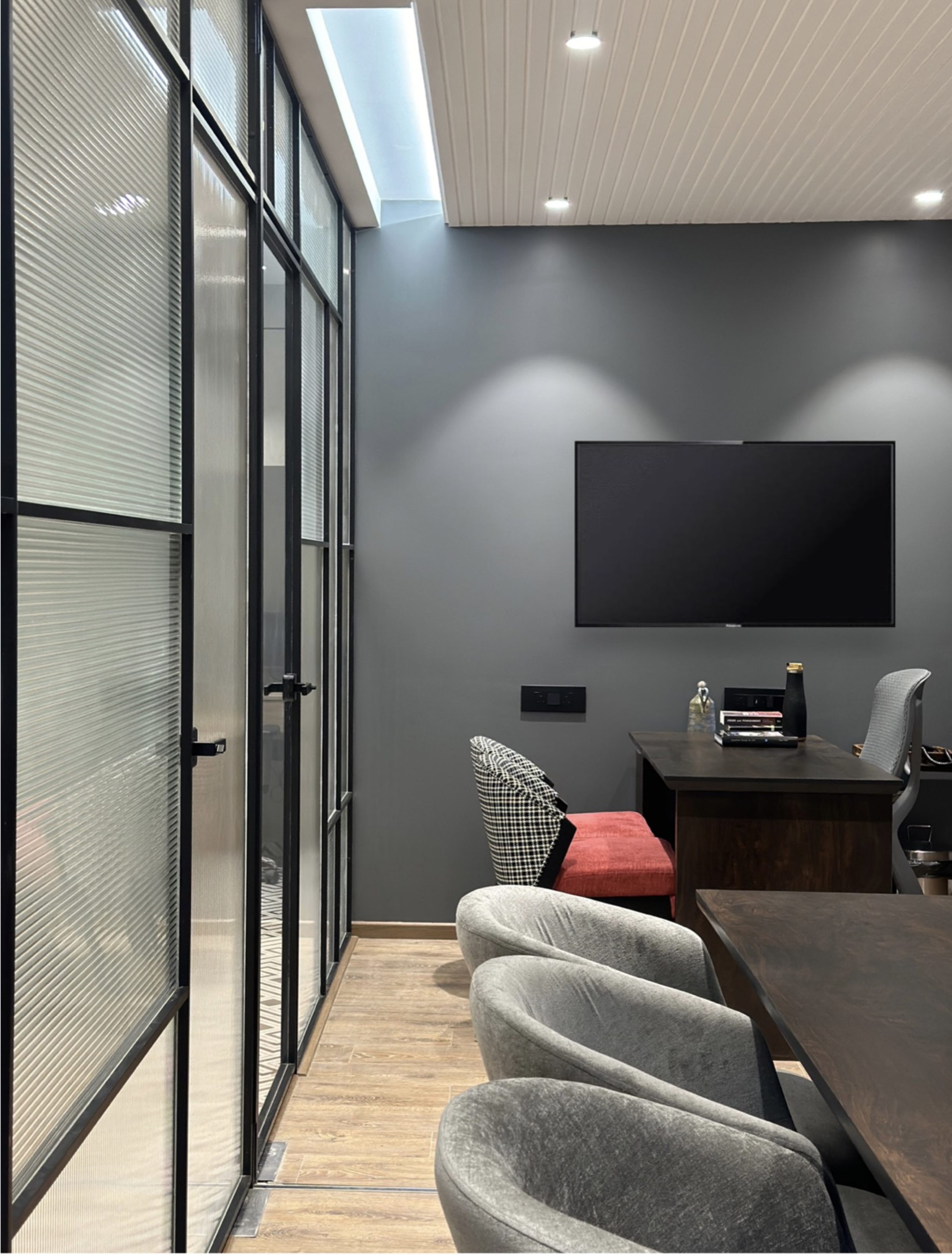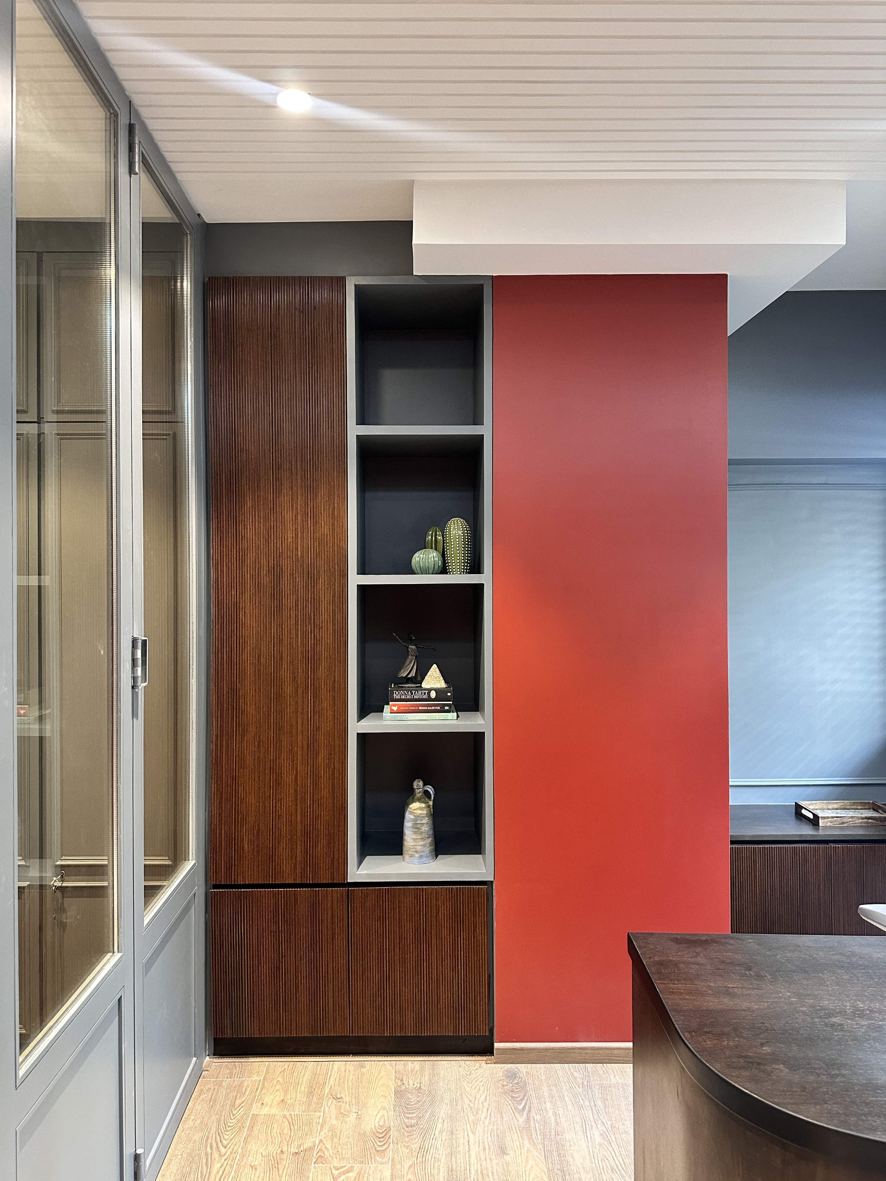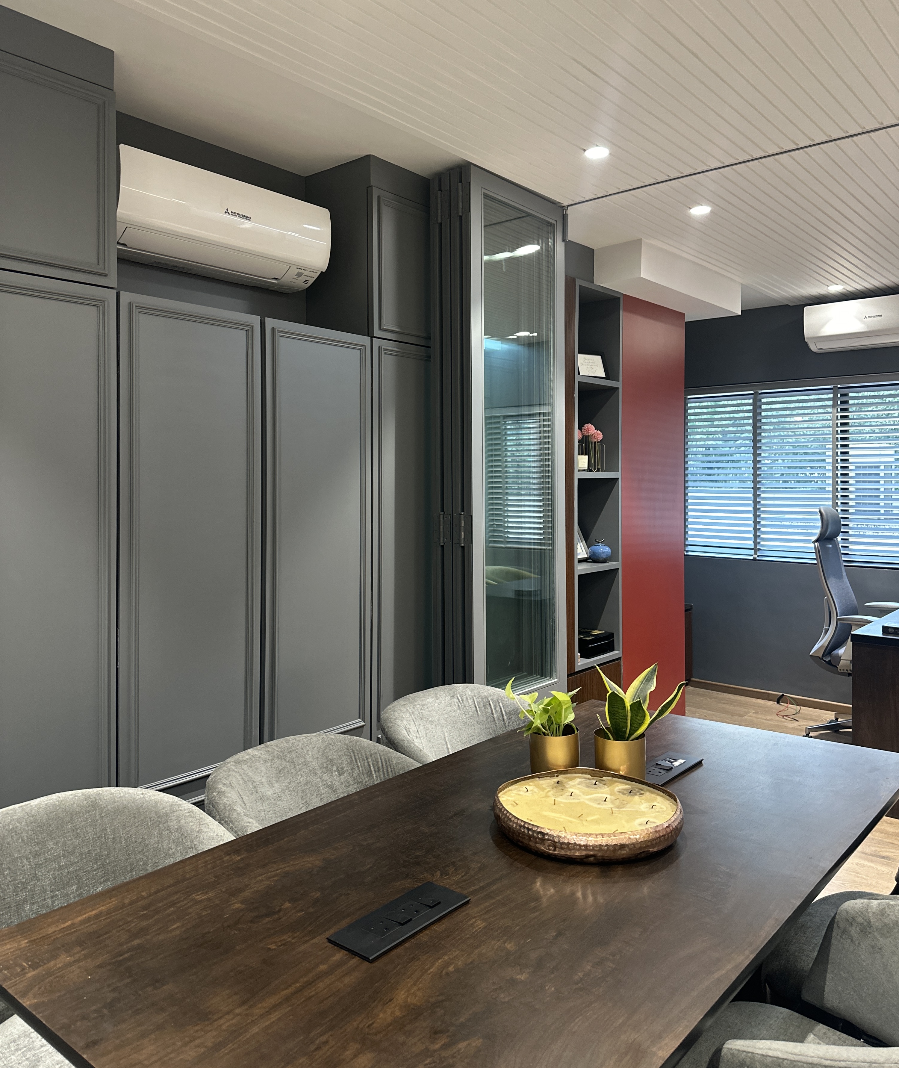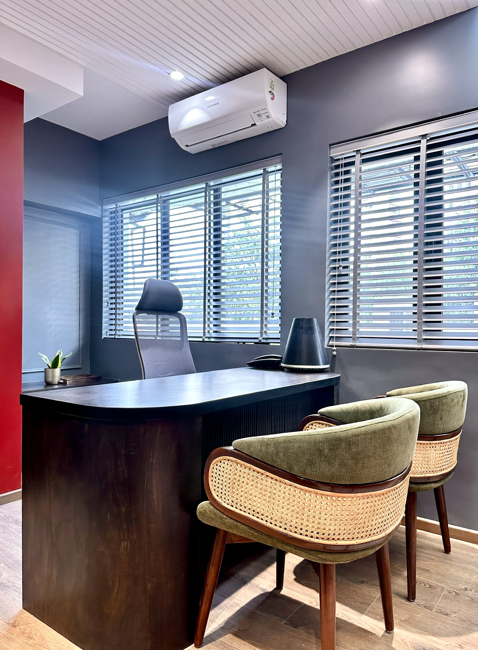 The ornamentation added through the elements of colour, wallpaper, and polished details provides the jubilating aura that comes with the planning of a wedding. The walls framed with pictures of their work and adorned with corniche- panels of floral wallpaper that resemble wedding cards also resonate with this ideology. However, hidden behind every project lurk its complications. Having to manoeuvre around the compact, labyrinthine structure, scattered with columns and existing obstructing pipes, the short-stipulated time, and the difficult working hours confined to nighttime, presented this project as quite complicated. Piled on top of these technical difficulties, were the high expectations and clear requirements of the client. Therefore, we had to adopt a simultaneous rather than linear system of planning. Rather than providing the complete design before its execution, we began the demolition process as well as the initial steps, parallelly perfecting the design, to adhere to the tight timeline. We embraced the complications by incorporating them into our design, as seen in the mirror column that doubles as a storage space, and the strategically organized toilets, pantry, and storage areas. The sharp edges and fluted glass walls amplify the essence of the space and complement the use of bright colours. Glass partitions divide the directors’ cabin and conference room. These sliding-folding partitions make the entire space flexible for users enabling enough privacy for directors when needed and allowing a free-flowing large space for meetings or any audio-visual presentations. An additional feature of these partitions is that they allow light to flood in from the main window, penetrating through the glass walls and illuminating the entire space. Breaking conventionality, the office has an open work area, as opposed to a modular, cramped workstations, promoting a sense of teamwork and togetherness, which is engrained in the roots of the company. The accounts cabin and RSVP room, where important calls are to be made, have an articulately calculated placement. There is an effective use of rattan screens to eloquently tackle the space crunch and cover the visual obstacles.