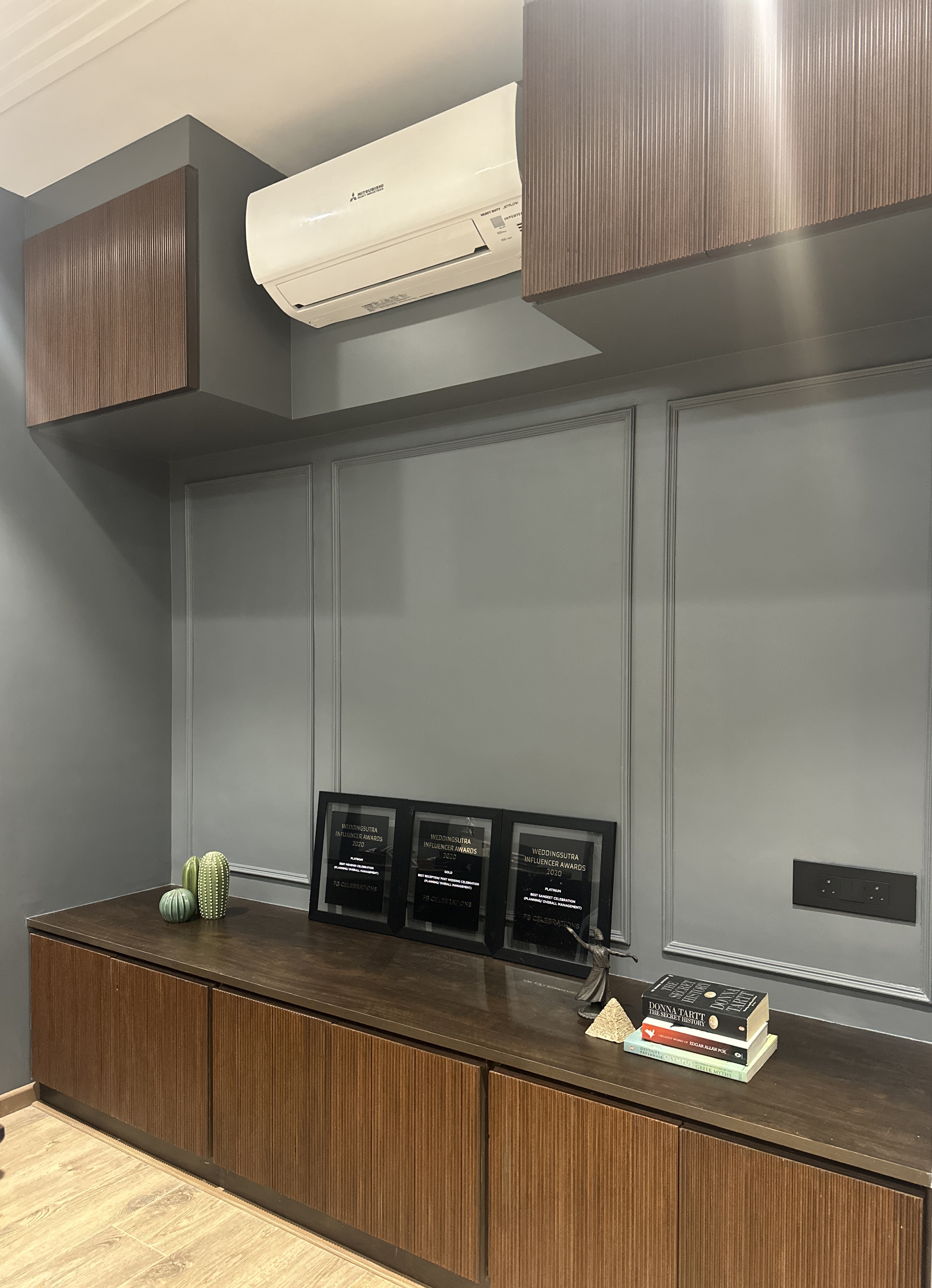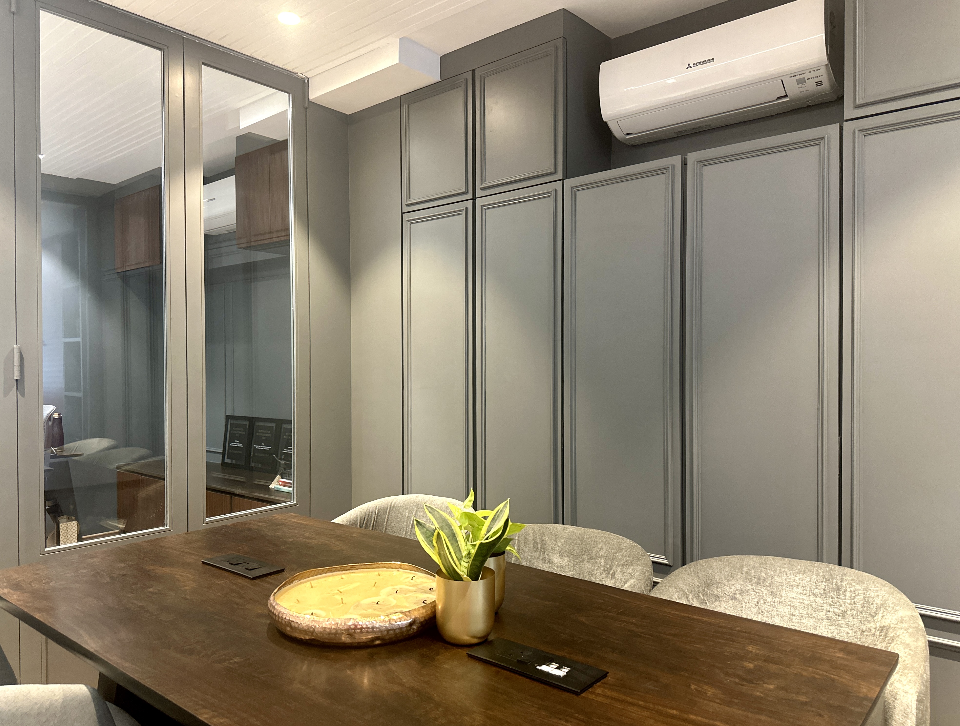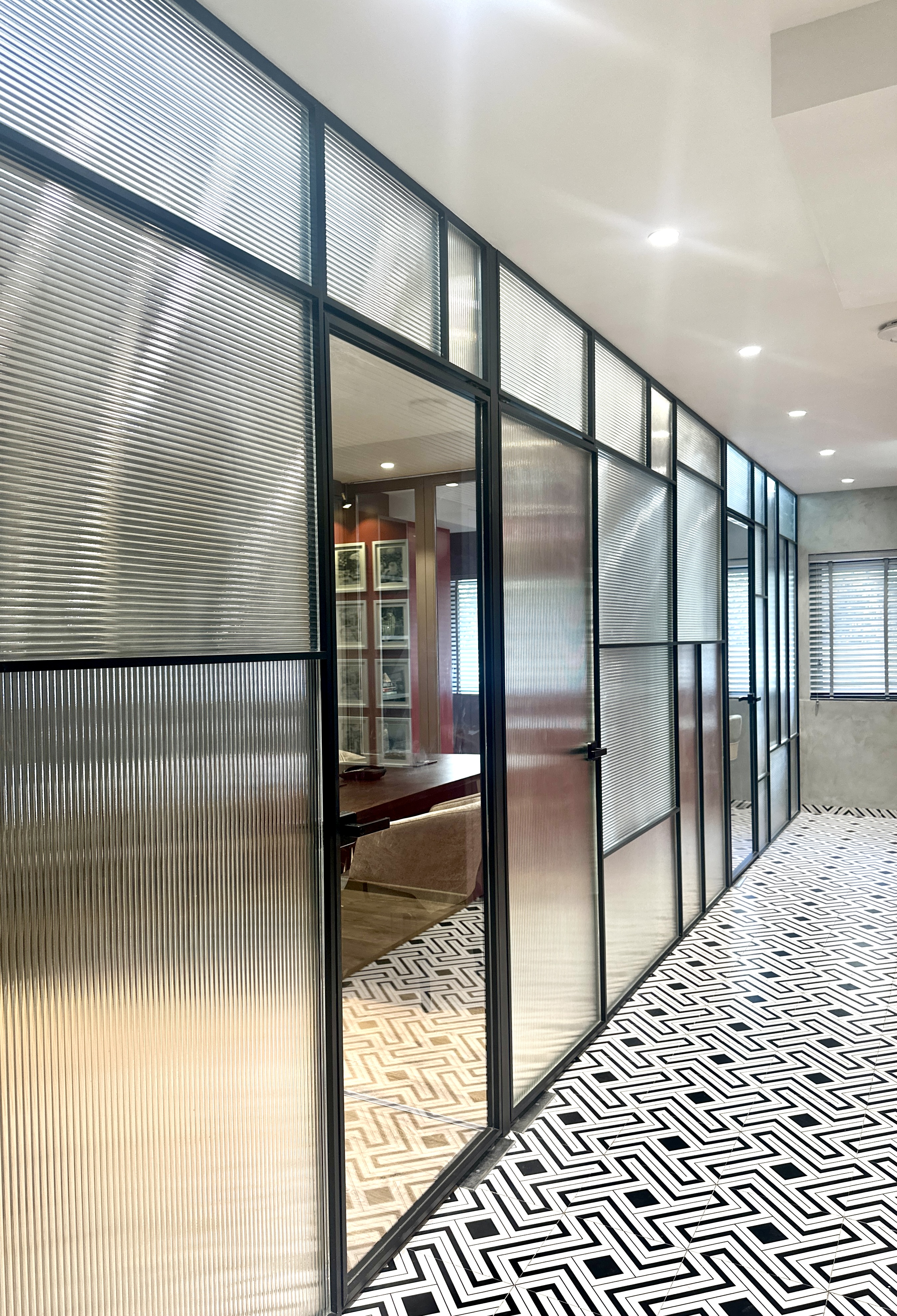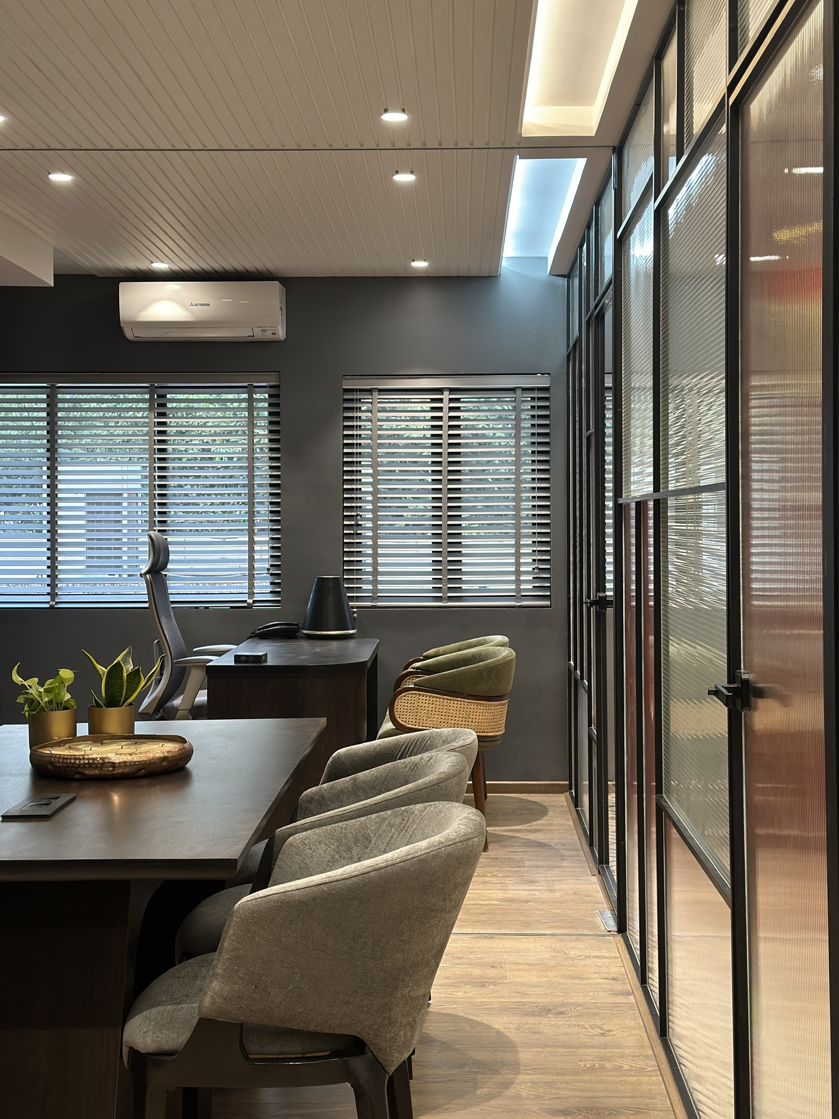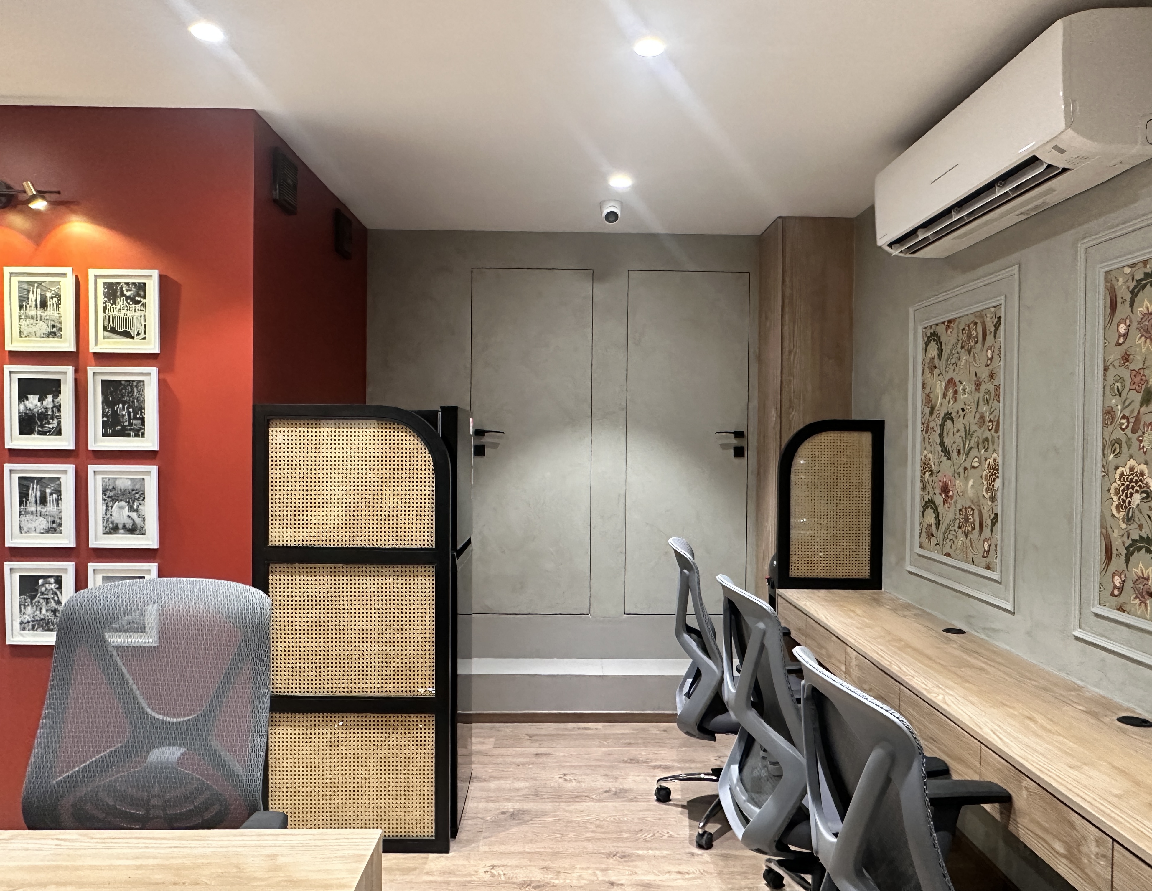 The ornamentation added through the elements of colour, wallpaper, and polished details provides the jubilating aura that comes with the planning of a wedding. The walls framed with pictures of their work and adorned with corniche- panels of floral wallpaper that resemble wedding cards also resonate with this ideology. However, hidden behind every project lurk its complications. Having to manoeuvre around the compact, labyrinthine structure, scattered with columns and existing obstructing pipes, the short-stipulated time, and the difficult working hours confined to nighttime, presented this project as quite complicated. Piled on top of these technical difficulties, were the high expectations and clear requirements of the client. Therefore, we had to adopt a simultaneous rather than linear system of planning. Rather than providing the complete design before its execution, we began the demolition process as well as the initial steps, parallelly perfecting the design, to adhere to the tight timeline. We embraced the complications by incorporating them into our design, as seen in the mirror column that doubles as a storage space, and the strategically organized toilets, pantry, and storage areas. The sharp edges and fluted glass walls amplify the essence of the space and complement the use of bright colours. Glass partitions divide the directors’ cabin and conference room. These sliding-folding partitions make the entire space flexible for users enabling enough privacy for directors when needed and allowing a free-flowing large space for meetings or any audio-visual presentations. An additional feature of these partitions is that they allow light to flood in from the main window, penetrating through the glass walls and illuminating the entire space. Breaking conventionality, the office has an open work area, as opposed to a modular, cramped workstations, promoting a sense of teamwork and togetherness, which is engrained in the roots of the company. The accounts cabin and RSVP room, where important calls are to be made, have an articulately calculated placement. There is an effective use of rattan screens to eloquently tackle the space crunch and cover the visual obstacles.