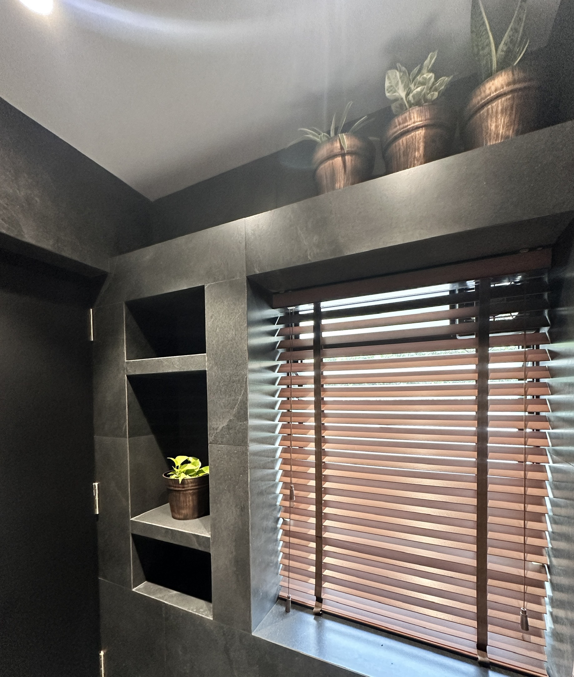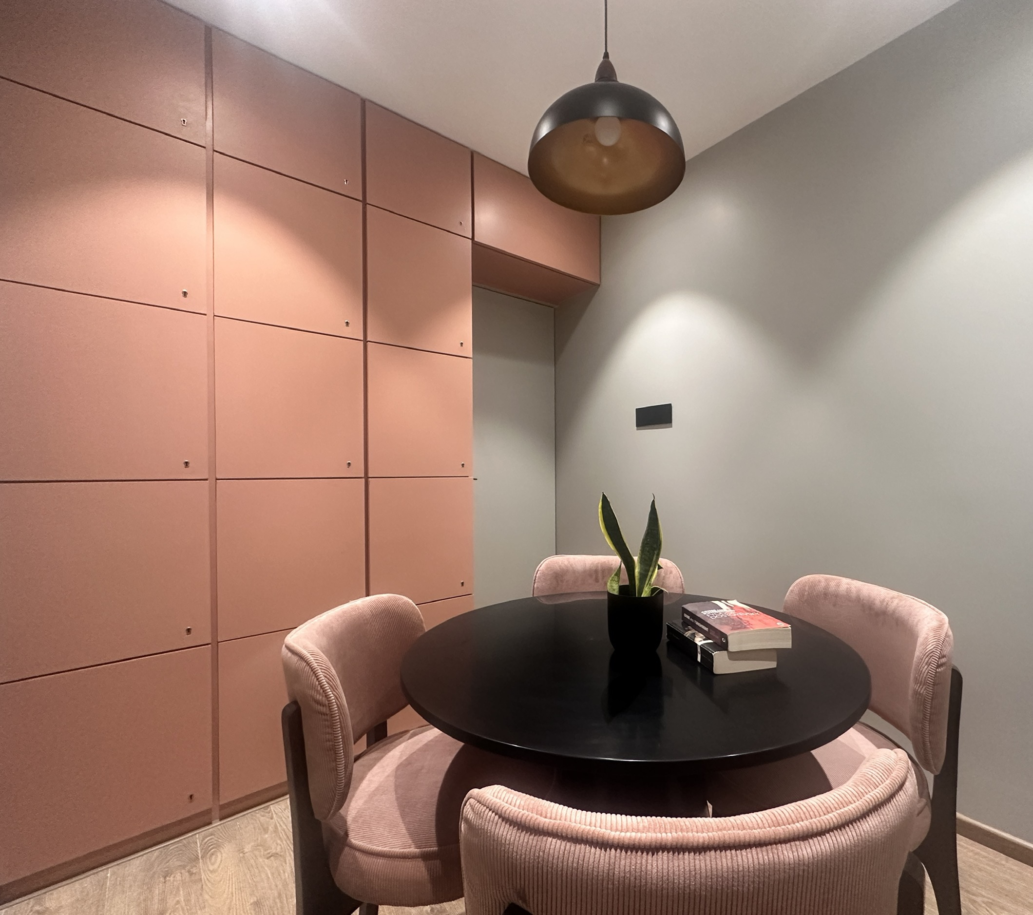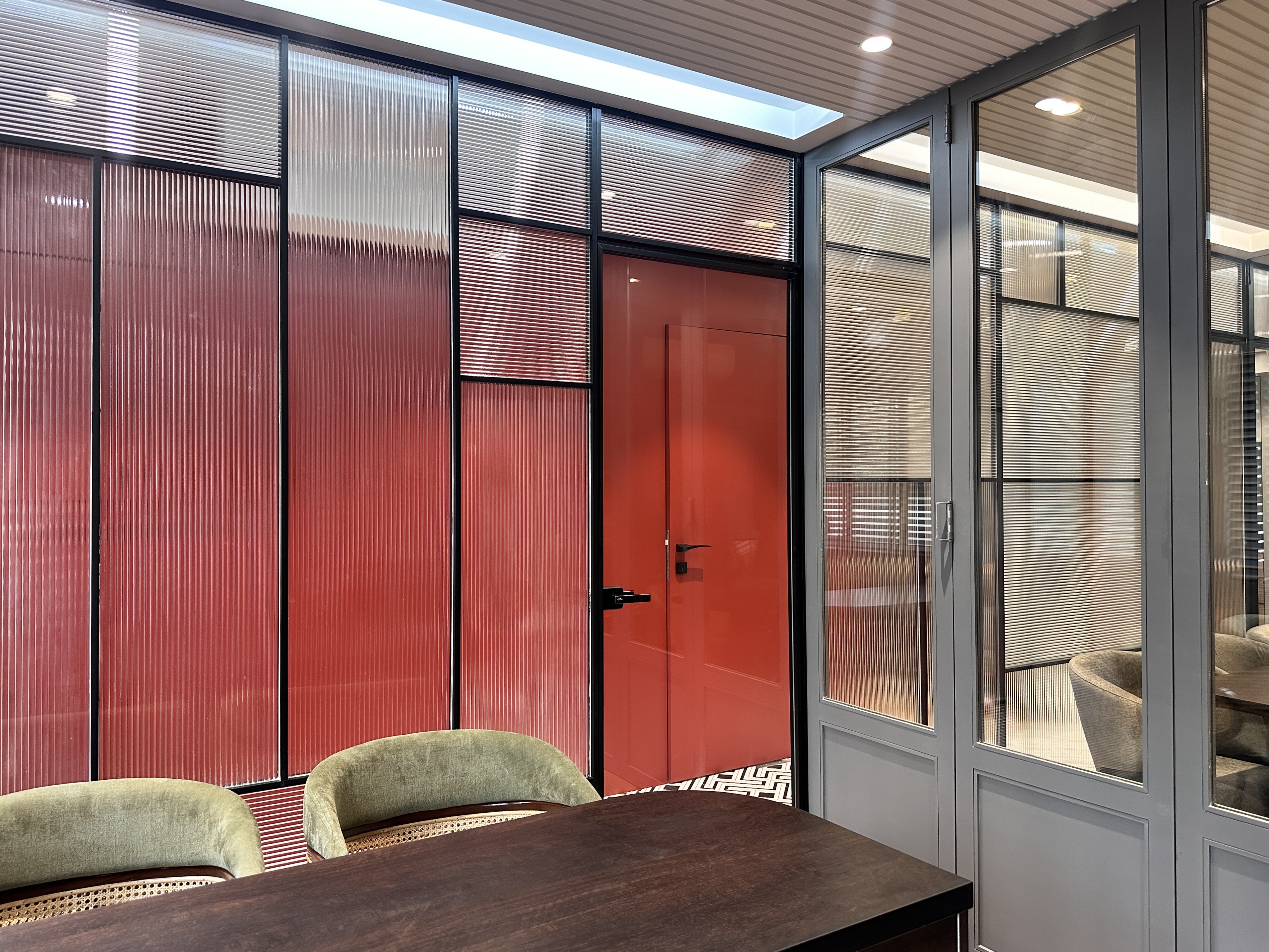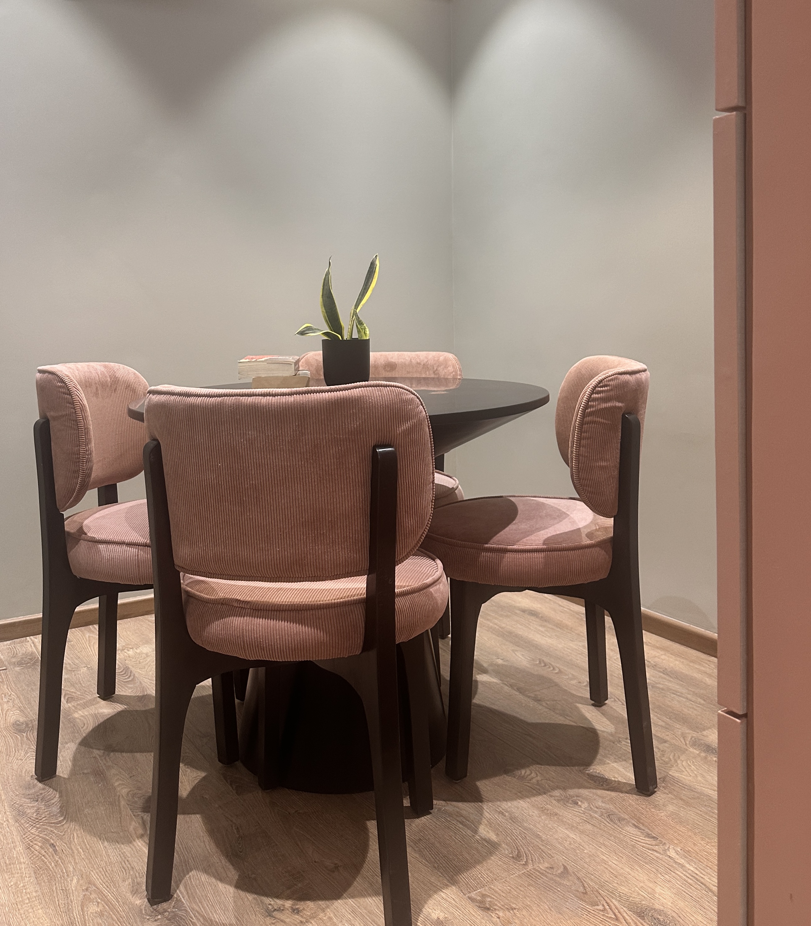 The ornamentation added through the elements of colour, wallpaper, and polished details provides the jubilating aura that comes with the planning of a wedding. The walls framed with pictures of their work and adorned with corniche- panels of floral wallpaper that resemble wedding cards also resonate with this ideology. However, hidden behind every project lurk its complications. Having to manoeuvre around the compact, labyrinthine structure, scattered with columns and existing obstructing pipes, the short-stipulated time, and the difficult working hours confined to nighttime, presented this project as quite complicated. Piled on top of these technical difficulties, were the high expectations and clear requirements of the client. Therefore, we had to adopt a simultaneous rather than linear system of planning. Rather than providing the complete design before its execution, we began the demolition process as well as the initial steps, parallelly perfecting the design, to adhere to the tight timeline. We embraced the complications by incorporating them into our design, as seen in the mirror column that doubles as a storage space, and the strategically organized toilets, pantry, and storage areas. The sharp edges and fluted glass walls amplify the essence of the space and complement the use of bright colours. Glass partitions divide the directors’ cabin and conference room. These sliding-folding partitions make the entire space flexible for users enabling enough privacy for directors when needed and allowing a free-flowing large space for meetings or any audio-visual presentations. An additional feature of these partitions is that they allow light to flood in from the main window, penetrating through the glass walls and illuminating the entire space. Breaking conventionality, the office has an open work area, as opposed to a modular, cramped workstations, promoting a sense of teamwork and togetherness, which is engrained in the roots of the company. The accounts cabin and RSVP room, where important calls are to be made, have an articulately calculated placement. There is an effective use of rattan screens to eloquently tackle the space crunch and cover the visual obstacles.