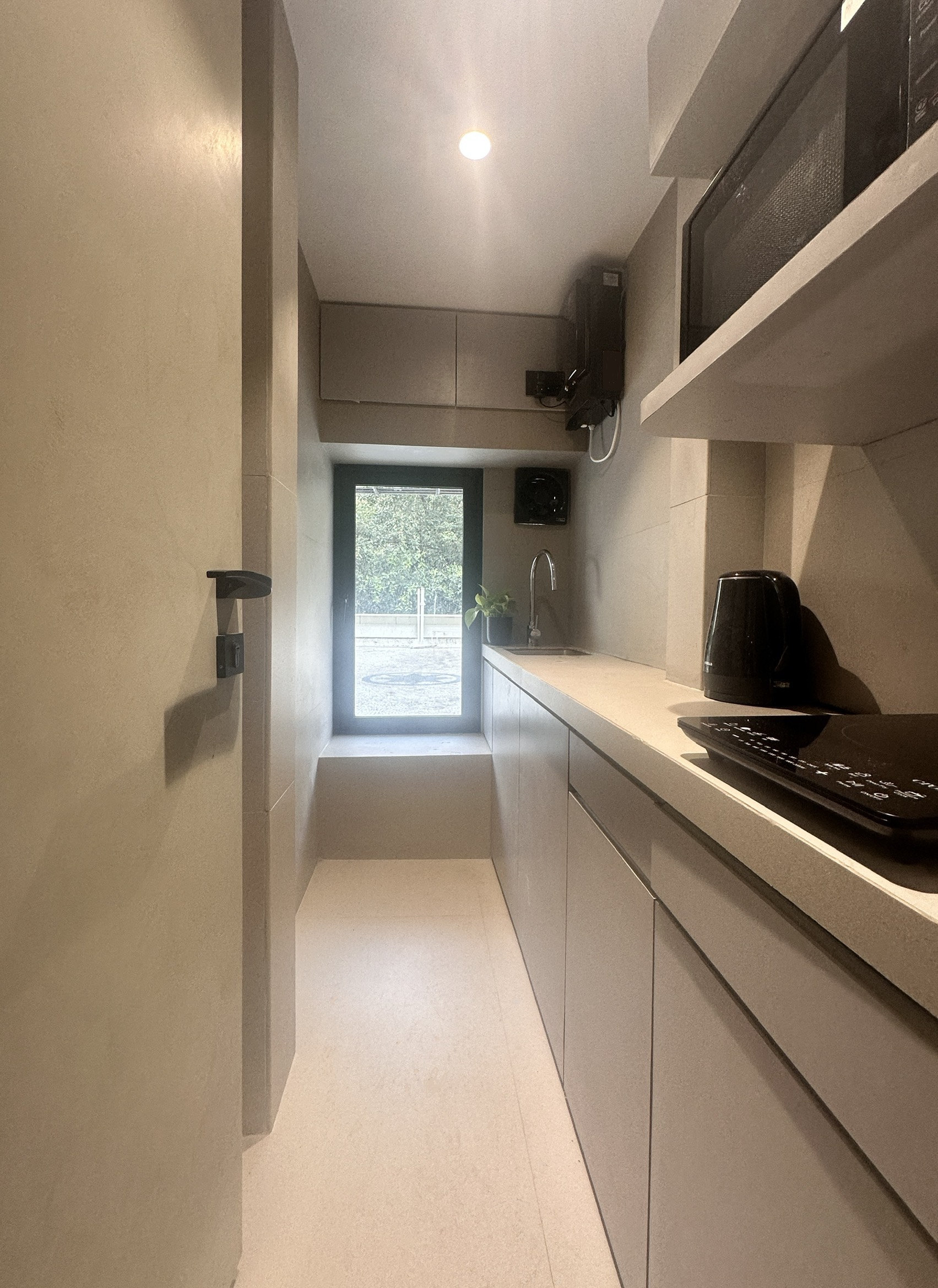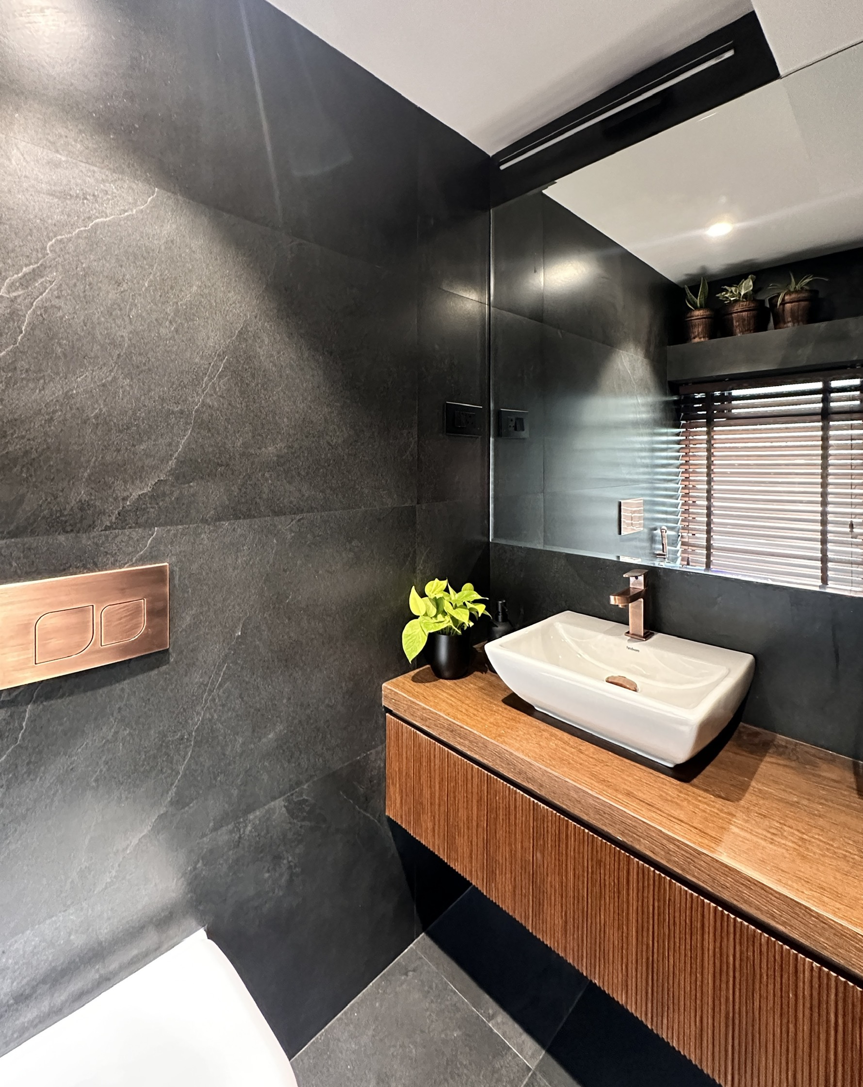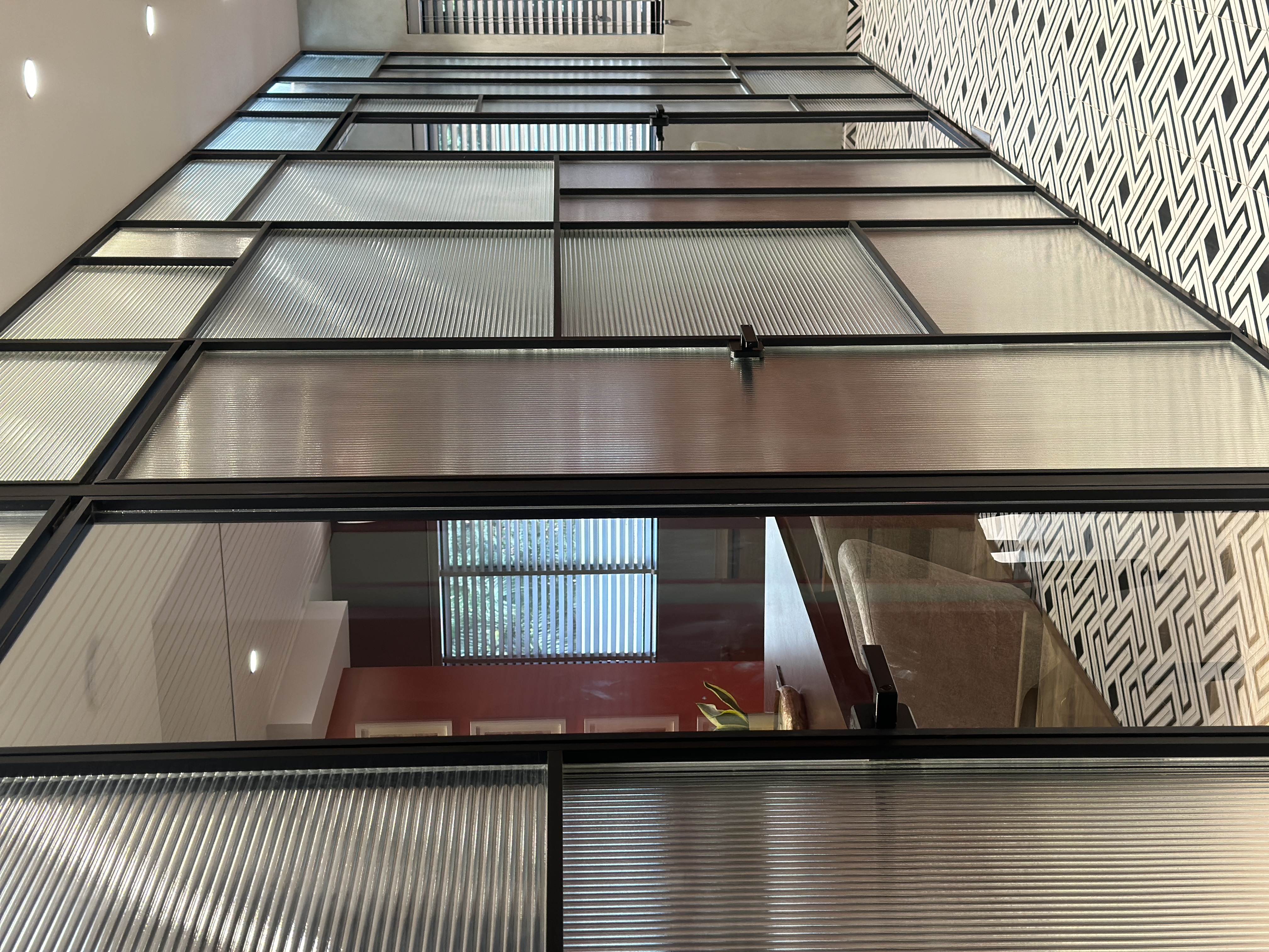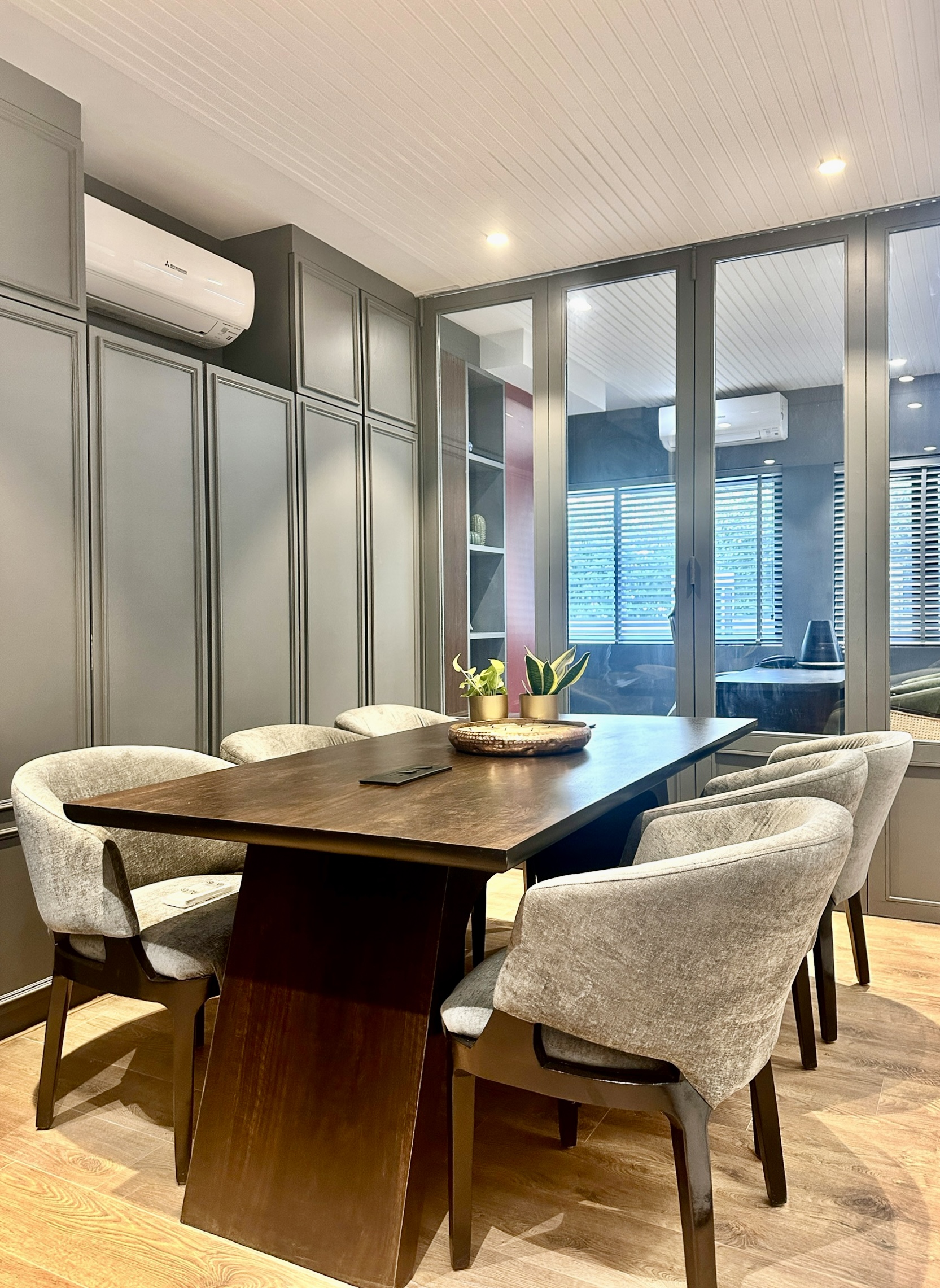 The ornamentation added through the elements of colour, wallpaper, and polished details provides the jubilating aura that comes with the planning of a wedding. The walls framed with pictures of their work and adorned with corniche- panels of floral wallpaper that resemble wedding cards also resonate with this ideology. However, hidden behind every project lurk its complications. Having to manoeuvre around the compact, labyrinthine structure, scattered with columns and existing obstructing pipes, the short-stipulated time, and the difficult working hours confined to nighttime, presented this project as quite complicated. Piled on top of these technical difficulties, were the high expectations and clear requirements of the client. Therefore, we had to adopt a simultaneous rather than linear system of planning. Rather than providing the complete design before its execution, we began the demolition process as well as the initial steps, parallelly perfecting the design, to adhere to the tight timeline. We embraced the complications by incorporating them into our design, as seen in the mirror column that doubles as a storage space, and the strategically organized toilets, pantry, and storage areas. The sharp edges and fluted glass walls amplify the essence of the space and complement the use of bright colours. Glass partitions divide the directors’ cabin and conference room. These sliding-folding partitions make the entire space flexible for users enabling enough privacy for directors when needed and allowing a free-flowing large space for meetings or any audio-visual presentations. An additional feature of these partitions is that they allow light to flood in from the main window, penetrating through the glass walls and illuminating the entire space. Breaking conventionality, the office has an open work area, as opposed to a modular, cramped workstations, promoting a sense of teamwork and togetherness, which is engrained in the roots of the company. The accounts cabin and RSVP room, where important calls are to be made, have an articulately calculated placement. There is an effective use of rattan screens to eloquently tackle the space crunch and cover the visual obstacles.