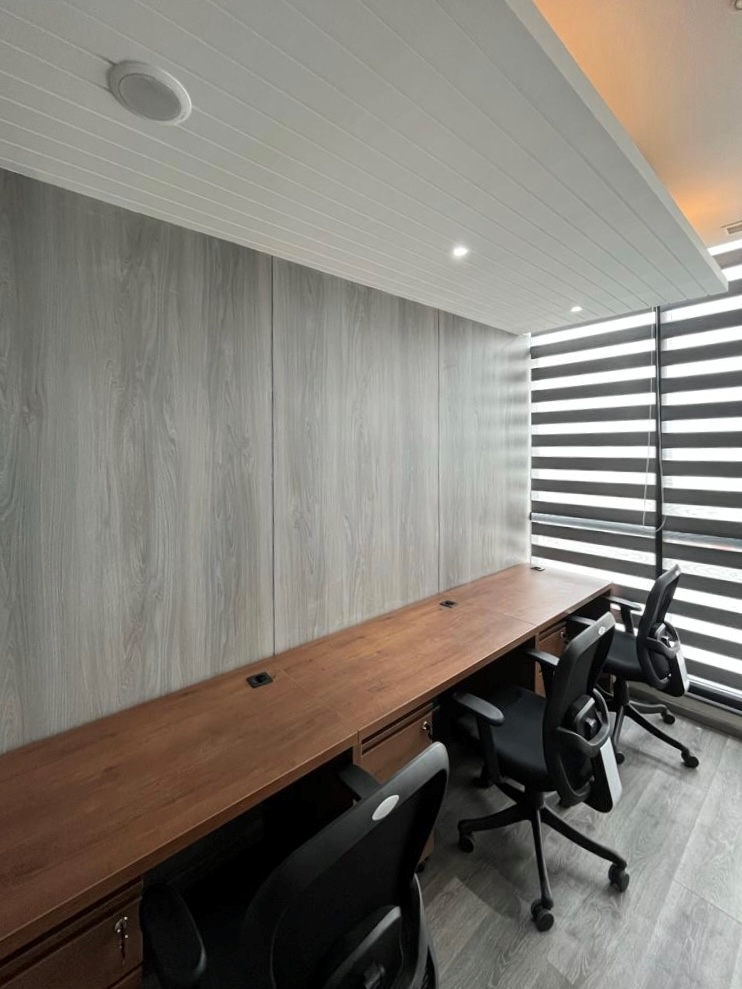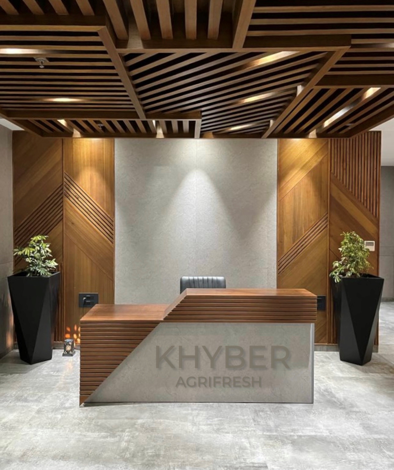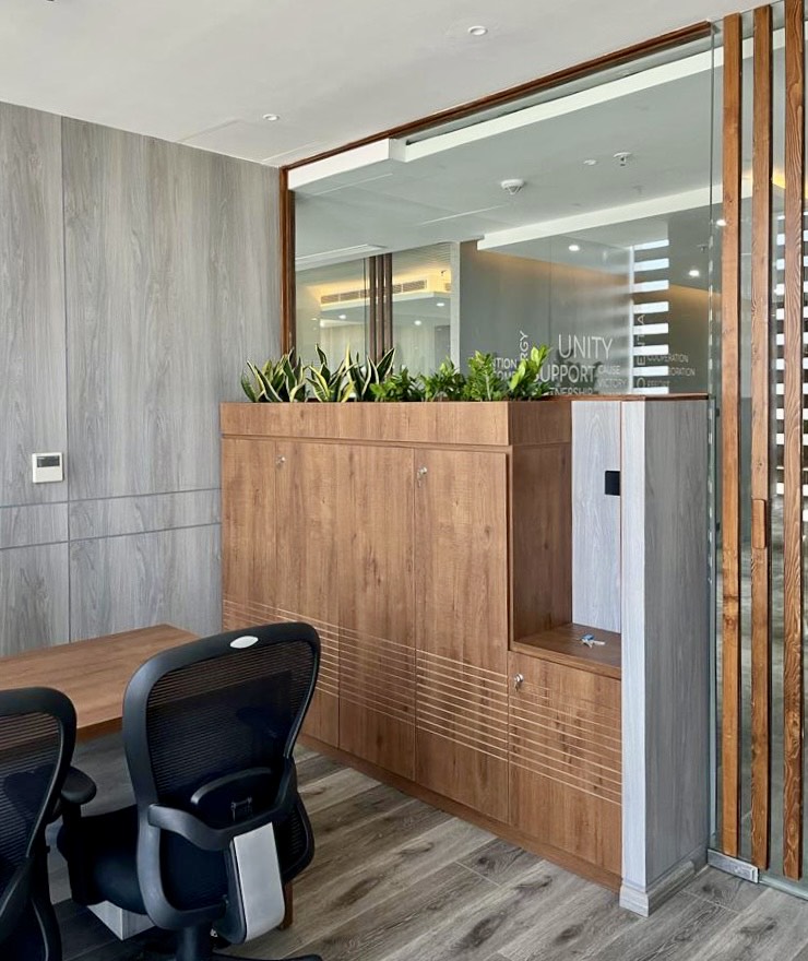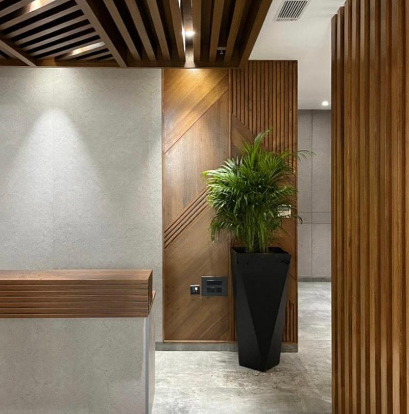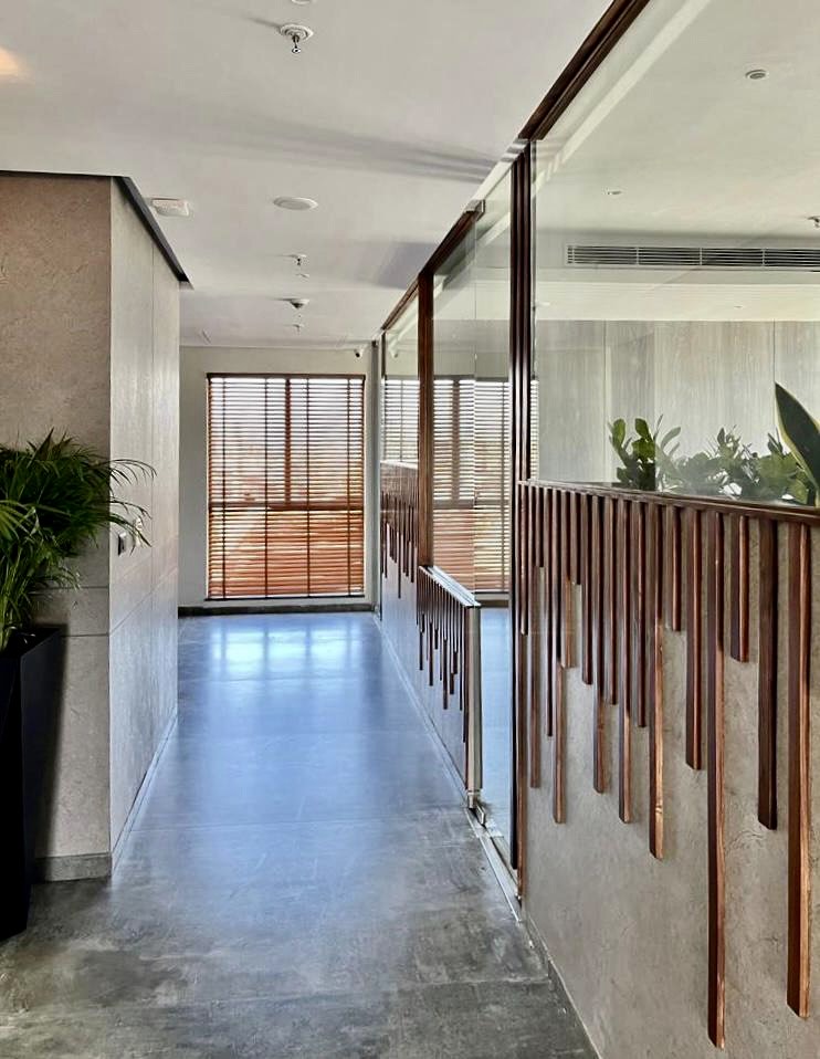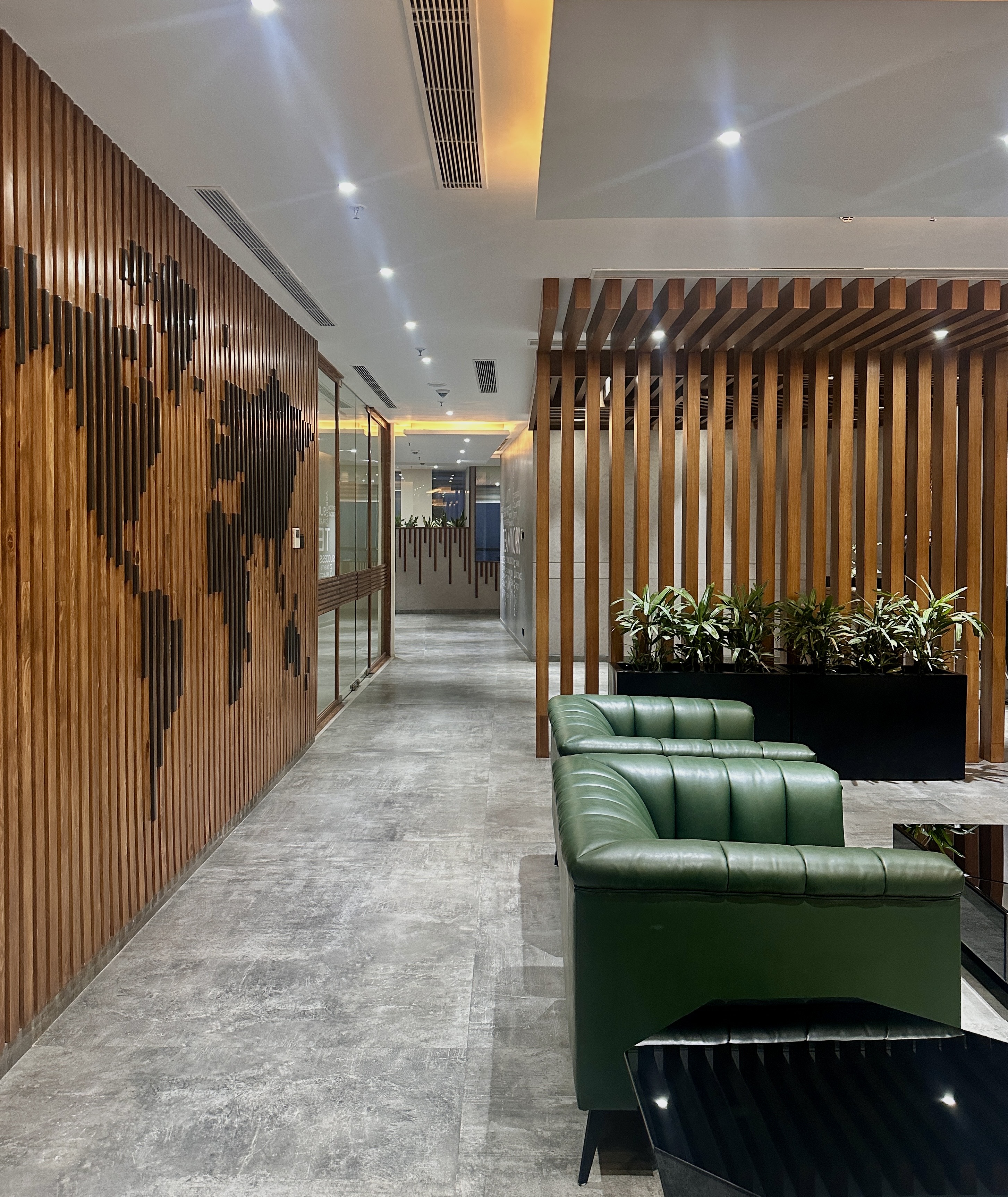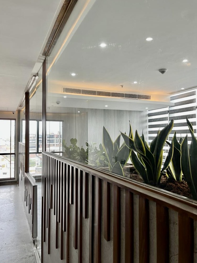 The workstation zone has partition walls which have been designed in a way allowing employees to get natural light through the glass facade of the building while also brightening the corridor space. These glass partitions have added indoor landscape and fluted wooden members of varying lengths that break the monotony of the long corridor and engages people as they walk by.