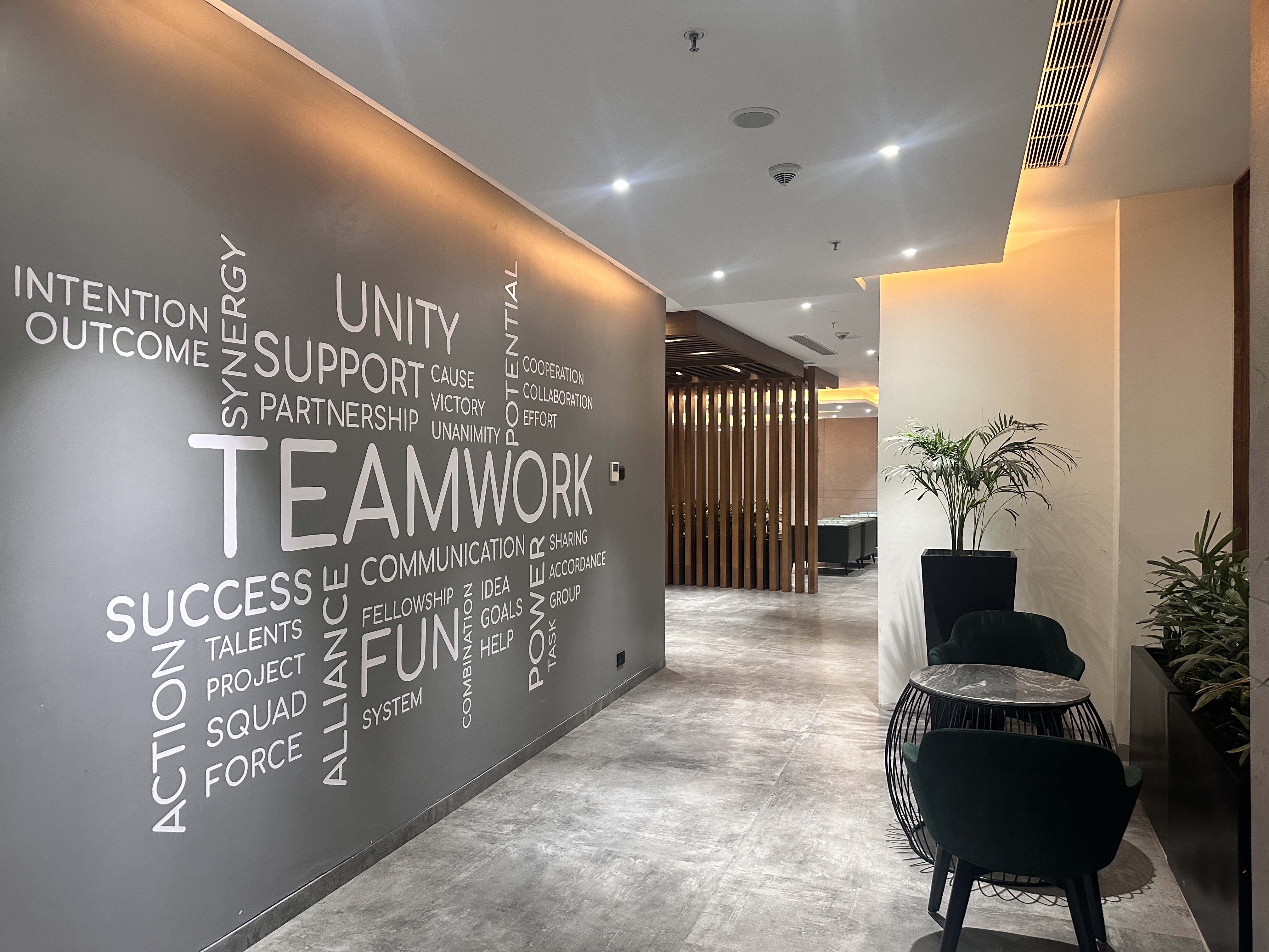 There are a few huddle spaces for employees to sit and work informally. One such space connects the workstation area and reception as people move towards the workspace zone. The space is connected by a long wall with encouraging office graphics which display the ideologies and core principles of the company, forming another highlight of this office.