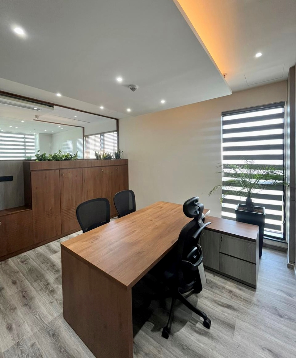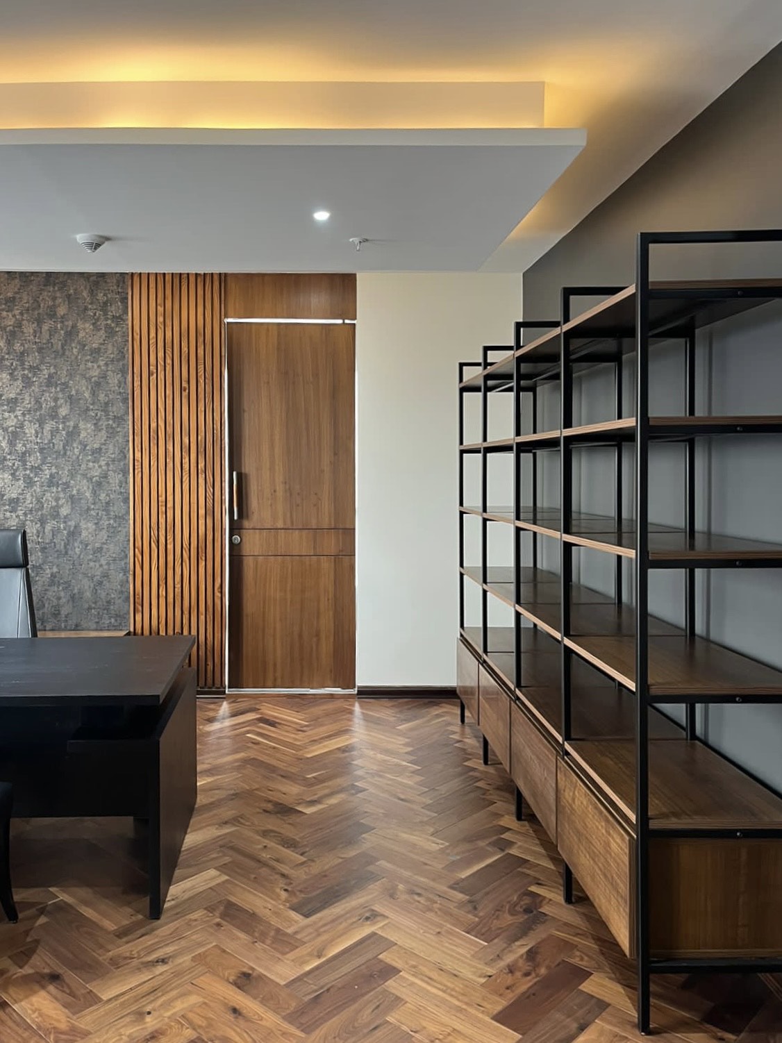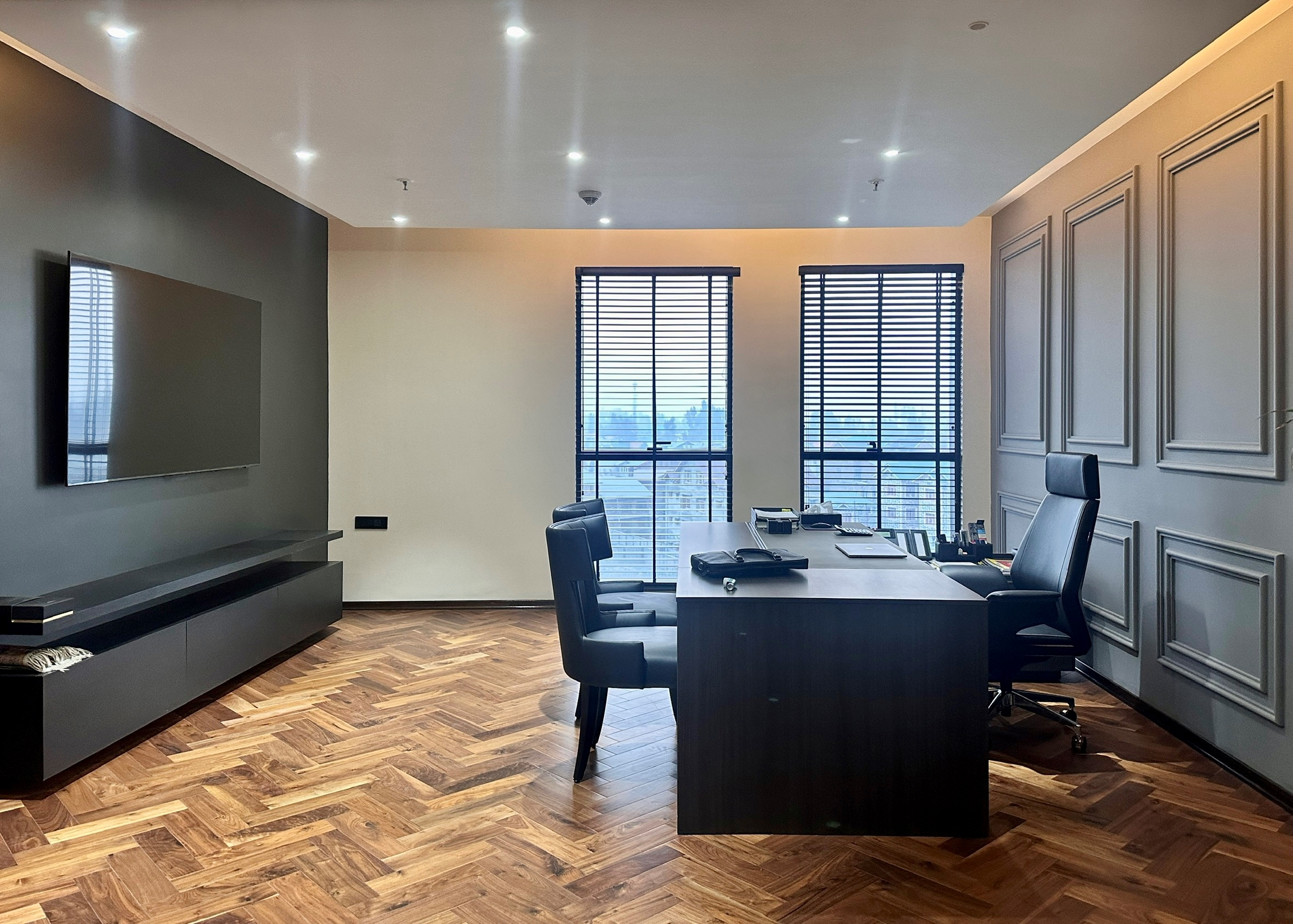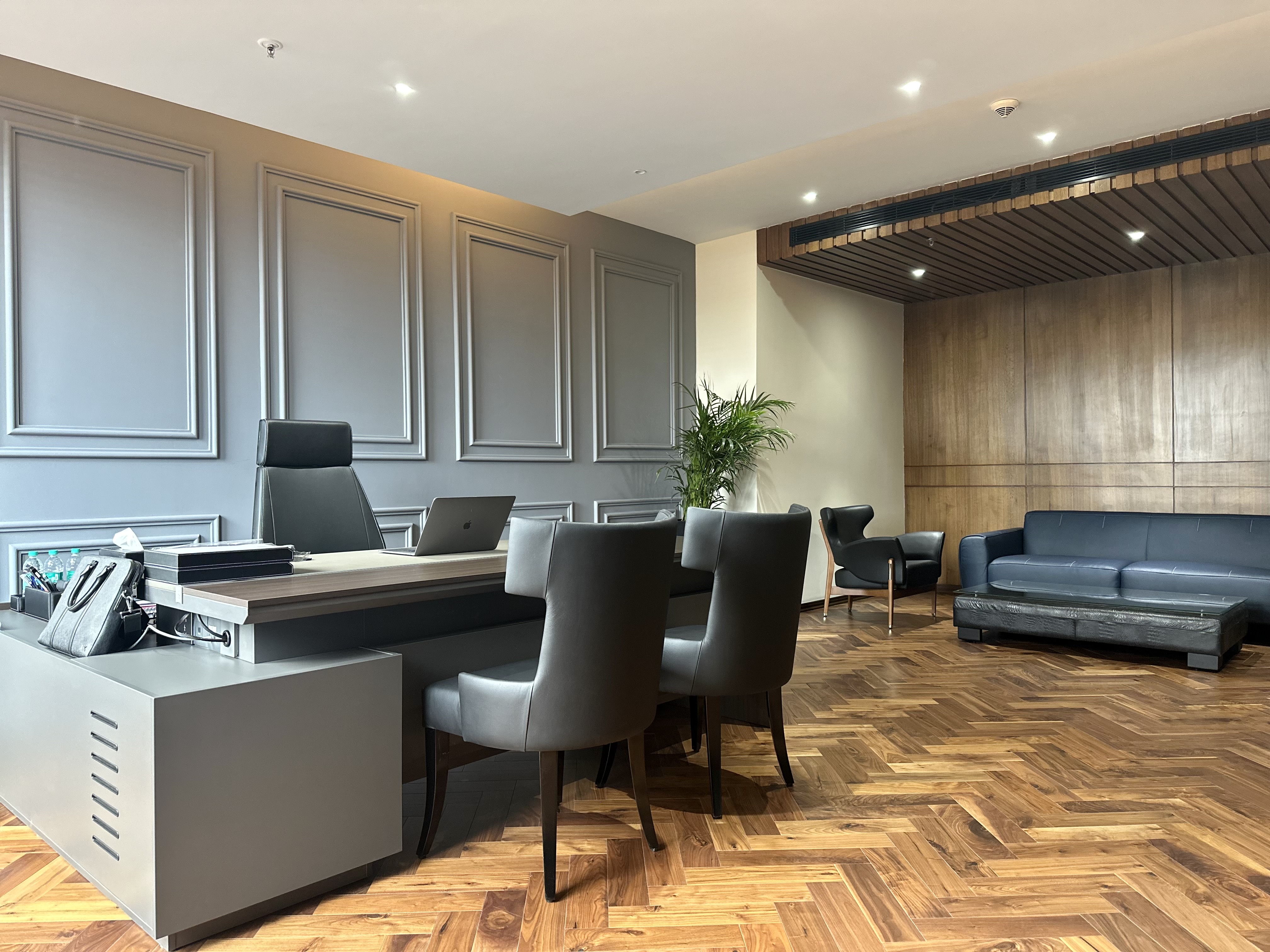 The executive cabins are predominantly formal looking with solid wood flooring in a herringbone pattern with leather furniture, exuding the feel of luxury carefully harmonized with that of warmth.