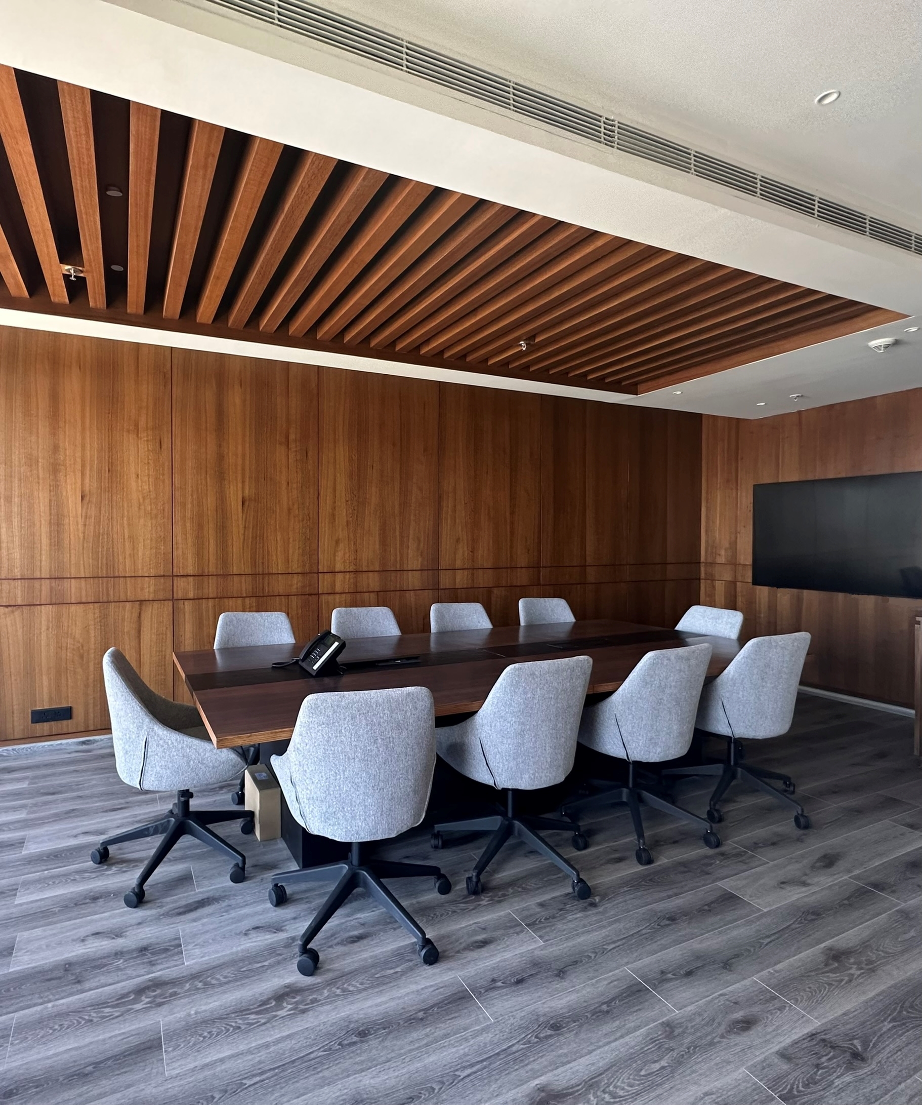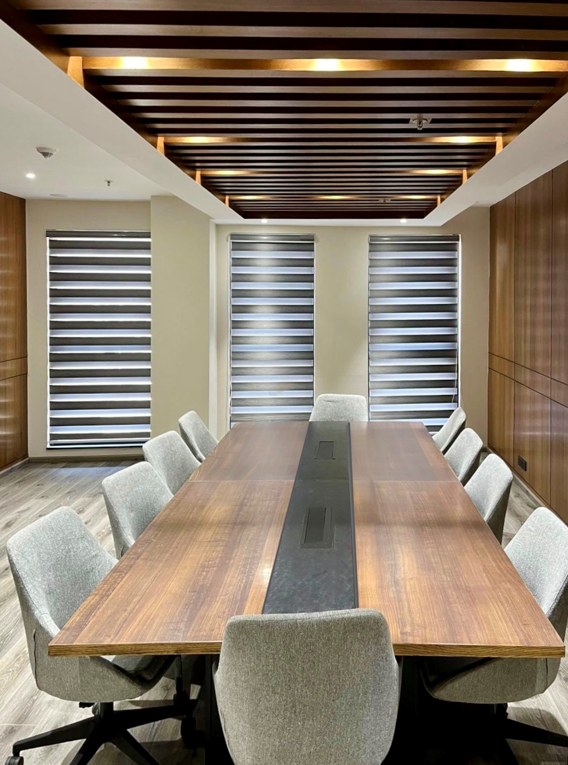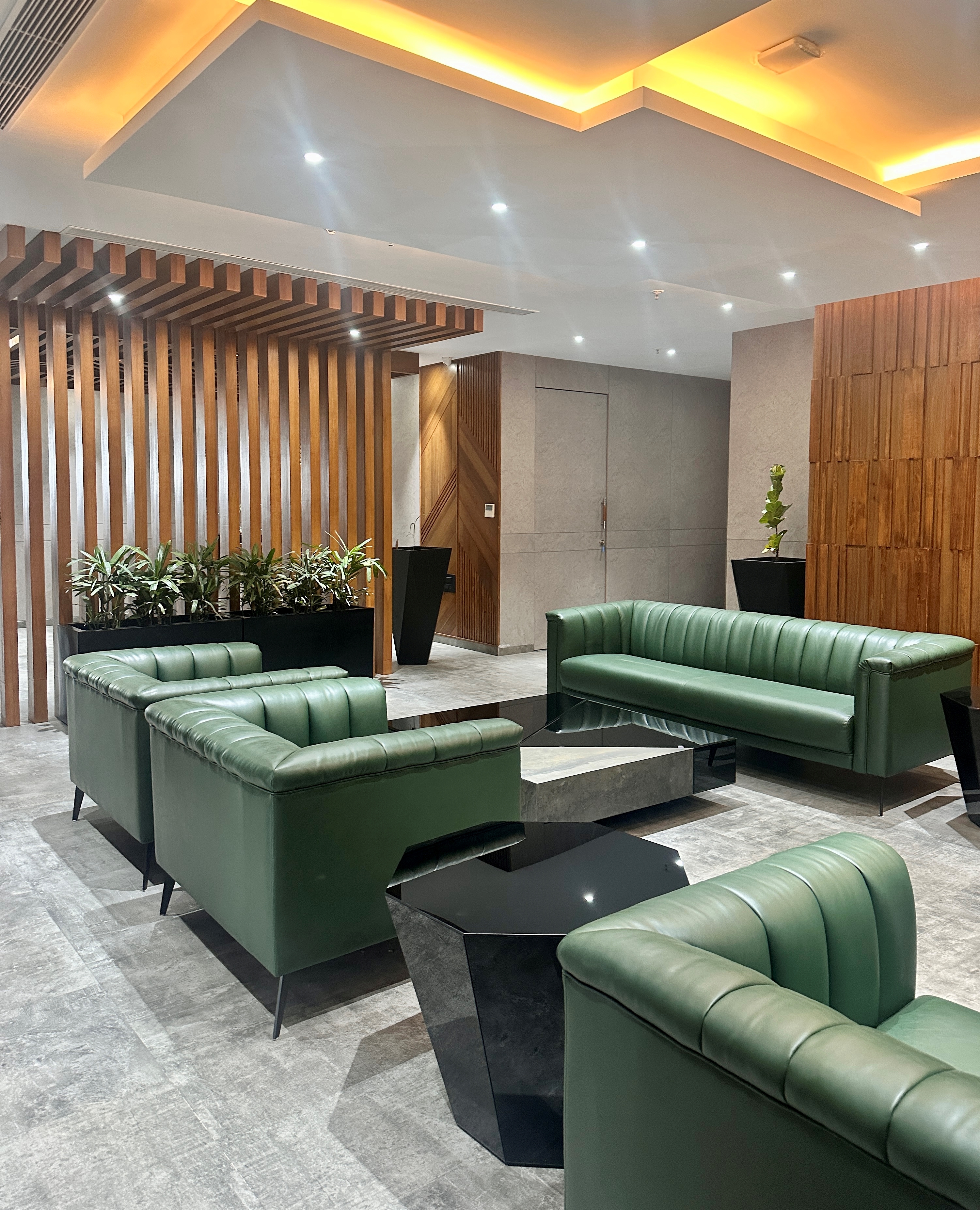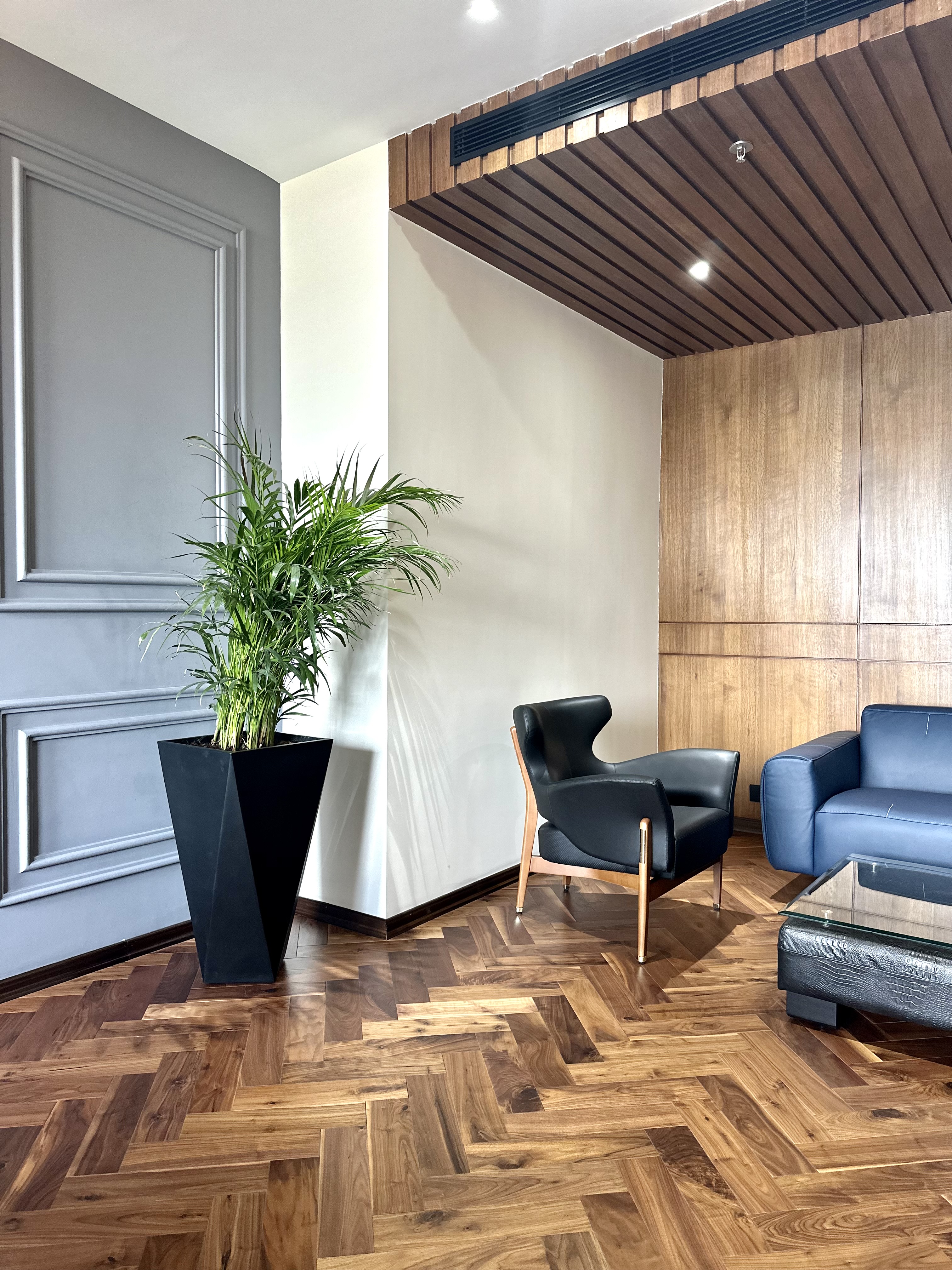 The executive cabins are predominantly formal looking with solid wood flooring in a herringbone pattern with leather furniture, exuding the feel of luxury carefully harmonized with that of warmth.
