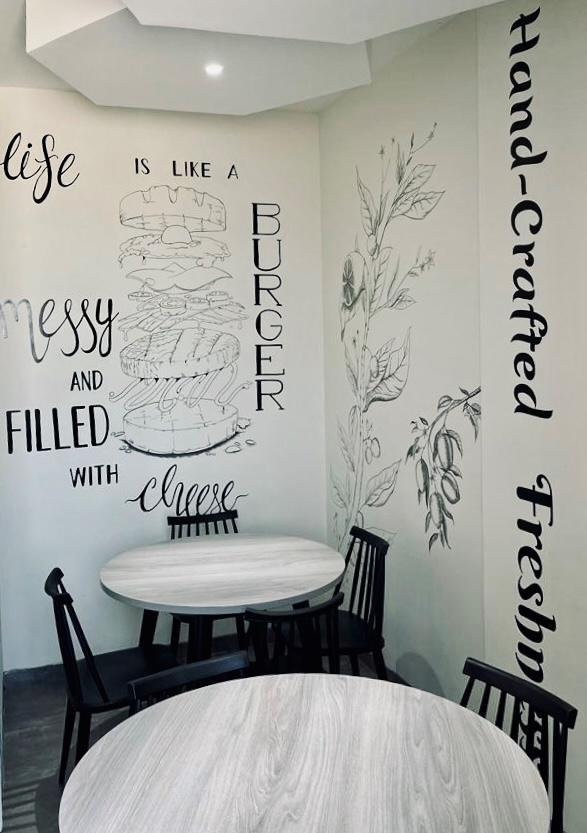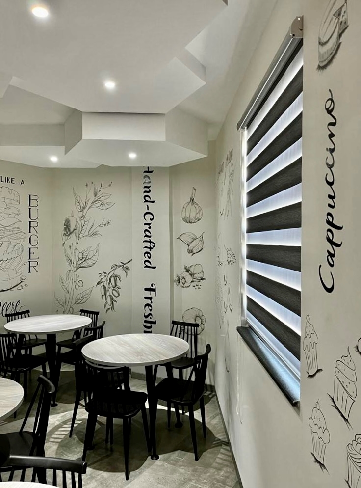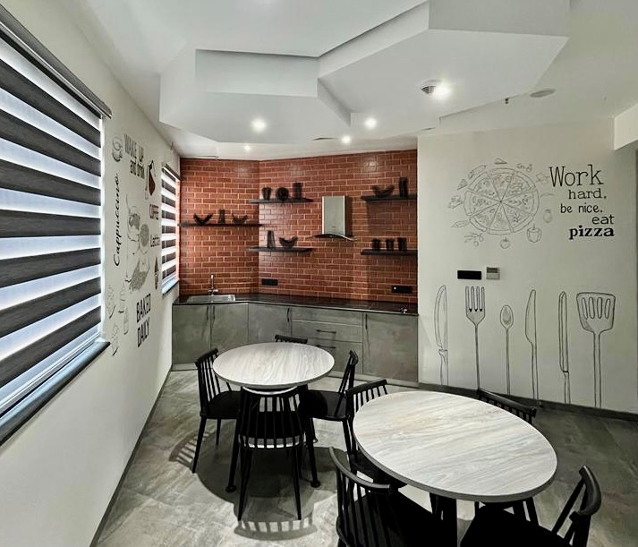 The graphics on the walls of the cafeteria, with its witty puns and catchphrases, aim to brighten the atmosphere that one can share with work family replacing the conventional format of an office kitchen.