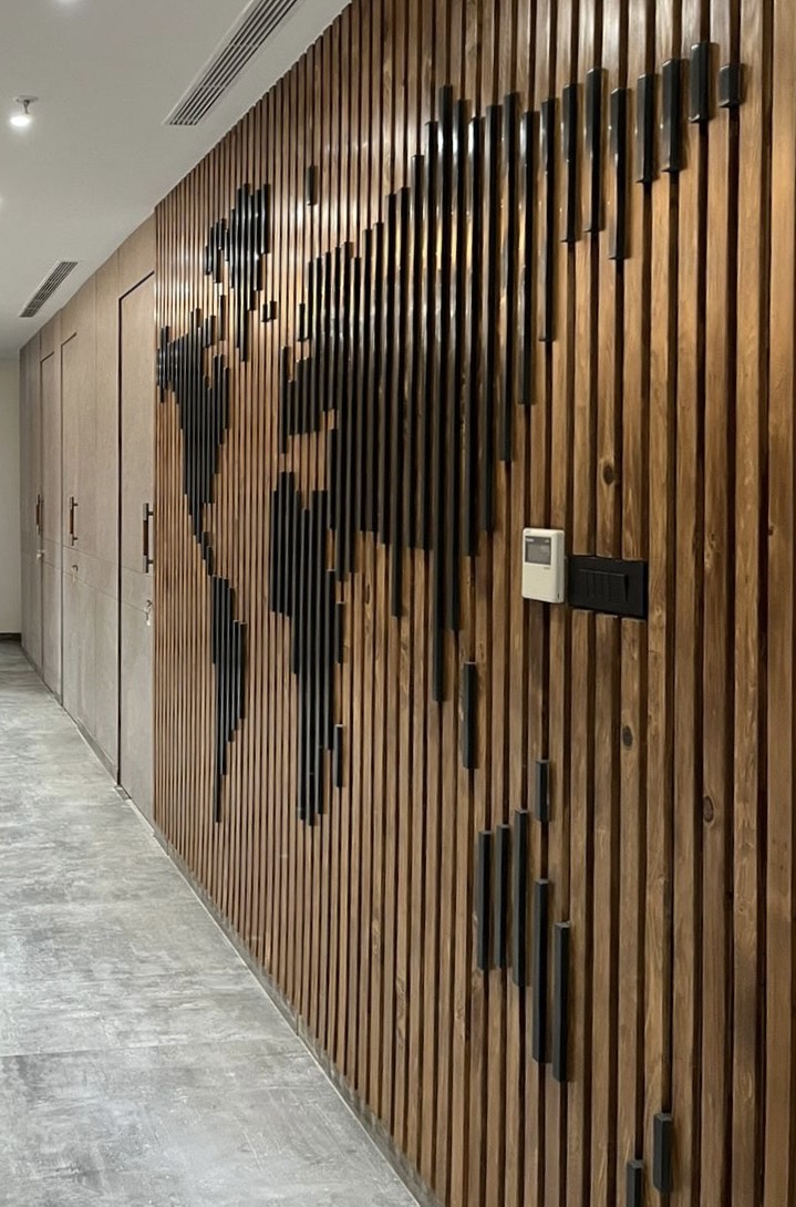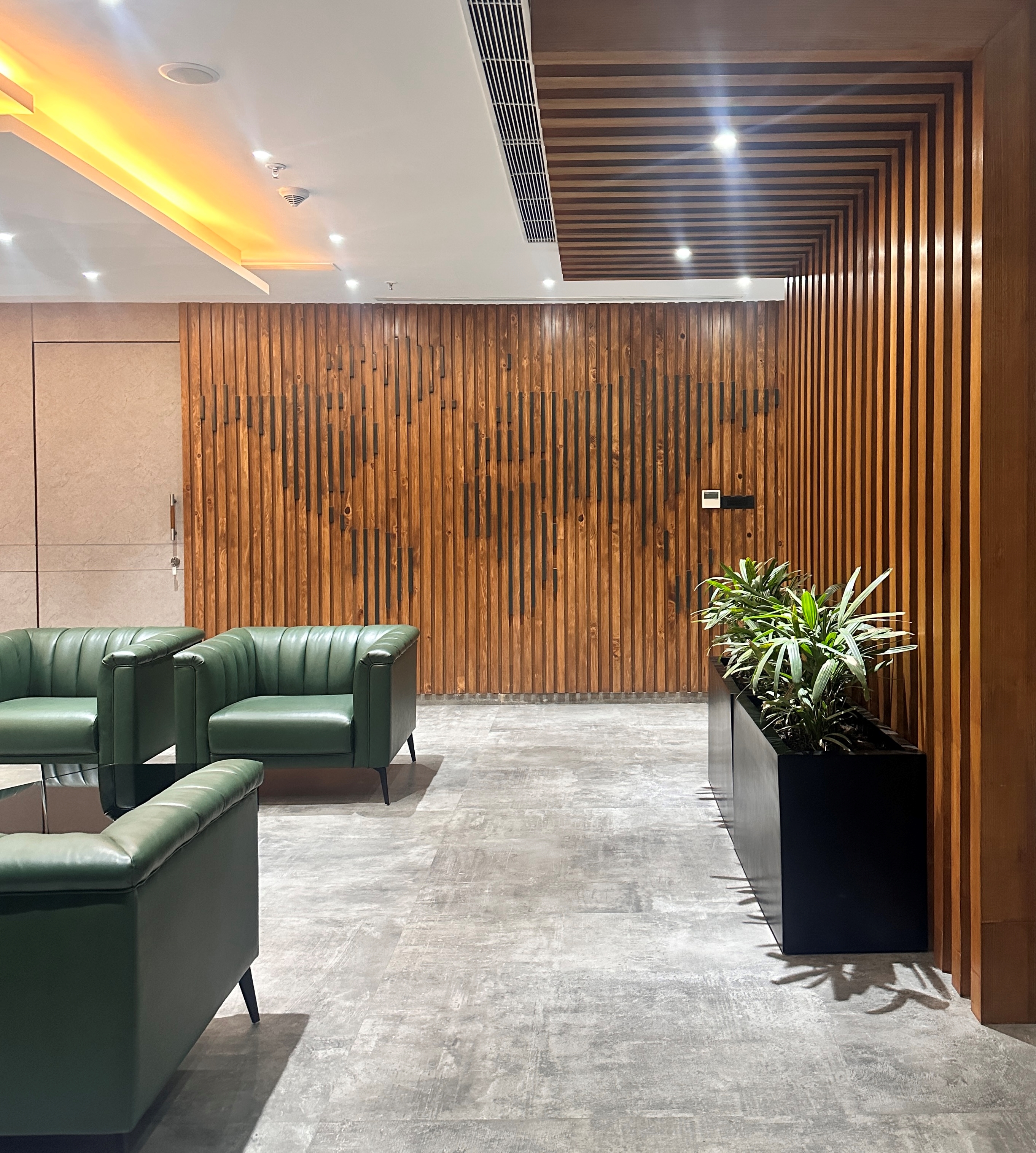 The large glass entrance door makes the office porous and inviting for visitors as they land in the reception area that boasts of rich wood, a material highly quintessential to Kashmiri interiors. The reception area is separated from the waiting lobby by a wooden screen. The large waiting area has ample seating and luxe feel with some feature walls to engage the visitors during waiting hours. One of the highlights in this zone is the world map wall, uniquely designed and crafted, which depicts the international and global standard of business the company is into. The central waiting area then branches out in four different directions leading to the executive cabins for directors, the service zone having restrooms and cafeteria for staff, and the server room and workstation area where different rooms are dedicated to various departments of the company. The layout of the office space clearly divides the different zones based on degree of publicness, such as the accounts section limited to access for outsiders and HR section conveniently located with a waiting area of its own.