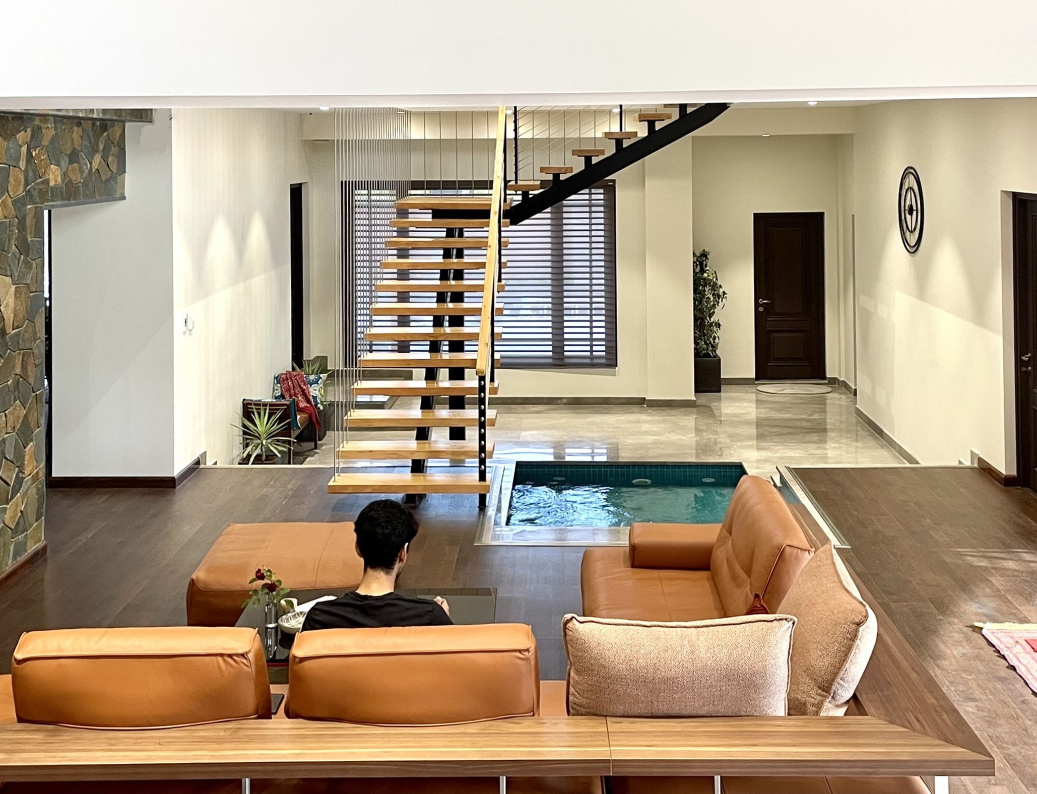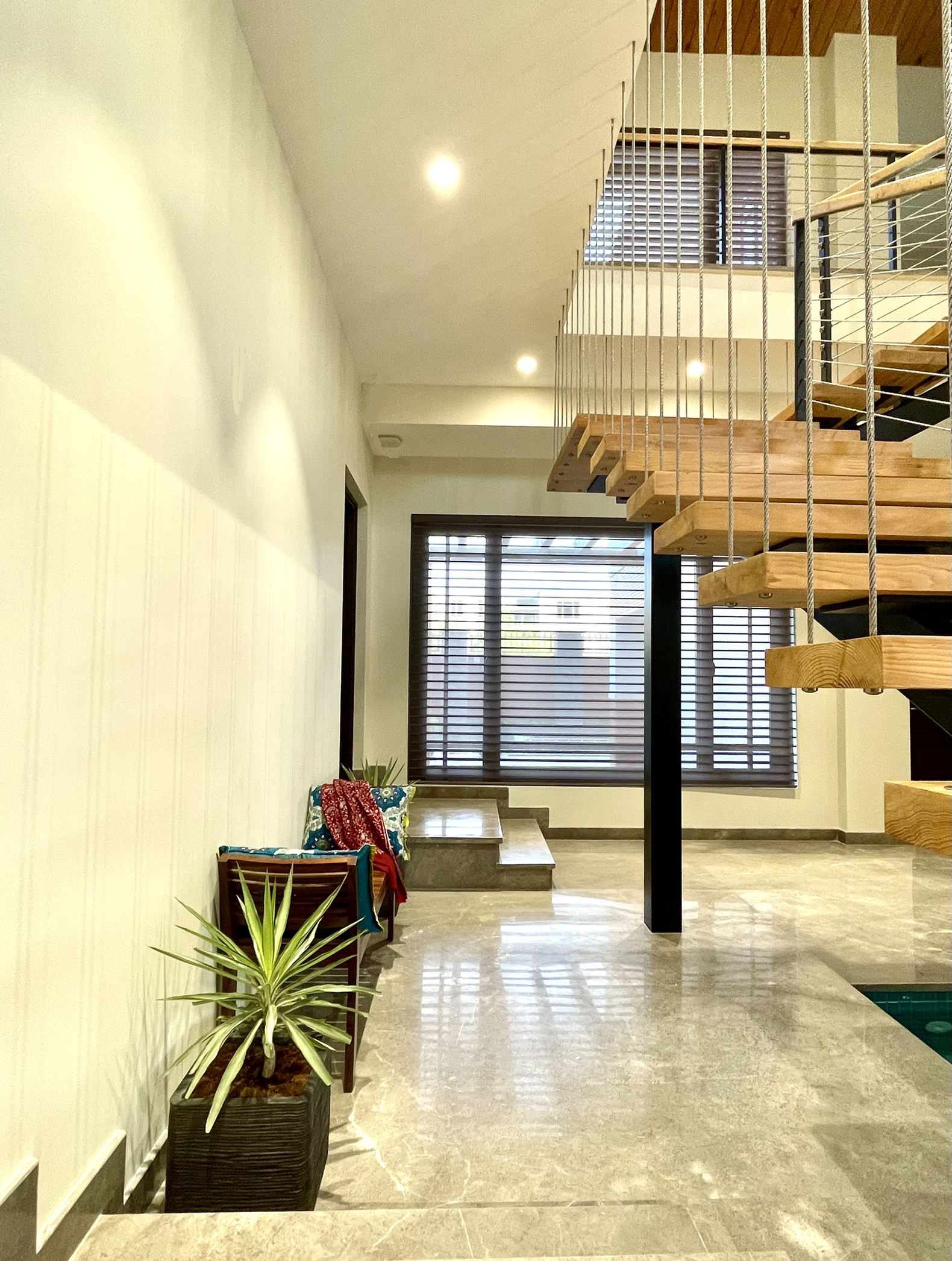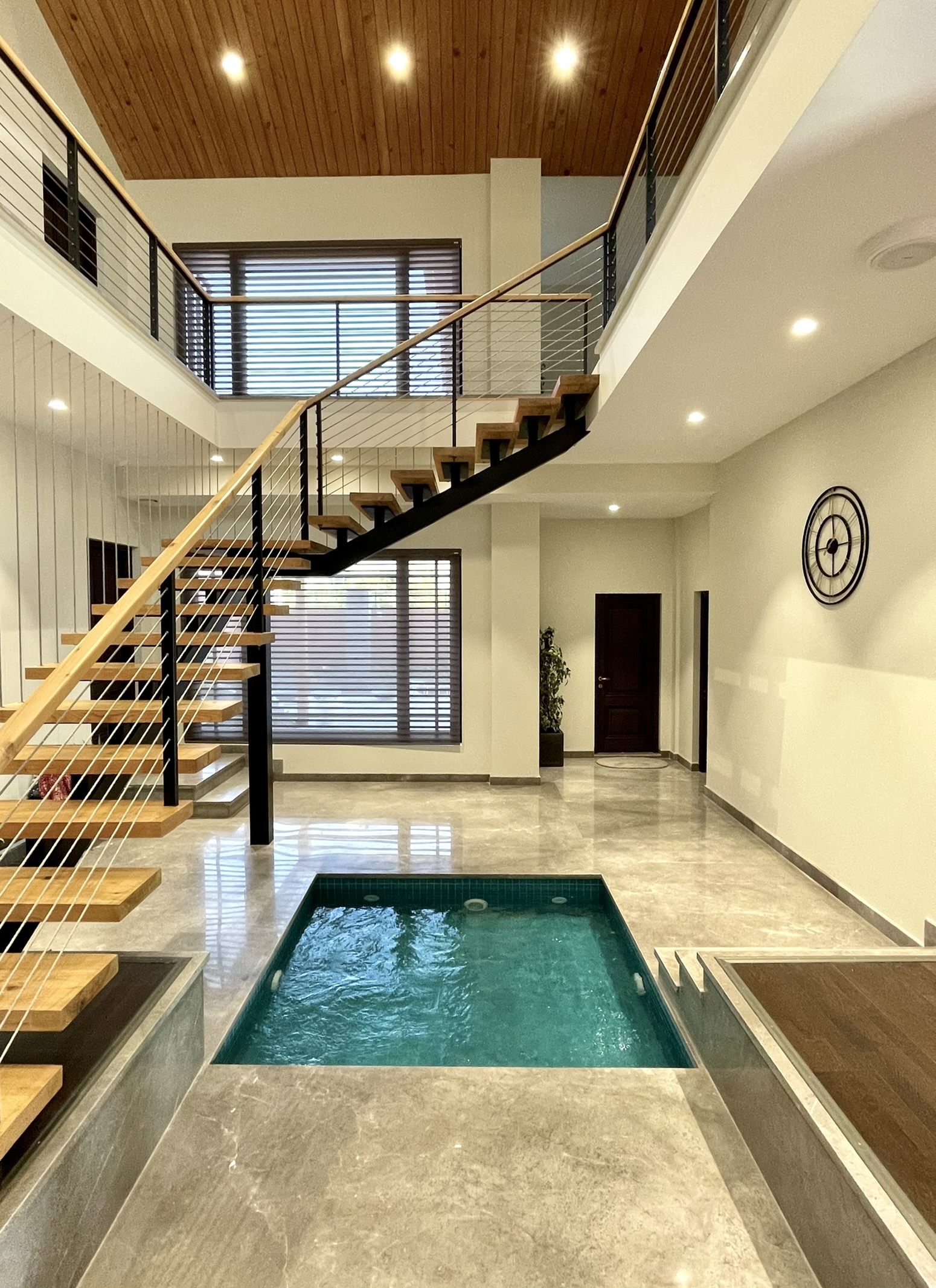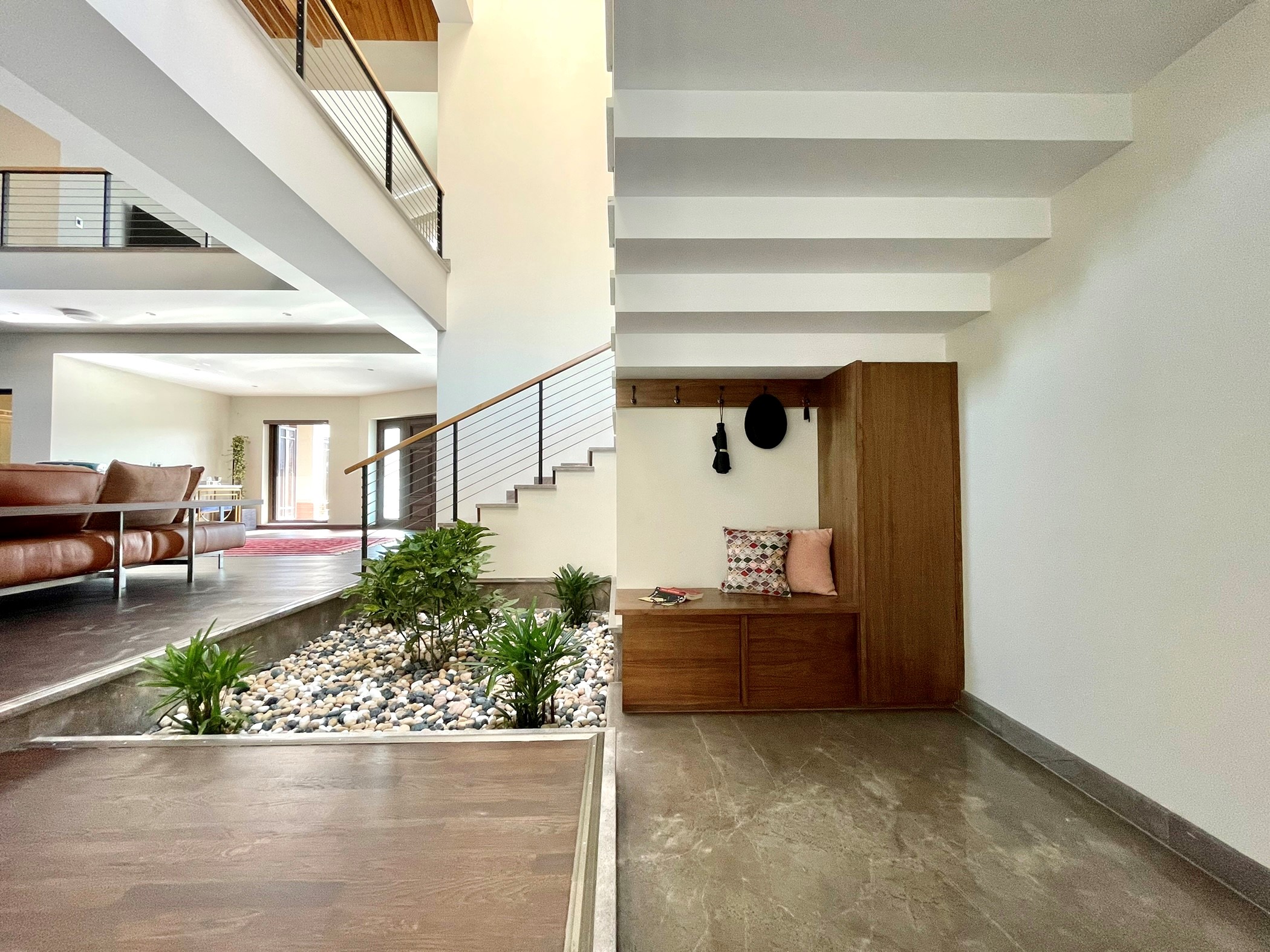 The whole house actually stimulates your senses and has a multisensory experience where we feel the tactility of natural materials like that of wood and stone. The sound of water from the water body in the living area is no less music to one’s ears. The fragrance of plants and indoor landscape is a refreshing feeling. The visual experience through interiors and aesthetics of the house goes as a default.
