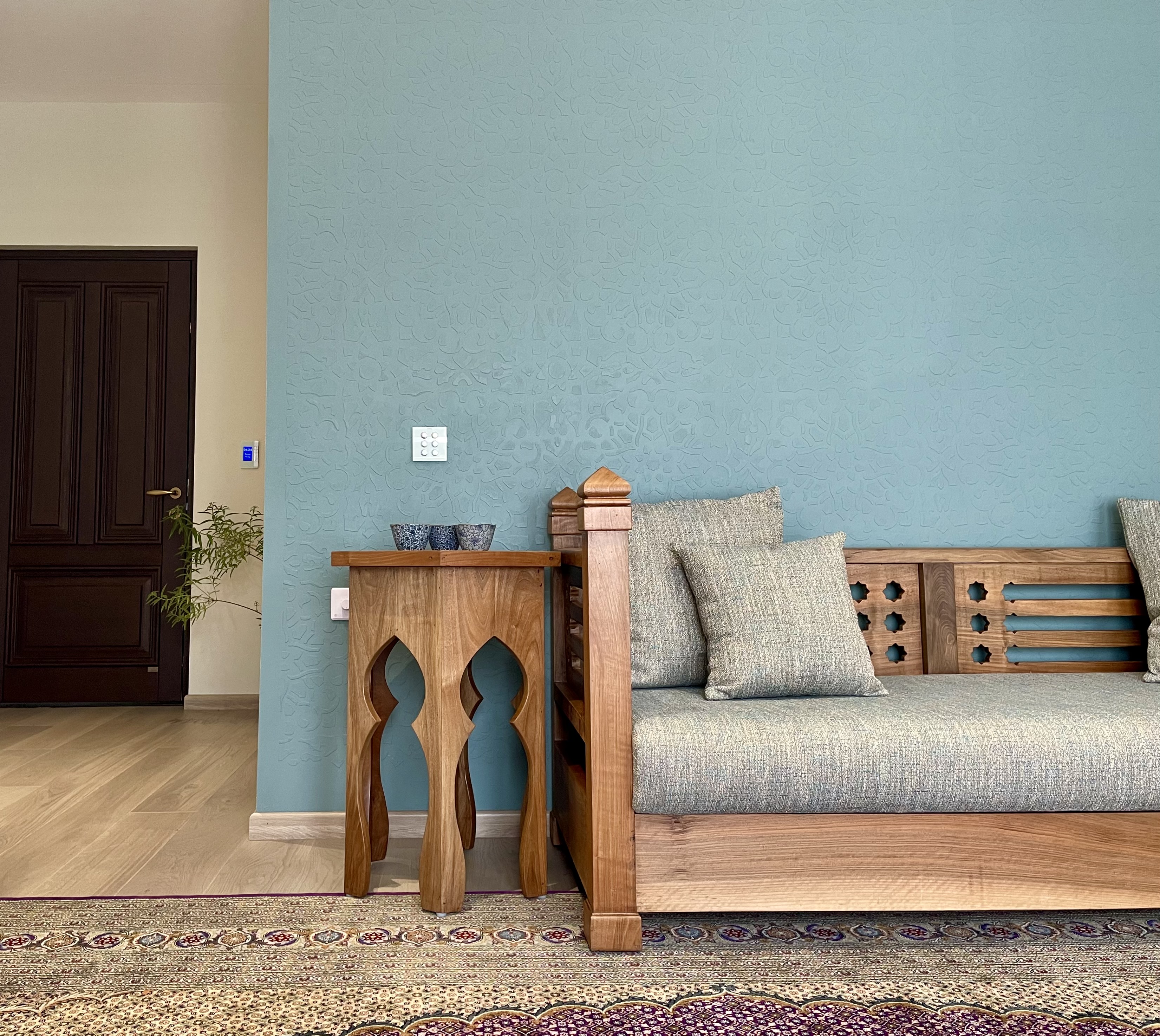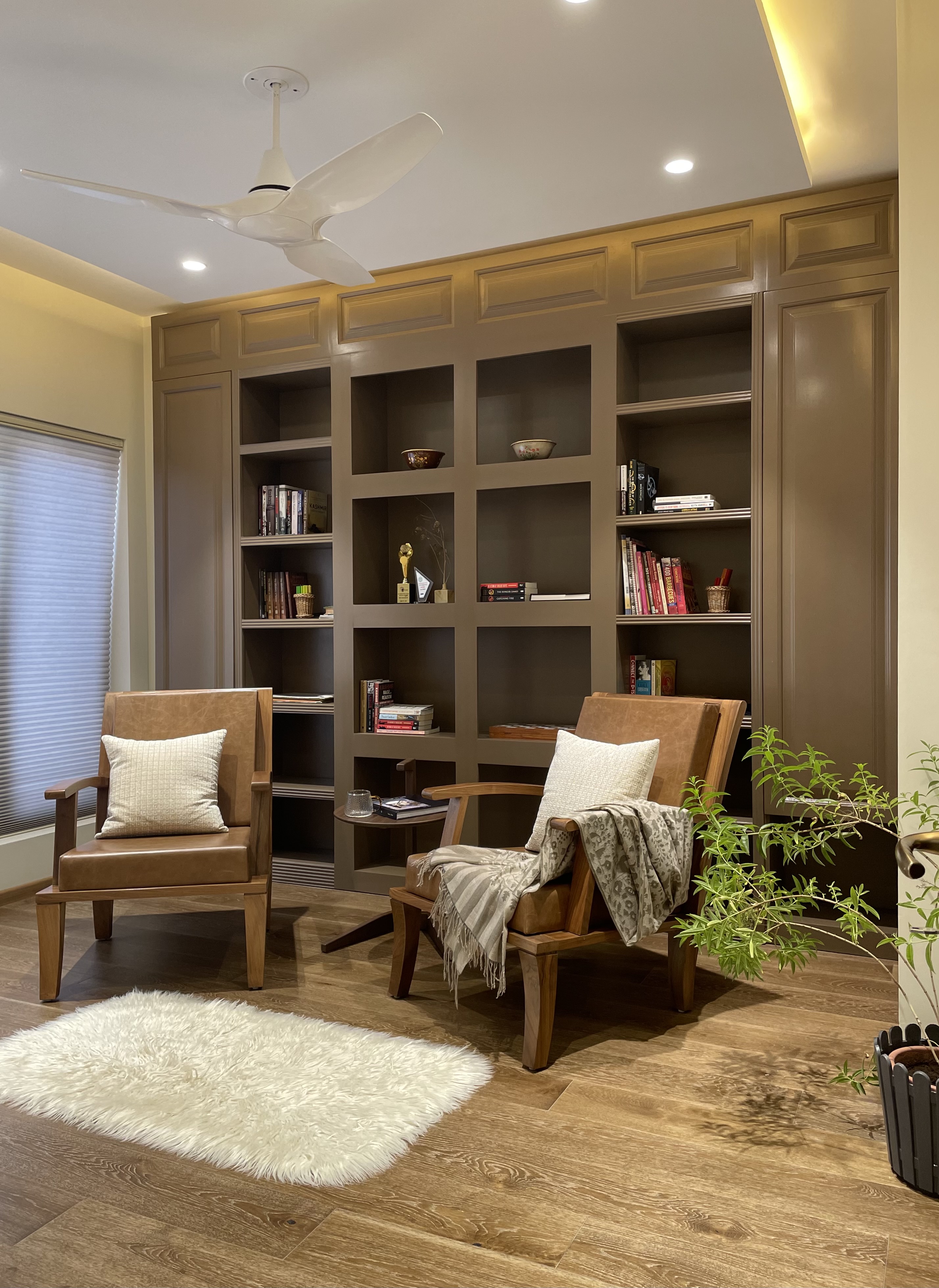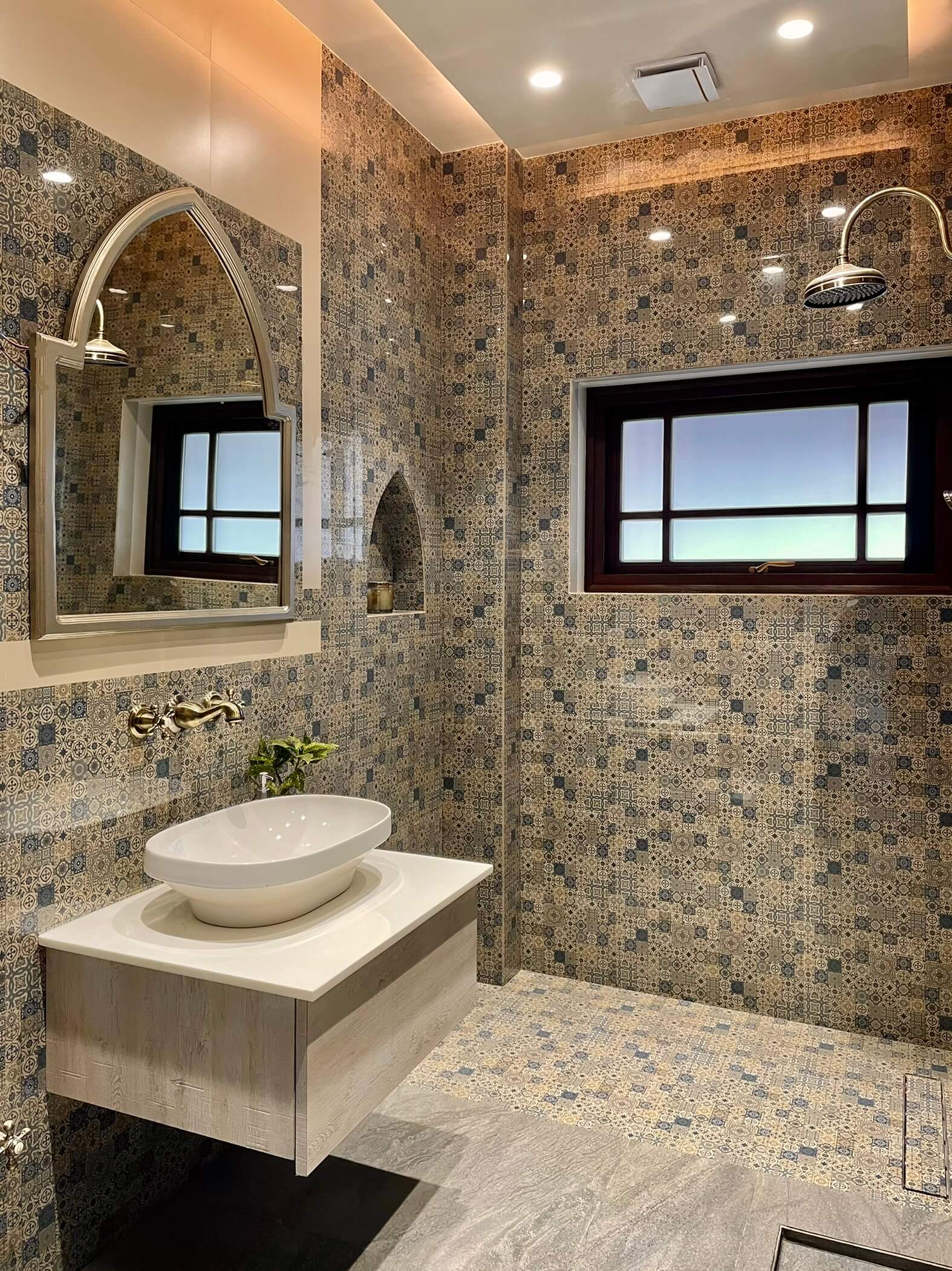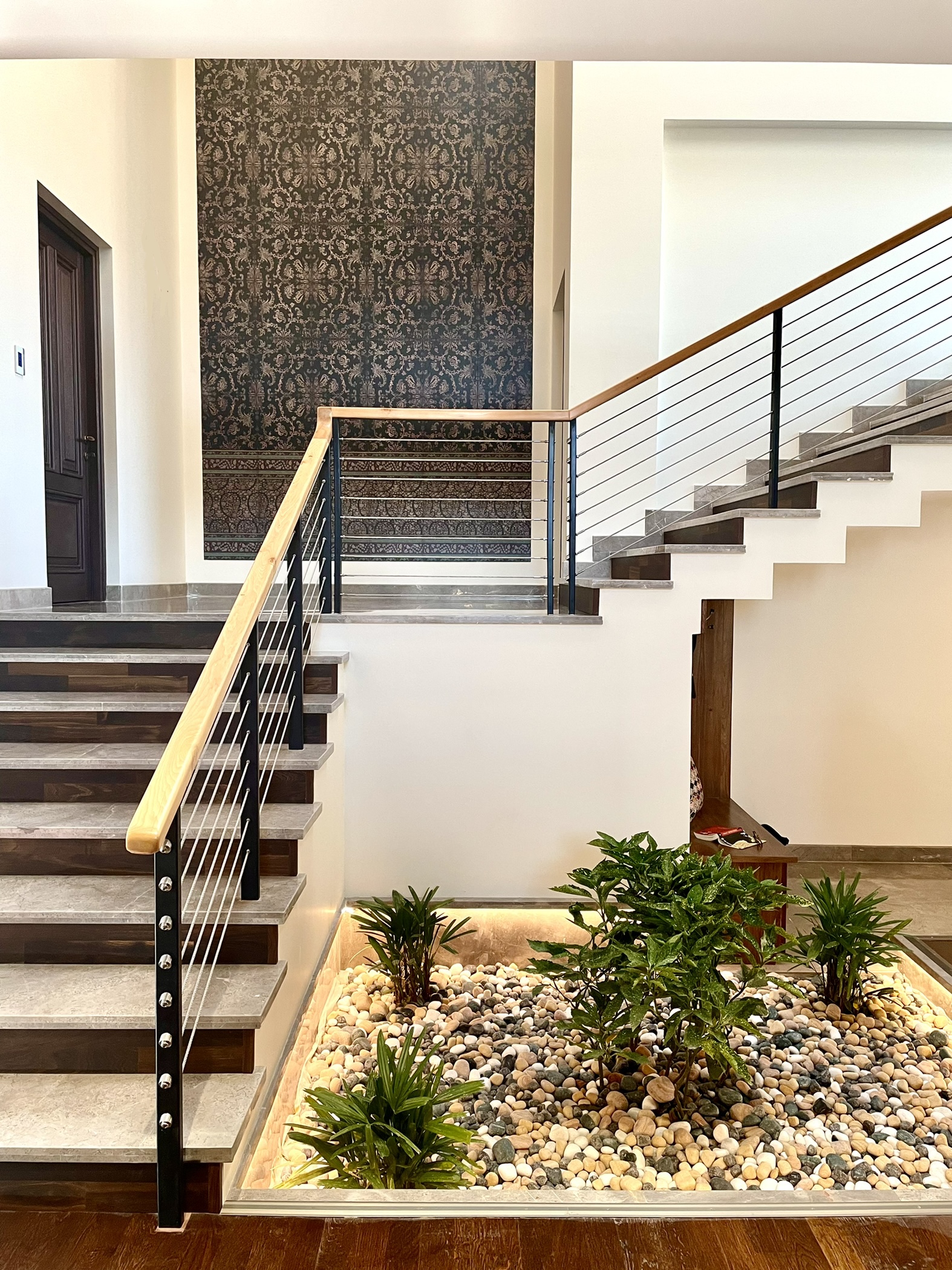 There is an intermediate level between ground floor and first floor that has a guest bedroom to separate it from main bedrooms on the first floor and has a study/home office. This mid landing space has a wall that contributes as another highlight of the house. The double height wall has a Kashmiri jamawar shawl design on wall cladding with skylight in the roof that accentuates the beauty of this highlighter wall. The idea of having modern house with elements of traditional roots is something that was there since inception of design.