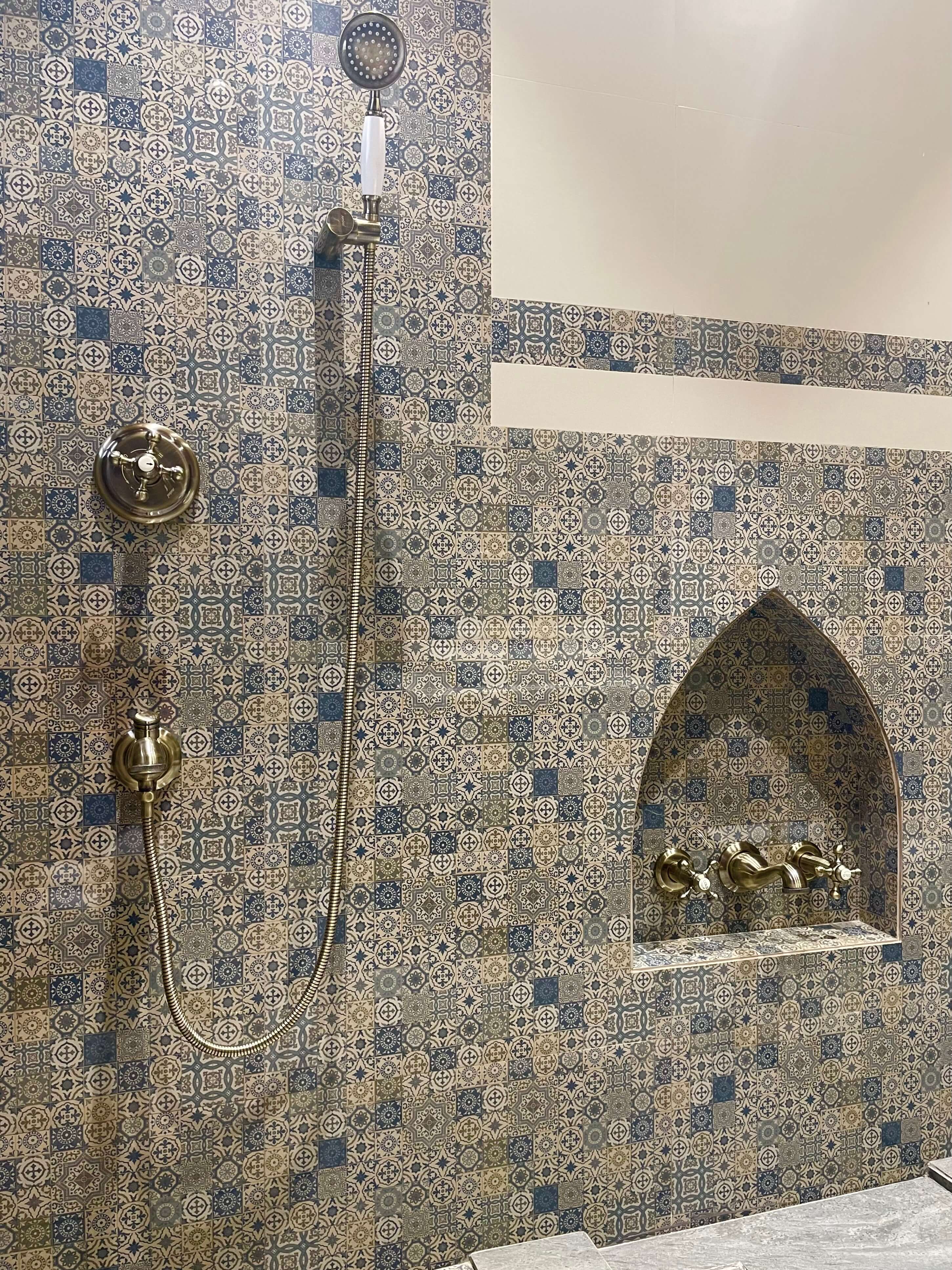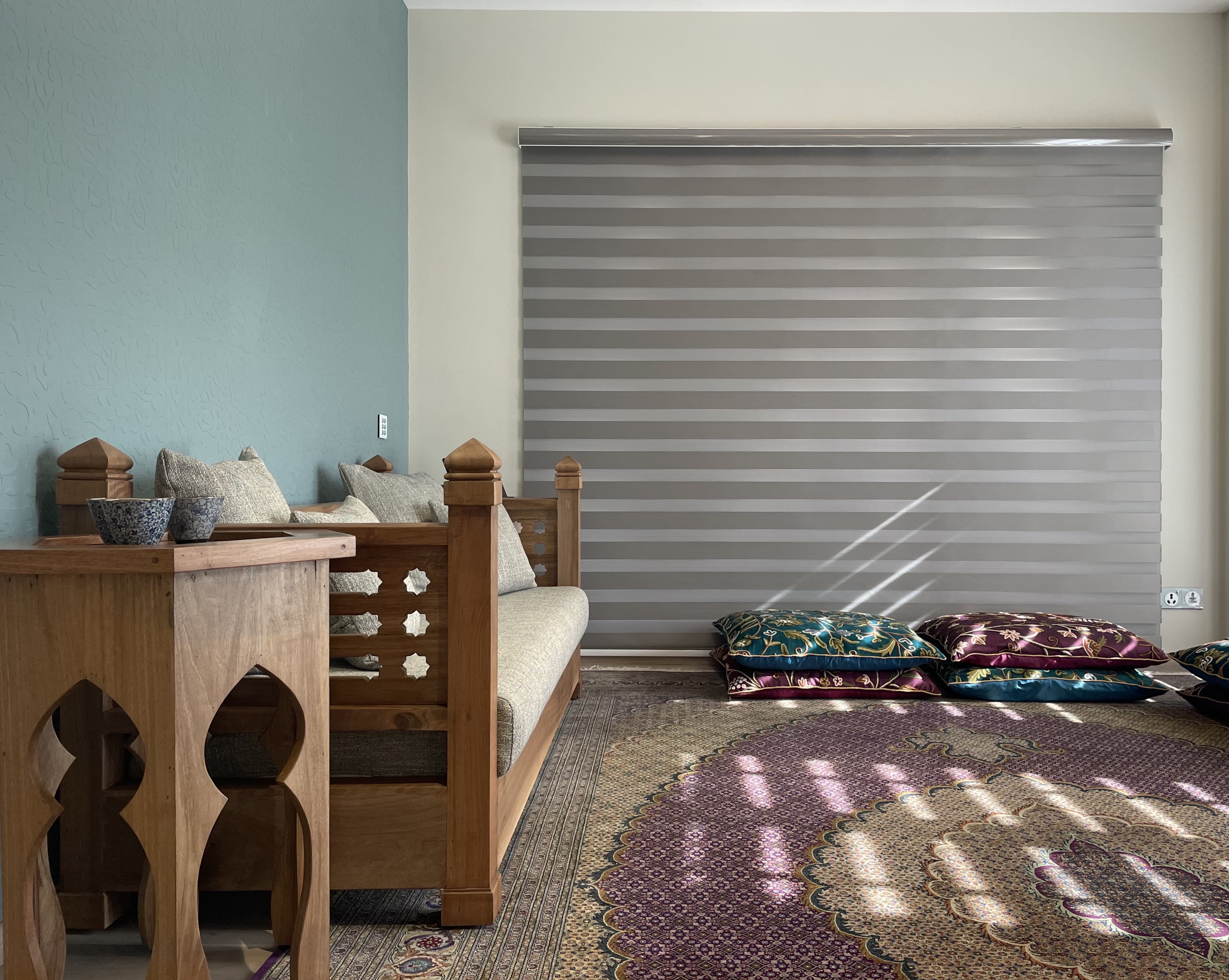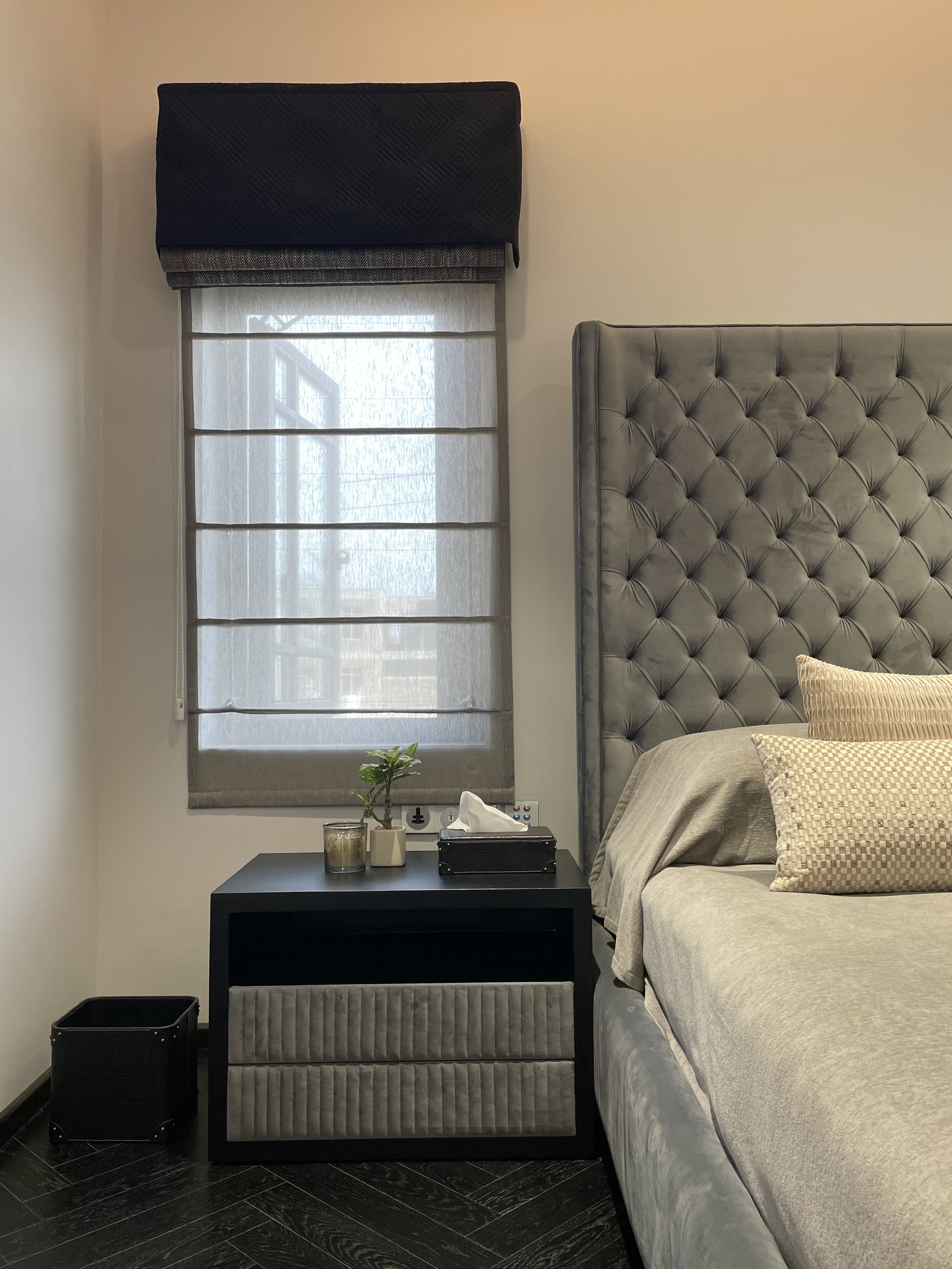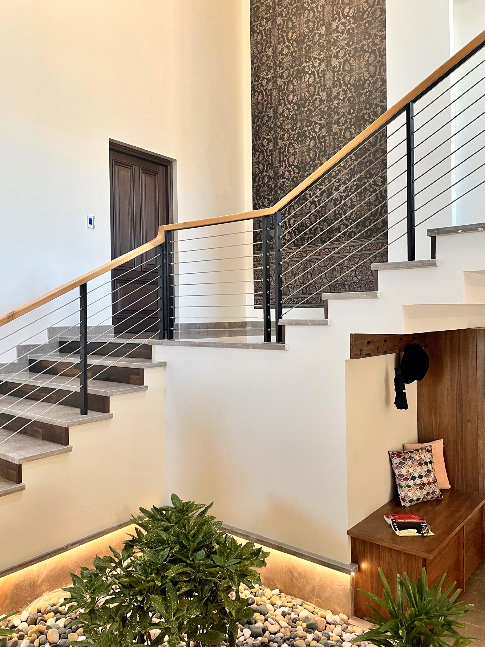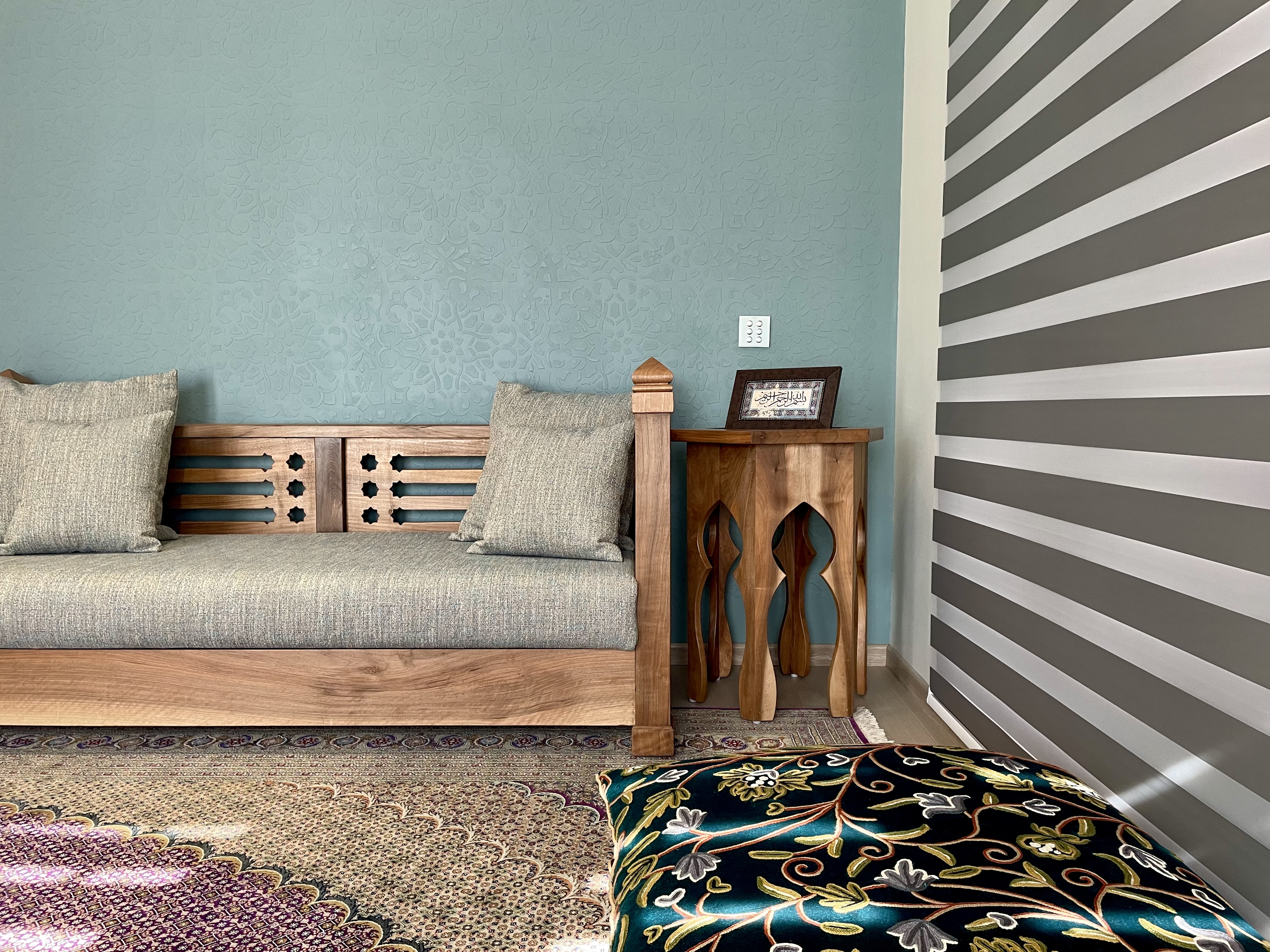 There is an intermediate level between ground floor and first floor that has a guest bedroom to separate it from main bedrooms on the first floor and has a study/home office. This mid landing space has a wall that contributes as another highlight of the house. The double height wall has a Kashmiri jamawar shawl design on wall cladding with skylight in the roof that accentuates the beauty of this highlighter wall. The idea of having modern house with elements of traditional roots is something that was there since inception of design.