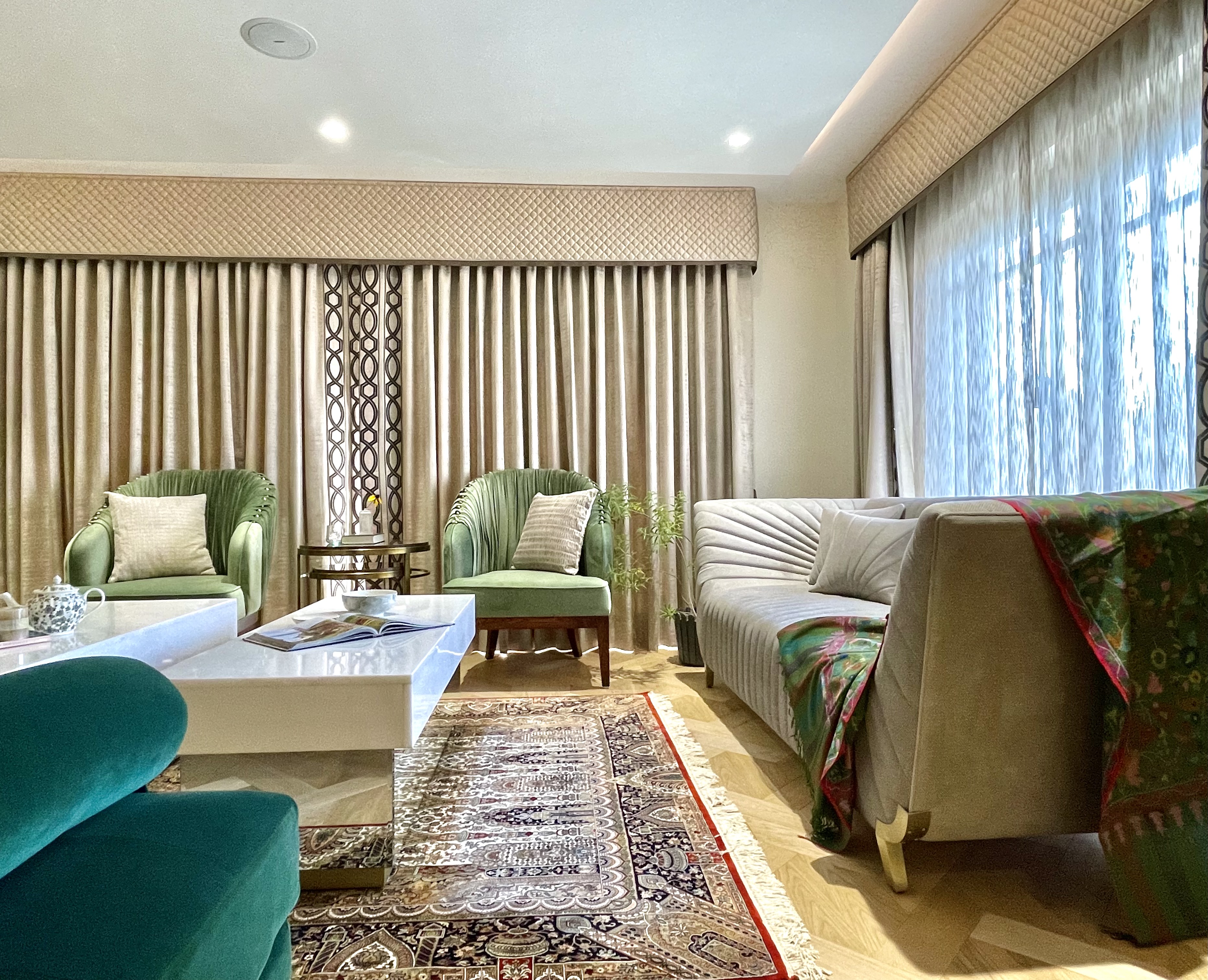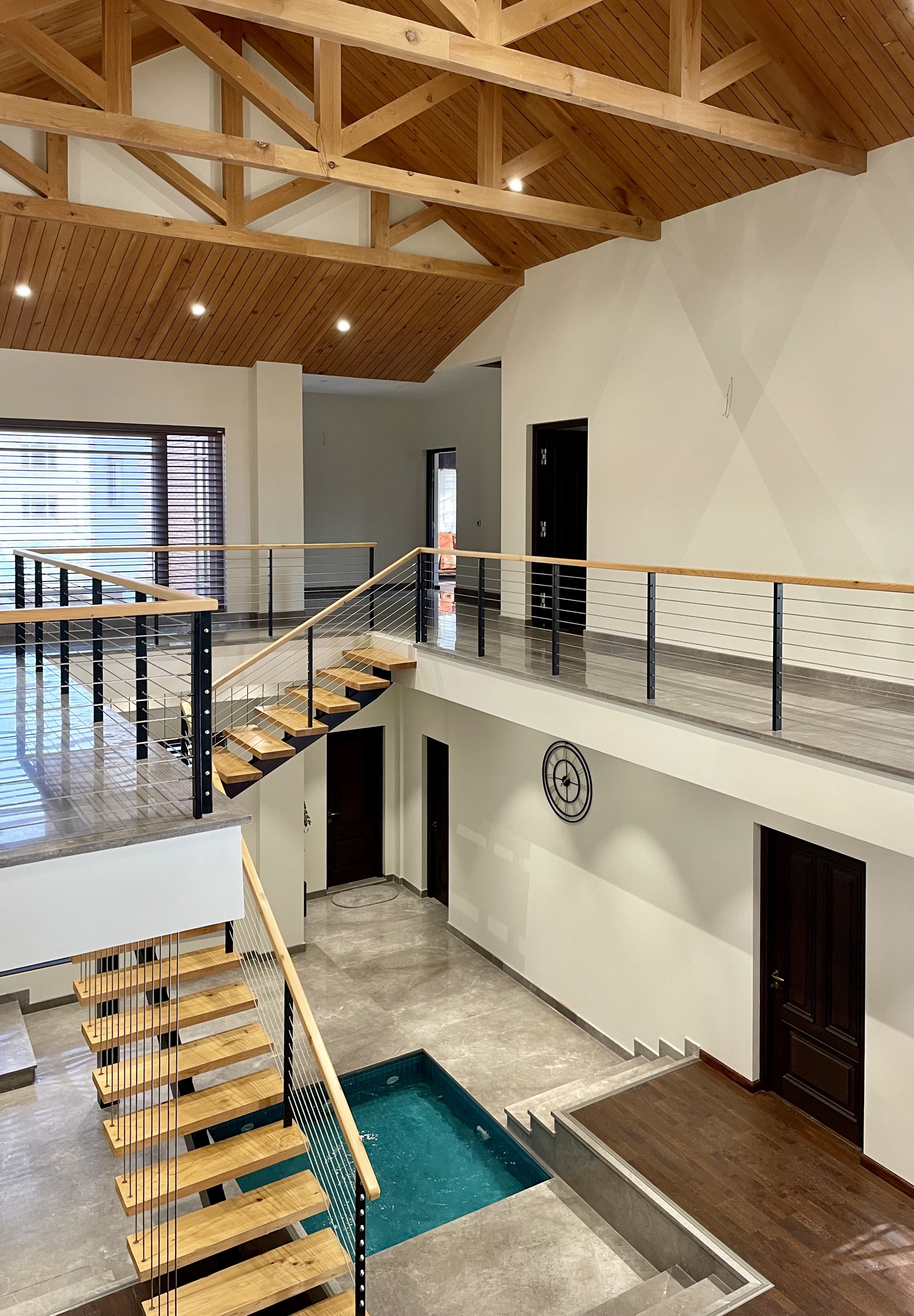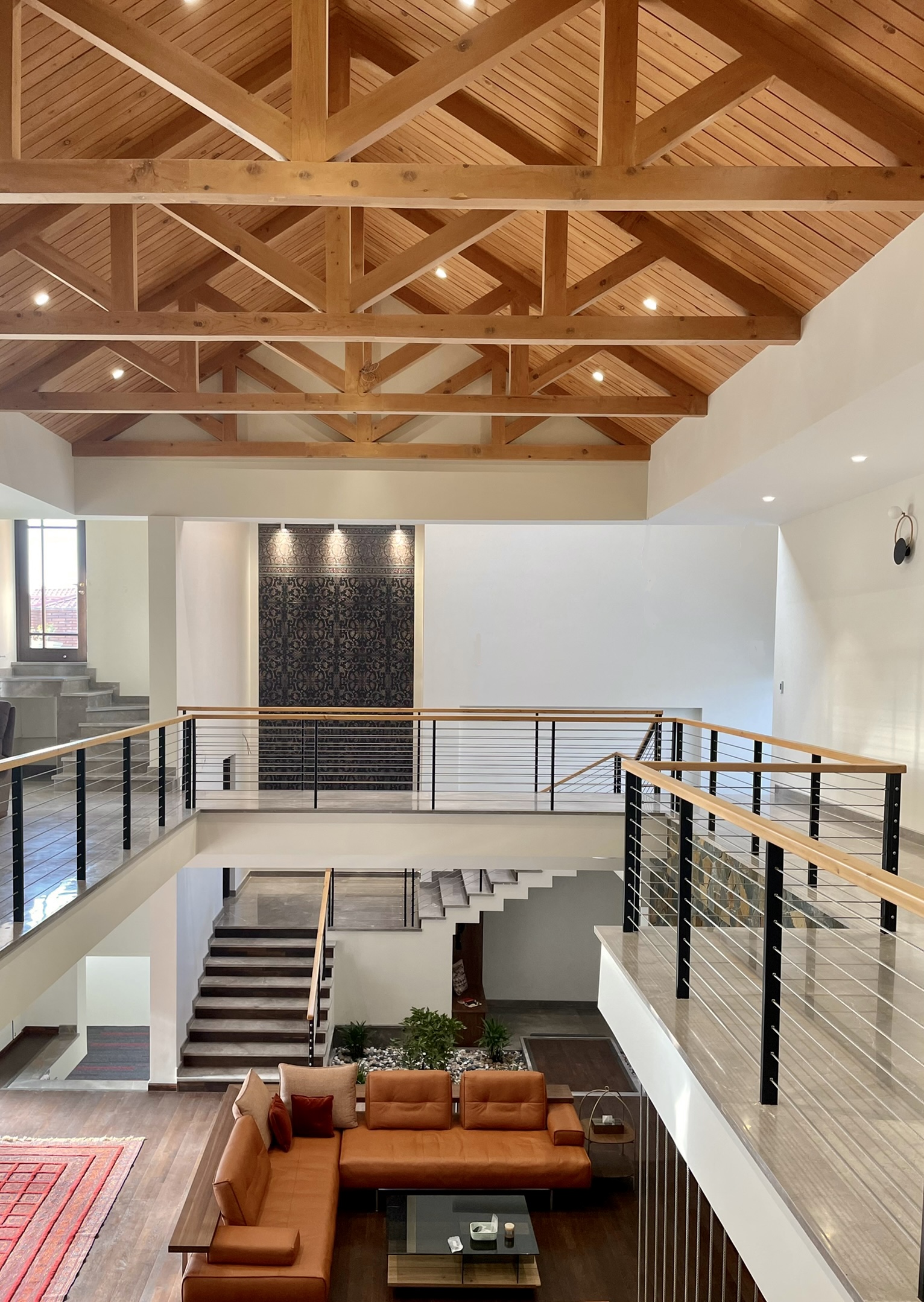 The concept revolves around creating a dialogue between the building and the landscape by providing multiple inside-outside connections through large windows, transitional spaces, decks and terraces. Exposed timber trusses and large volumes of double-height family areas add to the grandeur of this house. All throughout this large house, a visual connection is maintained to keep the interaction amongst the users alive. Keeping the harsh cold climate of Kashmir in mind, sustainable strategies to combat cold weather are adopted like insulated cavity walls, floor heating etc. This house has a large double-height living area with exposed timber roof and an overlooking family area on the first floor. The basement is in two levels which houses the gym, home theatre and a large hall used for gatherings and functions. The ground floor has a formal drawing room, a prayer room, kitchen and a dining room that opens to a deck with a place for barbeques.
