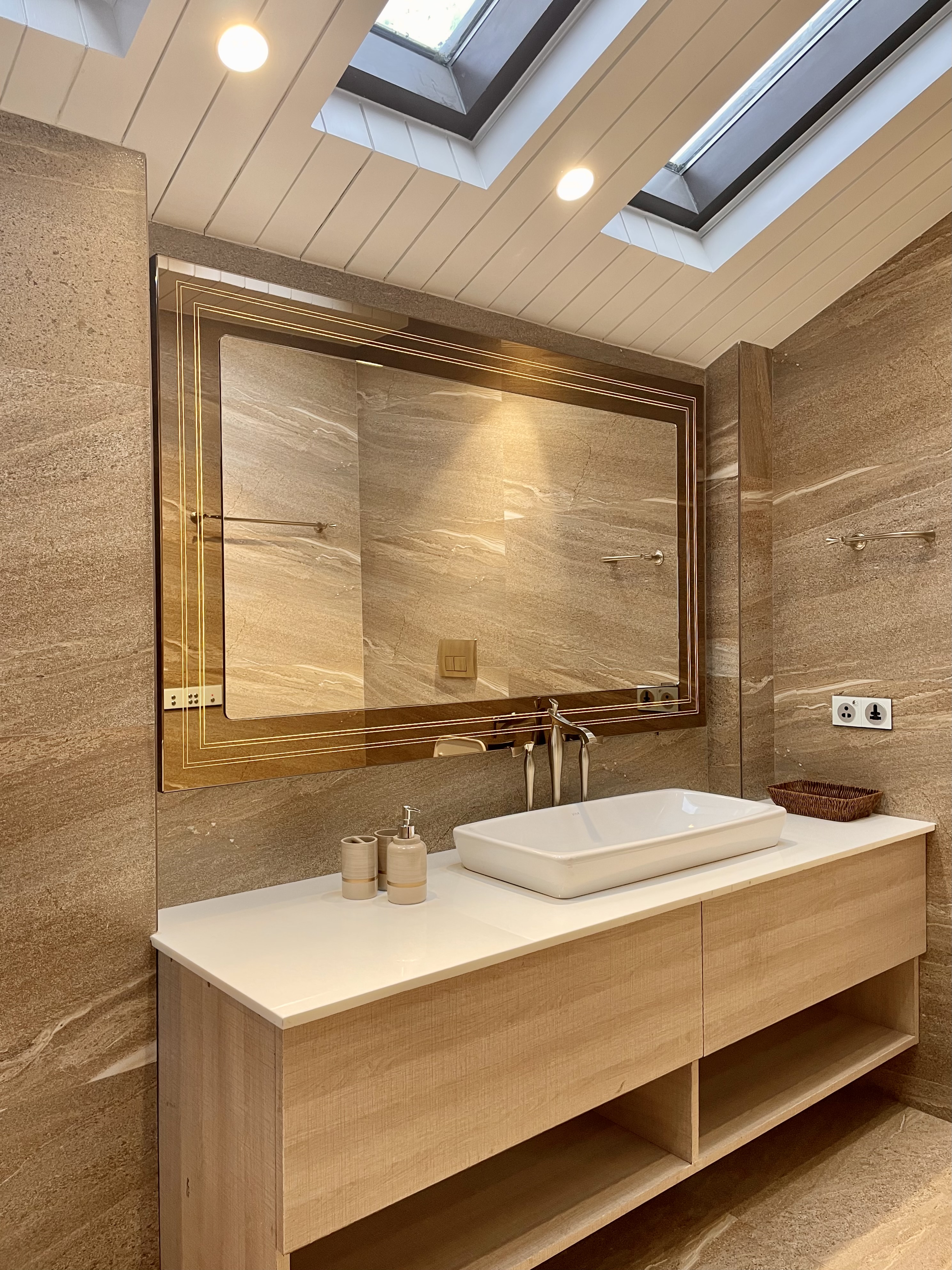 The first floor has 4 bedrooms with walk-in closets and bathrooms and an overlooking family area. The first floor has overlooking spaces and pergolas connecting to windows that create a unique space on the ground floor with landscape. The first floor also leads to a terrace with a green roof through a small series of steps. Multiple levels, overlooking spaces, skylights, natural materials and ample light and ventilation are some key features of this house.