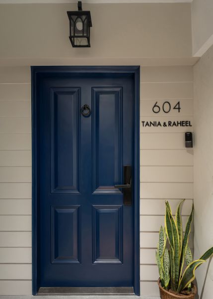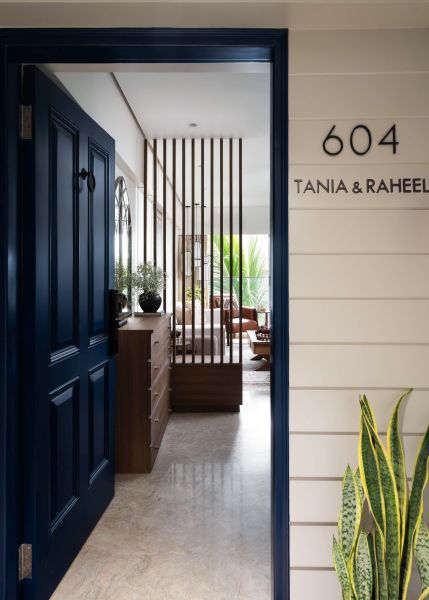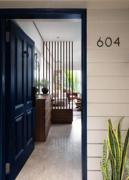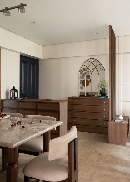 The journey begins with a bold cerulean door, vintage-knobbed and full of promise. Step through and you’re in a space where nostalgia and nuance meet. To the left, a weathered wooden cabinet runs its length, topped by an arched mirror catching fragments of light and movement. To the right, a buffet and slatted wooden screen work in tandem creating a quiet sense of arrival. The screen offers slivers of the home ahead, while the buffet subtly defines the dining.