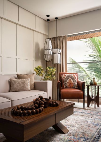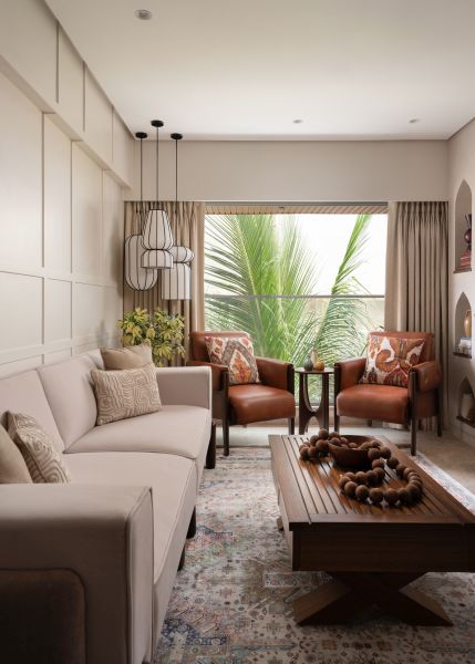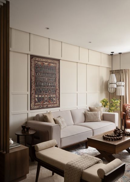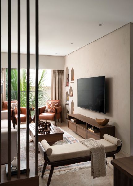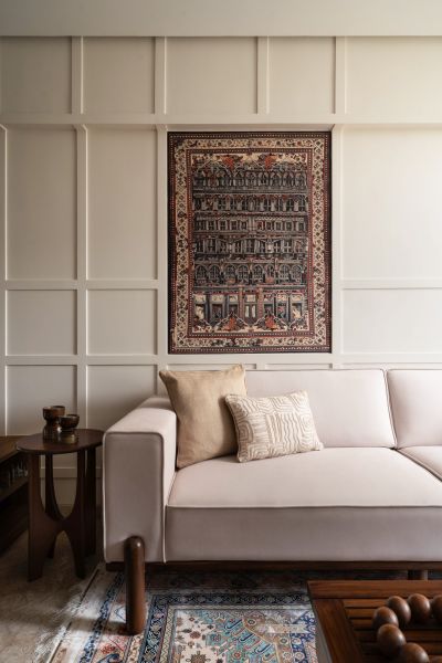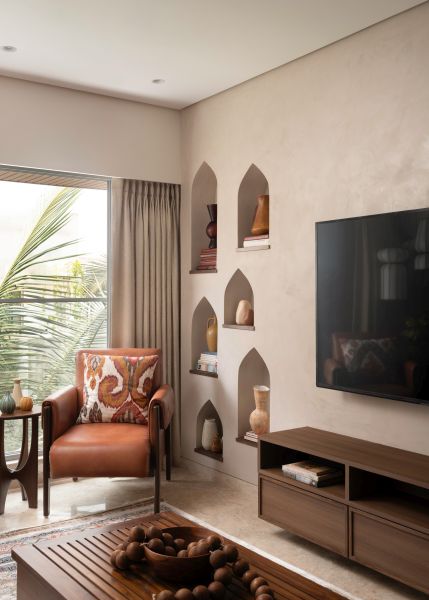 Beyond this veil, the living room reveals itself in hushed, sun-dappled layers.A hand sketch of a Kashmiri building’s facade, delicate and detailed, rests on a cream wall with subtle moulding. Below, a white sofa lounges with ease, its wooden legs peeking like whispered accents. Beside this, two leather chairs sit in tan and teak with curved backs echoing traditional crafts in a modern contour. Across the room, arched niches punctuate a beige wall, each recess holding a vase like a patina of personal history. At the center, a wooden coffee table gathers the room’s rhythm over the room’s muse, a richly textured Persian carpet.