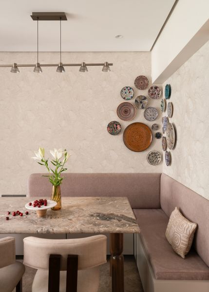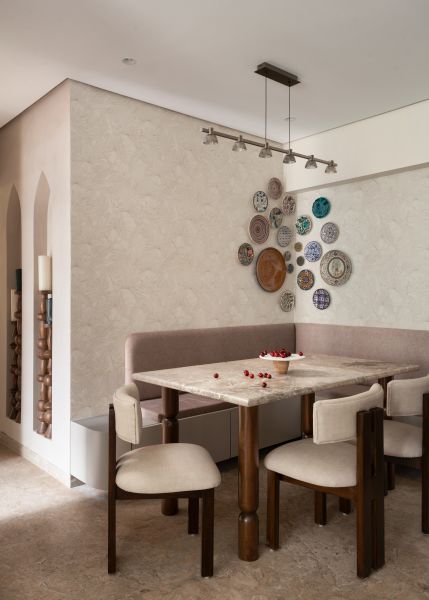 The dining area is nestled into the edge of the room. It’s a pause in the spatial flow. A floating L-shaped banquette, wrapped in soft blush, cradles the corner in comfort, while a marble-topped table and wooden chairs lend an earthy elegance. Behind it, a wallpaper with organic motifs brings a refreshing and natural charm to the space. The walls become storytellers; mounted ceramic plates, each one steeped in memory, chart a map of Tania’s journeys and roots. Some speak of travels; others echo generational legacy. Together, this nook is a gallery of lived experiences.