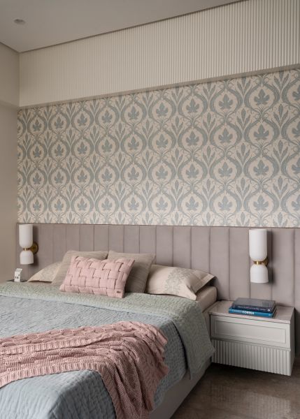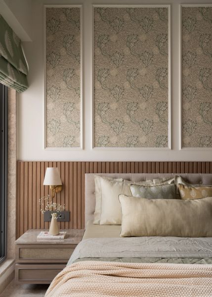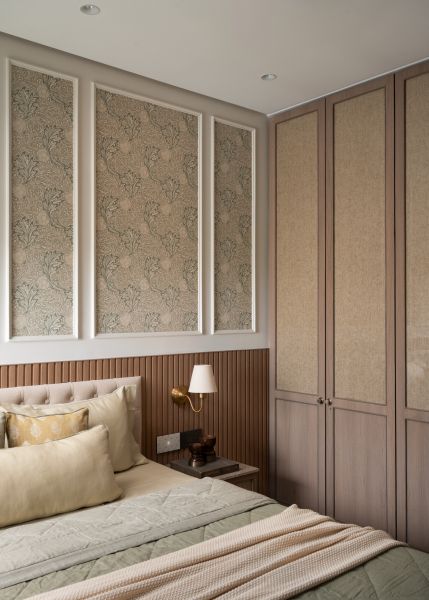 Her daughter’s room hums with a gentle, English charm. Cream and teal tones, classical mouldings, fluted sconces and grooved wood panelling set stage for the bed welcoming quiet rest. A wallpaper by William Morris traces the walls with delicate motifs, setting a poetic tone. On the other side, an open cabinet of books frames a floating niche where she often retreats with a book, surrounded by calm and curiosity. Even the wardrobe, with jute encased in glass, feels like a soft-spoken secret. Every detail is tender and composed, an extension of her personality, curious, thoughtful and quite full of wonder.