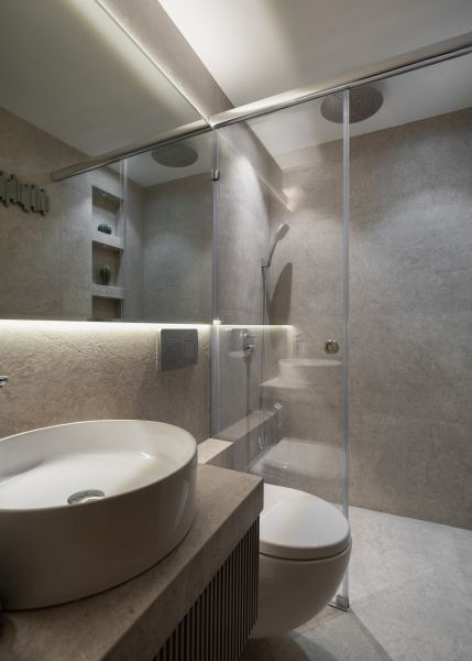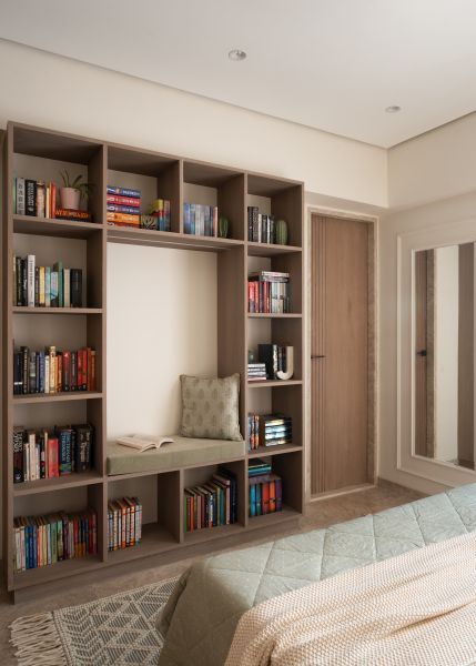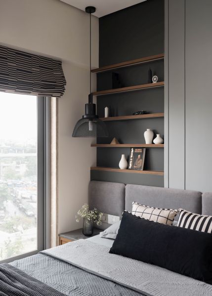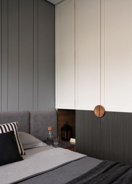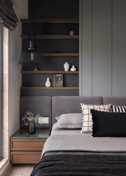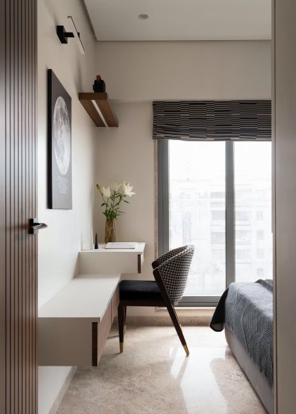 Just like him, the son’s room feels young and modern, with touches hinting at his tech-savvy spirit. Defined by a crisp grey-and-white palette, the space balances energy and ease. Wooden accents add warmth, gently breaking the monochrome and lending a tactile softness to the clean lines. Every element is intentional and layered with personality,playing with details yet composed at heart.