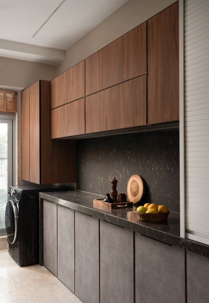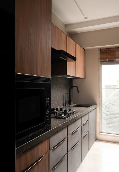 The kitchen unites sharp lines with a refined palette. Walnut overhead and washed grey cabinetry beneath, sit against a noir drama of black marble countertops.