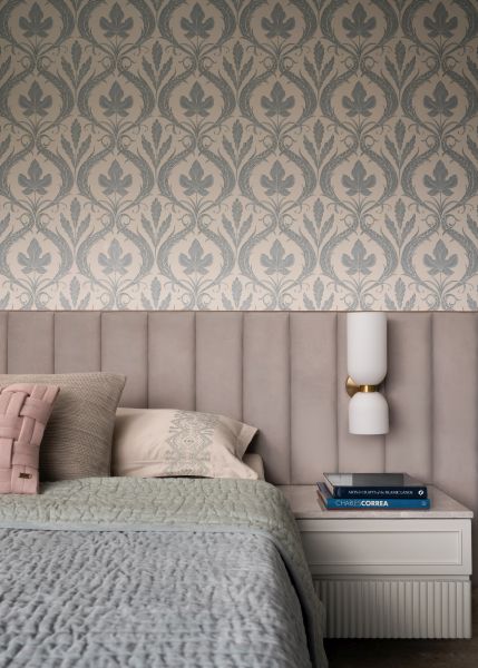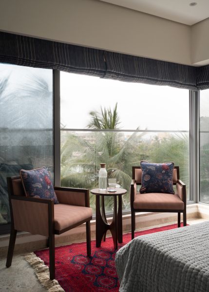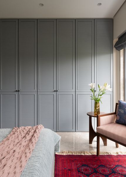 The master bedroom is a quiet crescendo. Facing treetops dancing with skyline silhouettes, two chairs in soft pink perch on a crimson Afghan carpet. Mauve headboard, fluted side tables and floor-to-ceiling soft blue shutters are perfectly placed to greet dawn and dusk. Around it, a cream and teal wallpaper traced with maple leaves echoes familial threads.